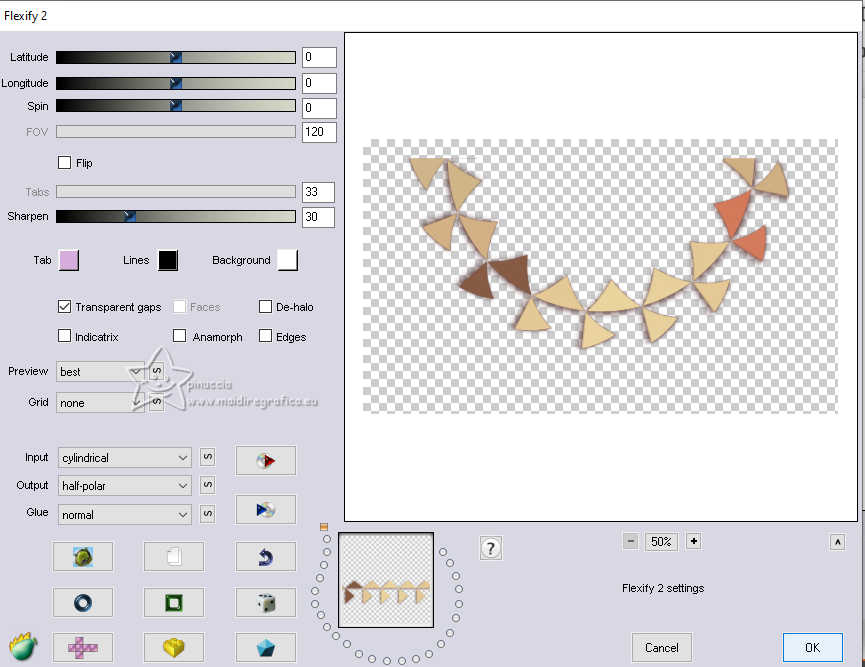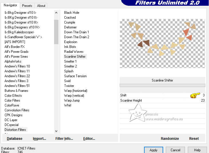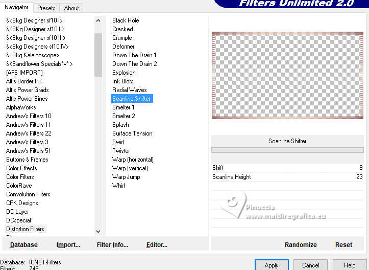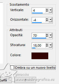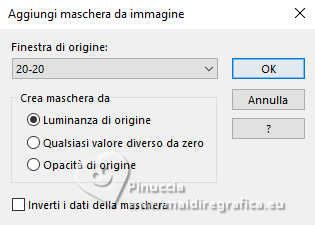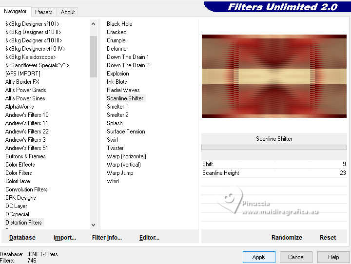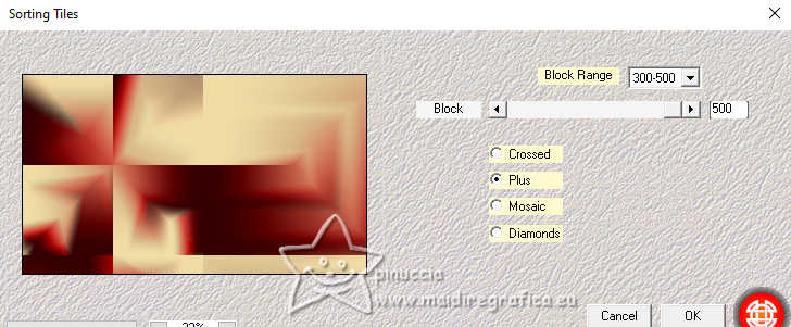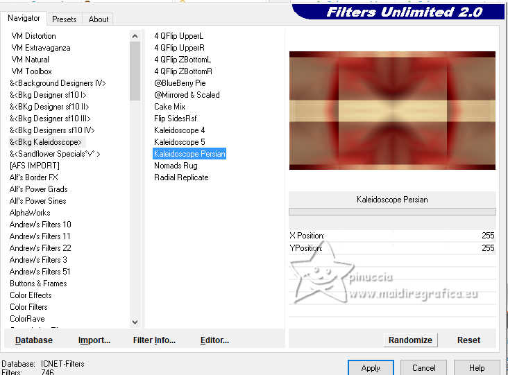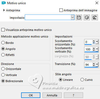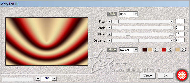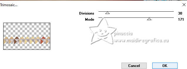 qui puoi trovare qualche risposta ai tuoi dubbi. Se l'argomento che ti interessa non è presente, ti prego di segnalarmelo. Questo tutorial, creato con PSP 2020, è stato tradotto con PSPX9, ma può essere realizzato anche con le altre versioni di PSP. Dalla versione X4, il comando Immagine>Rifletti è stato sostituito con Immagine>Capovolgi in orizzontale, e il comando Immagine>Capovolgi con Immagine>Capovolgi in verticale. Nelle versioni X5 e X6, le funzioni sono state migliorate rendendo disponibile il menu Oggetti. Con la nuova versione X7, sono tornati Rifletti>Capovolgi, ma con nuove varianti. Vedi la scheda sull'argomento qui English Translation qui/here Le vostre versioni qui![]() Occorrente: ![]() Tube: Immagine AI generated pixabay.com Il resto del materiale è di Moi-Même: i suoi tubes sul carnevale qui. (in questa pagina trovi i links ai siti dei creatori del materiale) ![]() se hai problemi con i filtri, consulta la mia sezione filtri qui Filters Unlimited 2.0 qui &<Bkg Kaleidoscope> - Kaleidoscope Persian (da importare in Unlimited) qui VM Toolbox - Trimosaic qui Flaming Pear - Flexify qui Mehdi - Wavy Lab qui Mehdi - Sorting Tiles qui I filtri VM Toolbox si possono usare da soli o importati in Filters Unlimited (come fare vedi qui) Se un filtro fornito appare con questa icona ![]() non esitare a cambiare modalità di miscelatura e opacità secondo i colori utilizzati. ![]() Se hai problemi con il canale alfa, apri una nuova immagine trasparente 950 x 550 pixels, e usa le selezioni da disco. Apri la maschera in PSP e minimizzala con il resto del materiale. Imposta il colore di primo piano con #d9b98b, e il colore di sfondo con #350605. ![]() Terzo colore: #b31411 .1. Apri canal alpha Mascarada Questa immagine, che sarà la base del tuo lavoro non è vuota, ma contiene le selezioni salvate sul canale alfa. Effetti>Plugins>Mehdi - Wavy Lab 1.1. Questo filtro crea gradienti con i colori della paletta; il primo è il colore di sfondo e il secondo quello di primo piano. Cambia gli ultimi due colori creati dal filtro: il terzo con il colore 3 #b31411 e il quarto con il colore di primo piano #d9b98b ![]() Effetti>Plugins>Mehdi - Sorting Tiles. ![]() 2. Livelli>Duplica. Immagine>Rifletti>Rifletti orizzontalmente (Immagine>Rifletti) Immagine>Rifletti>Rifletti verticalmente (Immagine>Capovolgi). Abbassa l'opacità di questo livello al 50%. Livelli>Unisci>Unisci giù. Effetti>Plugins>Filters Unlimited 2.0 - &<Kaleidoscope> - Kaleidoscope Persian. ![]() 3. Selezione>Carica/Salva selezione>Carica selezione da canale alfa. La selezione sélection 1 è subito disponibile. Devi soltanto cliccare Carica. ![]() Selezione>Innalza selezione a livello. Selezione>Deseleziona. Effetti>Effetti di distorsione>Coordinate polari. ![]() Cambia la modalità di miscelatura di questo livello in Luce diffusa. 4. Livelli>Duplica. Immagine>Rifletti>Rifletti verticalmente (Immagine>Capovolgi). Livelli>Unisci>Unisci giù. Effetti>Plugins>VM Toolbox - Trimosaic, con i settaggi standard. ![]() Effetti>Effetti di bordo>Aumenta. Effetti>Effetti di trama>Veneziana. ![]() 5. Attiva il livello di sfondo, Raster 1. Selezione>Carica/Salva selezione>Carica selezione da canale alfa. Carica nuovamente la selezione sélection 1 ![]() Selezione>Innalza selezione a livello. Selezione>Deseleziona. 5. Effetti>Plugins>VM Toolbox - Trimosaic, con i settaggi standard. ![]() Effetti>Effetti 3D>Sfalsa ombra, colore di sfondo. ![]() Effetti>Plugins>Flaming Pear - Flexify 2. ![]() Effetti>Plugins>Filters unlimited 2.0 - Distortion Filters - Scanline Shifter ![]() Tasto K per attivare lo strumento Puntatore ![]() e imposta Posizione X: 88,00 e Posizione Y: 0,00. ![]() Tasto M per deselezionare lo strumento. 6. Attiva il livello Raster 1. Livelli>Nuovo livello raster. Selezione>Carica/Salva selezione>Carica selezione da canale alfa. Apri il menu delle selezioni e carica la selezione sélection 2. ![]() Apri l'immagine del paesaggio (jpg) venice-2225423_1920 ![]() Modifica>Copia. Torna al tuo lavoro e vai a Modifica>Incolla nella selezione. Se usi un misted, questo è facoltativo. Livelli>Nuovo livello maschera>da immagine. Apri il menu sotto la finestra di origine e vedrai la lista dei files aperti. Seleziona la maschera 20-20 ![]() Livelli>Unisci>Unisci gruppo. Selezione>Deseleziona. 7. Attiva il livello Raster 1. Effetti>Plugins>Filters Unlimited 2.0 - Distortion Filters - Scanline Shifter, con i settaggi standard. ![]() Effetti>Effetti di immagine>Motivo unico. ![]() Modifica>Ripeti Motivo unico. 8. Selezione>Seleziona tutto. Selezione>Modifica>Contrai - 20 pixels. Selezione>Inverti. Selezione>Innalza selezione a livello. Regola>Sfocatura>Sfocatura gaussiana - raggio 25. ![]() Effetti>Plugins>Filters unlimited 2.0 - Distortion Filters - Scanline Shifter, con i settaggi precedenti ![]() Effetti>Effetti 3D>Sfalsa ombra, con i settaggi precedenti. Selezione>Deseleziona. Rimani su questo livello. ![]() 9. Modifica>Copia. Modifica>Incolla come nuova immagine, e minimizza questa immagine (ti servirà per i bordi). Torna al tuo lavoro. Apri il tube confettis ![]() Modifica>Copia. Torna al tuo lavoro e vai a Modifica>Incolla come nuovo livello. Oggetti>Allinea>Superiore, o tasto K per attivare lo strumento Puntatore ![]() e imposta Posizione X e Y 0,00 ![]() Tasto M per deselezionare lo strumento. Livelli>Disponi>Porta in alto. 10. Apri il tube guirlandes ![]() Cancella il watermark e vai a Modifica>Copia. Torna al tuo lavoro e vai a Modifica>Incolla come nuovo livello. Tasto K per attivare lo strumento Puntatore ![]() mantieni Posizione X: 9,00 e imposta Posizione Y: 0,00. ![]() Tasto M per deselezionare lo strumento. 11. Apri il tube della donna ai-generated-8403750_1920 ![]() Modifica>Copia. Torna al tuo lavoro e vai a Modifica>Incolla come nuovo livello. Immagine>ridimensiona, al 50%, tutti i livelli non selezionato. Sposta il tube in basso al centro (Oggetti>Allinea>Inferiore).Effetti>Effetti 3D>Sfalsa ombra, colore nero. ![]() Regol