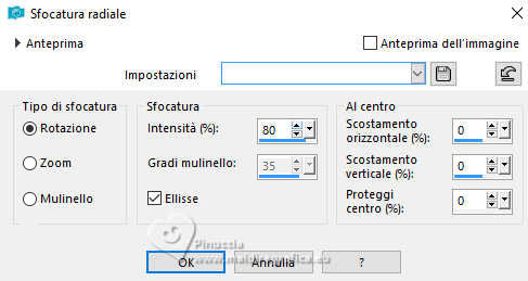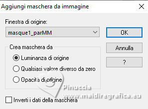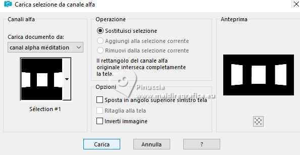 qui puoi trovare qualche risposta ai tuoi dubbi. Se l'argomento che ti interessa non è presente, ti prego di segnalarmelo. Questo tutorial, creato con PSP 2020, è stato tradotto con PSPX9, ma può essere realizzato anche con le altre versioni di PSP. Dalla versione X4, il comando Immagine>Rifletti è stato sostituito con Immagine>Capovolgi in orizzontale, e il comando Immagine>Capovolgi con Immagine>Capovolgi in verticale. Nelle versioni X5 e X6, le funzioni sono state migliorate rendendo disponibile il menu Oggetti. Con la nuova versione X7, sono tornati Rifletti>Capovolgi, ma con nuove varianti. Vedi la scheda sull'argomento qui English Translation qui/here Le vostre versioni qui![]() Occorrente: ![]() Paesaggio: Immagine AI generated pixabay.com Il resto del materiale è di Moi-Même. (in questa pagina trovi i links ai siti dei creatori del materiale) ![]() se hai problemi con i filtri, consulta la mia sezione filtri qui Filters Unlimited 2.0 qui Texturize - Raw Canvas (à importer dans Unlimited) qui Mura's Meister - Perspective Tiling qui Alien Skin Eye Candy 5 Impact - Glass qui AAA Frames - Foto Frame qui ![]() non esitare a cambiare modalità di miscelatura e opacità secondo i colori utilizzati. ![]() Se hai problemi con il canale alfa, apri una nuova immagine trasparente 950 x 550 pixels, e usa la selezione da disco. Apri la maschera in PSP e minimizzala con il resto del materiale. Imposta il colore di primo piano con #fce6cc, e il colore di sfondo con #44413f. ![]() 1. Apri canal alpha Méditation Questa immagine, che sarà la base del tuo lavoro non è vuota, ma contiene una selezione salvata sul canale alfa. Selezione>Seleziona tutto. 2. Apri il paesaggio river-8423899_1920.jpg ![]() Modifica>Copia. Minimizza l'immagine. Torna al tuo lavoro e vai a Modifica>Incolla nella selezione. Selezione>Deseleziona. 3. Regola>Sfocatura>Sfocatura gaussiana - raggio 25. ![]() Regola>Sfocatura>Sfocatura radiale. ![]() Livelli>Duplica. Effetti>Plugins>Filters Unlimited 2.0 - Texturize - Raw Canvas. ![]() Cambia la modalità di miscelatura di questo livello in Sovrapponi. Effetti>Plugins>Mura's Meister - Perspective Tiling. ![]() 4. Apri déco cadres par MM ![]() Modifica>Copia. Torna al tuo lavoro e vai a Modifica>Incolla come nuovo livello. Cambia la modalità di miscelatura di questo livello in Sovrapponi. 5. Attiva il livello sottostante. Livelli>Nuovo livello raster. Selezione>Carica/Salva selezione>Carica selezione da canale alfa. La selezione sélection 1 è subito disponibile. Devi soltanto cliccare Carica. ![]() Attiva nuovamente l'immagine del paesaggio e vai a Modifica>Copia. Torna al tuo lavoro e vai a Modifica>Incolla nella selezione. Effetti>Plugins>Alien Skin Eye Candy 5 Impact - Glass Glass color: #acacac. ![]() Selezione>Deseleziona. Effetti>Effetti 3D>Sfalsa ombra, colore nero. ![]() 6. Attiva il livello superiore. Apri il tube della donna ai-generated-1tub par MM ![]() Cancella il watermark e vai a Modifica>Copia. Torna al tuo lavoro e vai a Modifica>Incolla come nuovo livello. Immagine>Ridimensiona, al 40%, tutti i livelli non selezionato. Tasto K per attivare lo strumento Puntatore ![]() e imposta Posizione X: 309,00 e Posizione Y: 145,00. ![]() Regola>Messa a fuoco>Metti a fuoco. 7. Apri déco_feuilles par MM ![]() Modifica>Copia. Torna al tuo lavoro e vai a Modifica>Incolla come nuovo livello. Imposta Posizione X: 394,00 e Posizione Y: 0,00. ![]() 8. Apri il testo titre par MM ![]() Modifica>Copia. Torna al tuo lavoro e vai a Modifica>Incolla come nuovo livello. Imposta Posizione X: 293,00 e Posizione Y: 69,00. ![]() Cambia la modalità di miscelatura di questo livello in Sovrapponi. 9. Apri déco diffuseur par MM ![]() Modifica>Copia. Torna al tuo lavoro e vai a Modifica>Incolla come nuovo livello. Spostalo in basso a sinistra.Strumento Puntatore ![]() Posizione X: 0,00 e Posizione Y: 1,00. ![]() Tasto M per deselezionare lo strumento. 10. Imposta il colore di primo piano con il colore bianco. Attiva il livello inferiore, Raster 1. Livelli>Nuovo livello raster. Riempi il livello con il colore bianco.Livelli>Nuovo livello maschera>Da immagine Apri il menu sotto la finestra di origine e vedrai la lista dei files aperti. Seleziona la maschera masque1_parMM ![]() Livelli>Duplica. Livelli>Unisci>Unisci gruppo. Cambia la modalità di miscelatura di questo livello in Luce diffusa. 11. Imposta il colore di primo piano con il colore iniziale #fce6cc. Immagine>Aggiungi bordatura, 1 pixel, simmetriche, colore di primo piano. Selezione>Seleziona tutto. Immagine>Aggiungi bordatura, 15 pixels, simmetriche, colore di primo piano. Effetti>Effetti di immagine>Motivo unico, con i settaggi standard. ![]() Selezione>Inverti. Regola>Sfocatura>Sfocatura gaussiana, con i settaggi precedenti. ![]() Effetti>Plugins>Filters Unlimited 2.0 - Texturize - Raw Canvas, con i settaggi standard. ![]() Selezione>Inverti. Effetti>Effetti 3D>Sfalsa ombra, con i settaggi standard. ![]() Selezione>Deseleziona. 12. Immagine>Aggiungi bordatura, 1 pixel, simmetriche, colore di primo piano. Immagine>Aggiungi bordatura, 1 pixel, simmetriche, colore di sfondo. Selezione>Seleziona tutto. 13. Immagine>Aggiungi bordatura, 30 pixels, simmetriche, colore di primo piano. Selezione>Inverti. Effetti>Plugins>AAA Frames - Foto Frame. ![]() Selezione>Deseleziona. 14. Apri déco latérale par MM ![]() Cancella la firma e vai a Modifica>Copia. Torna al tuo lavoro e vai a Modifica>Incolla come nuovo livello. Non spostarlo. 15. Firma il tuo lavoro su un nuovo livello. Aggiungi il watermark dell'autore e del traduttore. 16. Livelli>Unisci>Unisci tutto. Immagine>Ridimensiona, 950 pixels di larghezza, tutti i livelli selezionato. Regola>Messa a fuoco>Maschera di contrasto, Diffuso. ![]() Salva in formato jpg. Per il tube di questo esempio grazie Guismo ![]() ![]() Puoi scrivermi se hai problemi o dubbi, o trovi un link che non funziona, o soltanto per un saluto. |