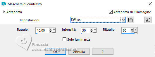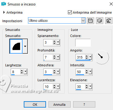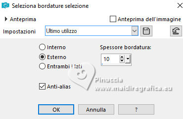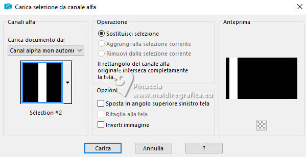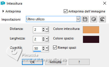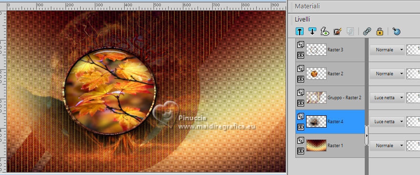 qui puoi trovare qualche risposta ai tuoi dubbi. Se l'argomento che ti interessa non è presente, ti prego di segnalarmelo. Questo tutorial è stato tradotto con PSPX9, ma può essere realizzato anche con le altre versioni di PSP. Dalla versione X4, il comando Immagine>Rifletti è stato sostituito con Immagine>Capovolgi in orizzontale, e il comando Immagine>Capovolgi con Immagine>Capovolgi in verticale. Nelle versioni X5 e X6, le funzioni sono state migliorate rendendo disponibile il menu Oggetti. Con la nuova versione X7, sono tornati Rifletti>Capovolgi, ma con nuove varianti. Vedi la scheda sull'argomento qui English Translation qui/here Le vostre versioni qui![]() Occorrente: ![]() Feuilles de the-night-bird di Deviantart. Per la maschera grazie Narah. Il resto del materiale è di Moi-Même. (in questa pagina trovi i links ai siti dei creatori del materiale) ![]() se hai problemi con i filtri, consulta la mia sezione filtri qui AP [Lines] - Lines SilverLining qui Mehdi - Wavy Lab 1.1 qui Mehdi - Sorting Tiles, Grain natural qui Alien Skin Eye Candy 5 Impact - Glass qui Mura's Meister - Copies qui AAA Frames - Foto Frame qui ![]() non esitare a cambiare modalità di miscelatura e opacità secondo i colori utilizzati. Metti il preset Cliccando sul file una o due volte (a seconda delle tue impostazioni), automaticamente il preset si installerà nella cartella corretta. perché uno o due clic vedi qui ![]() Se hai problemi con il canale alfa, Apri una nuova immagine trasparente 950 x 550 pixels, e usa le selezioni da disco. Colori ![]() Imposta il colore di primo piano con il colore 1 #e59d5d, e il colore di sfondo con il colore 2 #6b2b1f. ![]() 1. Apri canal alpha mon Automne 2 Questa immagine non è vuota, ma contiene le selezioni salvata sul canale alfa. Effetti>Plugins>Mehdi - Wavy Lab 1.1. Questo filtro crea gradienti con i colori della paletta: il primo è il colore di sfondo e il secondo quello di primo piano. Cambia gli ultimi due colori creati dal filtro: il terzo con il colore 3 #2e111a e il quarto con il colore 4 #cfc88a. ![]() Effetti>Plugins>Mehdi - Grain Natural 2.0 - Basic Grain ![]() Effetti>Plugins>Mehdi - Sorting Tiles. ![]() 2. Livelli>Nuovo livello raster. Riempi il livello con il colore di sfondo.Livelli>Nuovo livello maschera>Da immagine. Apri il menu sotto la finestra di origine e vedrai la lista dei files aperti. Seleziona la maschera NarahsMasks_1772 ![]() Livelli>Duplica. Livelli>Unisci>Unisci gruppo. Cambia la modalità di miscelatura di questo livello in Luce netta. Effetti>Plugins>AP [Lines] - Lines SilverLining - Dotty Lines ![]() Effetti>Effetti di trama>Intessitura colore intessitura: colore di primo piano, colore spazio: colore 3 #2e111a. ![]() 3. Selezione>Carica/Salva selezione>Carica selezione da canale alfa. La selezione sélection 1 è subito disponibile. Devi soltanto cliccare Carica. ![]() Premi sulla tastiera il tasto CANC ![]() Mantieni selezionato. 4. Livelli>Nuovo livello raster. Apri 201326_poster_1 ![]() Modifica>Copia. Torna al tuo lavoro e vai a Modifica>Incolla nella selezione. Se non puoi realizzare il prossimo effetto, trovi nel materiale - cartella mes décos il file déco glass, da copiare/incollare come nuovo livello Effetti>Plugins>Alien Skin Eye Candy 5 Impact - Glass. Seleziona il preset Mon Automne 2 ![]() Mantieni ancora selezionato. 5. Livelli>Nuovo livello raster. Selezione>Modifica>Seleziona bordature selezione. ![]() Ripeti i tre effetti Mehdi: Effetti>Plugins>Mehdi - Wavy Lab 1.1. Effetti>Plugins>Mehdi - Grain Natural 2.0 - Basic Grain Effetti>Plugins>Mehdi - Sorting Tiles. Effetti>Plugins>Alien Skin Eye Candy Impact - Glass - preset Mon automne 2 Effetti>Effetti 3D>Smusso a incasso. ![]() Selezione>Deseleziona. Effetti>Effetti 3D>Sfalsa ombra, colore nero. ![]() 6. Livelli>Unisci>Unisci giù. Livelli>Duplica. Immagine>Ridimensiona, al 50%, tutti i livelli non selezionato. Effetti>Plugins>Mura's Meister - Copies. ![]() Modifica>Taglia Modifica>Incolla come nuova immagine e minimizza l'immagine (se vuoi, salva l'immagine in formato png prima di minimizzarla). Torna al tuo lavoro ed elimina il livello rimasto vuoto (tasto destro e Elimina). 7. Attiva il livello della maschera, Gruppo-Raster 2. Apri il tube misted arbre-13_par MM ![]() Modifica>Copia. Torna al tuo lavoro e vai a Modifica>Incolla come nuovo livello. Cambia la modalità di miscelatura di questo livello in Luce netta. Oggetti>Allinea>Sinistra (secondo il tuo tube, adatta la posizione). Livelli>Disponi>Sposta giù (non si vede tutto ma è normale). ![]() 8. Attiva il livello superiore. Apri il tube della donna Femme Automne2_IA_par MM ![]() Modifica>Copia. Torna al tuo lavoro e vai a Modifica>Incolla come nuovo livello. Immagine>Ridimensiona, al 55%, tutti i livelli non selezionato. Regola>Messa a fuoco>Metti a fuoco. Effetti>Effetti 3D>Sfalsa ombra, colore nero (o secondo il tuo tube). ![]() Tasto K per attivare lo strumento Puntatore ![]() e imposta Posizione x: 601,00 e Posizione Y: 10,00, o secondo il tuo tube. ![]() Tasto M per deselezionare lo strumento. Rimani su questo livello. 9. Livelli>Duplica. Attiva il livello sottostante dell'originale. Regola>Sfocatura>Sfocatura gaussiana - raggio 15. ![]() Cambia la modalità di miscelatura di questo livello in Filtra. 10. Attiva il livello inferiore, Raster 1. Selezione>Carica/Salva selezione>Carica selezione da canale alfa. Apri il menu delle selezioni e carica la selezione sélection 2 ![]() Selezione>Innalza selezione a livello. Mantieni selezionato. 11. Livelli>Disponi>Porta in alto. Regola>Sfocatura>Sfocatura gaussiana - raggio 15. ![]() Effetti>Plugins>Mehdi - Grain Natural 2.0, con i settaggi precedenti. Mantieni ancora selezionato. 12. Selezione>Modifica>Contrai - 10 pixels. Premi sulla tastiera il tasto CANC ![]() Riempi la selezione con il colore di primo piano.Selezione>Modifica>Contrai - 2 pixels. Riempi la selezione con il colore di sfondo.Selezione>Modifica>Contrai - 2 pixels. Premi sulla tastiera il t