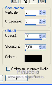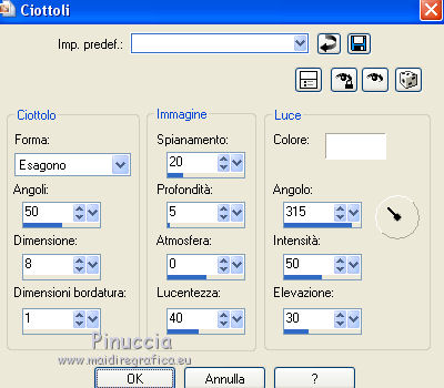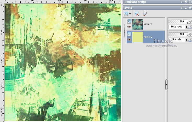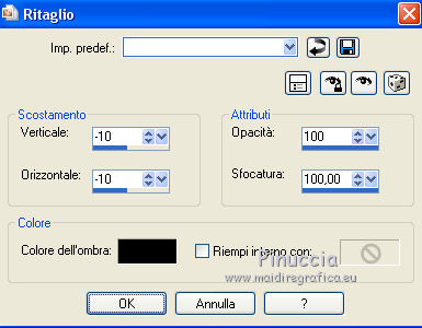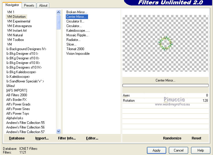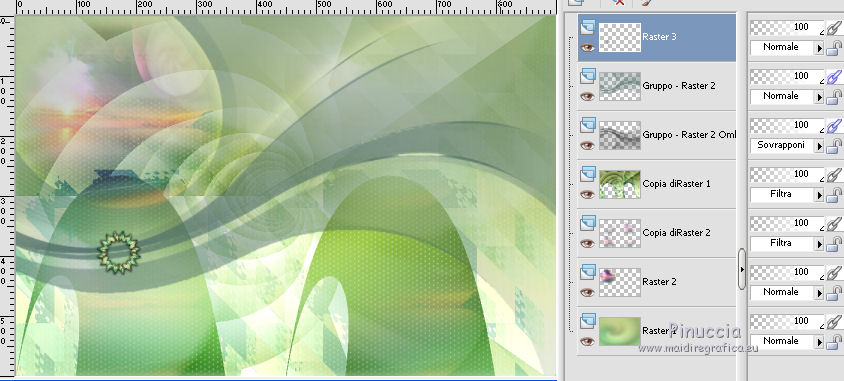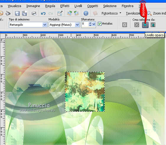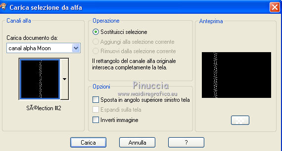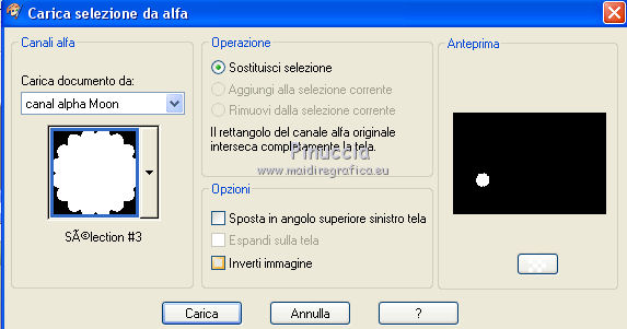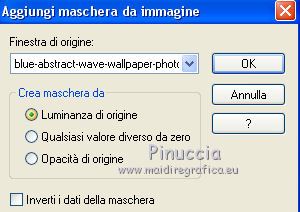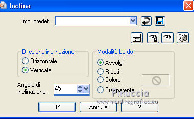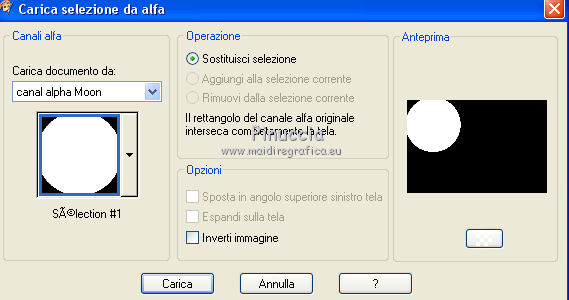 qui puoi trovare qualche risposta ai tuoi dubbi. Se l'argomento che ti interessa non è presente, ti prego di segnalarmelo. Questo tutorial è stato realizzato con Corel2020 e tradotto con CorelX7, ma può essere realizzato anche con le altre versioni di PSP. Dalla versione X4, il comando Immagine>Rifletti è stato sostituito con Immagine>Capovolgi in orizzontale, e il comando Immagine>Capovolgi con Immagine>Capovolgi in verticale. Nelle versioni X5 e X6, le funzioni sono state migliorate rendendo disponibile il menu Oggetti. Con la nuova versione X7, sono tornati Rifletti>Capovolgi, ma con nuove varianti. Vedi la scheda sull'argomento qui Occorrente: Materiale qui Per i tubes grazie Nicole e LisaT. Il resto del materiale è di Moi-Même Se hai problemi con il canale alfa, puoi usare le selezioni fornite, da mettere nella cartella Selezioni. (in questa pagina trovi i links ai siti dei creatori del materiale) Filtri: se hai problemi con i filtri, consulta la mia sezione filtri qui Filters Unlimited 2.0 qui Kang 1 - new Facets qui VM Distortion - Center Mirror qui Alien Skin Eye Candy 5 Impact - Glass qui I filtri Kang e VM Distortion si possono usare da soli o importati in Filters Unlimited (come fare vedi qui) Se un filtro fornito appare con questa icona ![]() non esitare a cambiare modalità di miscelatura e opacità secondo i colori utilizzati. Imposta il colore di primo piano con #e0ea92, e il colore di sfondo con il colore #516f69. ![]() 1. Preparazione importante Apri l'immagine s-l225 e lavora su questa immagine. Livelli>Innalza livello di sfondo. Cambia la modalità di miscelatura di questo livello in Luce netta. Livelli>Nuovo livello raster. Livelli>Disponi>Sposta giù. Riempi con il colore di primo piano.![]() Livelli>Unisci>Unisci visibile. Modifica>Copia e minimizza l'immagine (eventualmente, per precauzione, salva in formato jpg) 2. Apri canal alpha_moon. Finestra>Duplica o sulla tastiera maiuscola+D per fare una copia. ![]() Chiudi l'originale. La copia, che sarà la base del tuo lavoro, non è vuota, ma contiene le selezioni salvate sul canale alfa (la selezione #4 non sarà utilizzata). Selezione>Seleziona tutto. Modifica>Incolla nella selezione. Selezione>Deseleziona. Regola>Sfocatura>Sfocatura radiale. ![]() 3. Livelli>Duplica. Effetti>Effetti geometrici>Cerchio. ![]() Effetti>Effetti geometrici>Inclina. ![]() Effetti>Effetti di distorsione>Coordinate polari. ![]() Cambia la modalità di miscelatura di questo livello in Filtra (o altro) 4. Effetti>Plugins>Filters Unlimited 2.0 - Kang 1 - New Facets, con i settaggi standard. ![]() Regola>Messa a fuoco>Metti a fuoco. 5. Livelli>Nuovo livello raster. Riempi con il colore di sfondo(o con il colore di primo piano, secondo i tuoi colori) Apri l'immagine blue-abstract-wave-wallpaper-photoshop-backgrounds (modificata in png) e minimizzala. Torna al tuo lavoro. Livelli>Nuovo livello maschera>Da immagine. Apri il menu sotto la finestra di origine e vedrai la lista dei files aperti. Seleziona l'immagine ![]() Livelli>Unisci>Unisci gruppo. Effetti>Effetti 3D>Sfalsa ombra, colore nero, ombra su nuovo livello selezionato. ![]() Rimani posizionato sul livello dell'ombra. 6. Immagine>Capovolgi. Effetti>Effetti di trama>Ciottoli. ![]() Cambia la modalità di miscelatura di questo livello in Sovrapponi. ![]() 7. Attiva il livello di sfondo, Raster 1. Regola>Sfocatura>Sfocatura gaussiana, raggio 25. ![]() 8. Livelli>Nuovo livello raster. Selezione>Carica/Salva selezione>Carica selezione da canale alfa. La selezione #1 è subito disponibile. Devi soltanto cliccare Carica. ![]() Apri il tube del paesaggio, cancella il watermark, e vai a Modifica>Copia. Torna al tuo lavoro e vai a Modifica>Incolla nella selezione. Livelli>Duplica. Livelli>Unisci>Unisci giù (o secondo il tuo misted). Selezione>Deseleziona. 9. Livelli>Duplica. Effetti>Effetti di immagine>Motivo unico. ![]() Cambia la modalità di miscelatura di questo livello in Filtra. Effetti>Effetti di immagine>Motivo unico, con i settaggi standard. ![]() 10. Attiva il livello superiore. Attiva l'immagine che hai minimizzato prima di cominciare e vai a Modifica>Copia. Torna al tuo lavoro e vai a Modifica>Incolla come nuovo livello. ![]() Attiva lo strumento Selezione ![]() e clicca su Livello opaco, e avrai l'immagine selezionata ![]() Selezione>Modifica>Contrai - 40 pixels. Premi sulla tastiera il tasto CANC ![]() Selezione>Deseleziona. 11. Immagine>Ridimensiona, al 50%, tutti i livelli non selezionato. Effetti>Plugins>Filters Unlimited 2.0 - VM Distortion - Center Mirror, con i settaggi standard. ![]() Effetti>Plugins>Alien Skin Eye Candy 5 Impact - Glass. Seleziona il preset Clear e ok. ![]() 12. Immagine>Ridimensiona, al 50%, tutti i livelli non selezionato. Tasto K sulla tastiera per attivare lo strumento Puntatore ![]() e imposta Posizione X: 132,00 e Posizione Y: 356,00. ![]() Tasto M per deselezionare lo strumento Effetti>Effetti 3D>Sfalsa ombra, colore nero, non dimenticare di deselezionare ombra su nuovo livello. ![]() Dovresti avere questo ![]() 13. Livelli>Nuovo livello raster. Selezione>Carica/Salva selezione>Carica selezione da canale alfa. Apri il menu delle selezioni e carica la selezione #2. ![]() Modifica>Incolla nella selezione (l'immagine iniziale è sempre in memoria). Effetti>Plugins>Alien Skin Eye Candy 5 Impact - Glass - preset Clear. Selezione>Deseleziona. Livelli>Disponi>Sposta giù. 14. Livelli>Nuovo livello raster. Selezione>Carica/Salva selezione>Carica selezione da canale alfa. Apri il menu delle selezioni e carica la selezione #3. ![]() Riempi la selezione con il colore di sfondo.Effetti>Plugins>Alien Skin Eye Candy 5 Impact - Glass - preset Clear. Selezione>Deseleziona. 15. Attiva il livello superiore. Livelli>Unisci>Unisci giù - 2 volte. Effetti>Effetti 3D>Sfalsa ombra, con i settaggi precedenti. Tasto K per attivare lo strumento Puntatore ![]() e imposta Posizione X: 14,00 (Posizione Y è corretta: 0,00). ![]() Effetti>Effetti 3D>Sfalsa ombra, con i settag