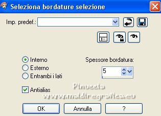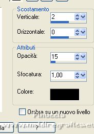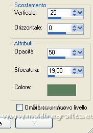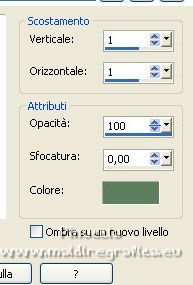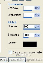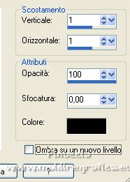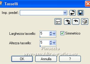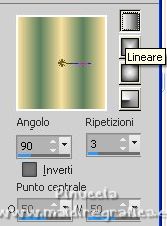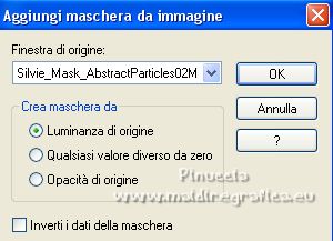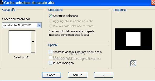 qui puoi trovare qualche risposta ai tuoi dubbi. Se l'argomento che ti interessa non è presente, ti prego di segnalarmelo. Questo tutorial è stato realizzato con Corel2019 e tradotto con CorelX7, ma può essere realizzato anche con le altre versioni di PSP. Dalla versione X4, il comando Immagine>Rifletti è stato sostituito con Immagine>Capovolgi in orizzontale, e il comando Immagine>Capovolgi con Immagine>Capovolgi in verticale. Nelle versioni X5 e X6, le funzioni sono state migliorate rendendo disponibile il menu Oggetti. Con la nuova versione X7, sono tornati Rifletti>Capovolgi, ma con nuove varianti. Vedi la scheda sull'argomento qui Traduzione inglese qui![]() Occorrente: ![]() Grazie per i tubes e la maschera Isa, Silvie, Krys, Guismo. Altri tubes dalla rete. Wordart e accessori di Moi-Même (in questa pagina trovi i links ai siti dei creatori del materiale) ![]() se hai problemi con i filtri, consulta la mia sezione filtri qui Filters Unlimited 2.0 qui &<Bkg Designer sf10I> - Cruncher (da importare in Unlimited) qui Alien Skin Eye Candy 5 Texture - Texture Noise qui Alien Skin Eye Candy 5 Impact - Glass qui Mura's Meister - Perspective Tiling qui Mehdi - Sorting Tiles qui Distortion Filters Scanlines Shifter qui I filtri Distortion si possono usare da soli o importati in Filters Unlimited (come fare vedi qui) Se un filtro fornito appare con questa icona ![]() non esitare a cambiare modalità di miscelatura e opacità secondo i colori utilizzati. ![]() Nelle ultime versioni di PSP non c'é il gradiente di primo piano/sfondo (Corel_06_029) Puoi usare i gradienti delle versioni precedenti. Trovi qui i gradienti Corel X. Apri la maschera in PSP e minimizzala con il resto del materiale. Se hai problemi con il canale alfa, apri una nuova immagine trasparente 950 x 550 pixels, e usa le selezioni da disco. 1. Imposta il colore di primo piano con #f9e09e, e il colore di sfondo con #5c7f5e. ![]() Passa il colore di primo piano a Gradiente di primo piano/sfondo, stile Lineare. ![]() 2. Apri canal alpha Noël 2022 Questa immagine, che sarà la base del tuo lavoro, non è vuota, ma contiene una selezione salvata sul canale alfa. Riempi l'immagine trasparente con il gradiente.Regola>Aggiungi/Rimuovi disturbo>Aggiungi disturbo. ![]() Effetti>Plugins>Alien Skin Eye Candy 5 Textures - Texture Noise, seleziona il preset Snowfall ![]() 3. Livelli>Duplica. Effetti>Plugins>Mehdi - Sorting Tiles. ![]() Effetti>Plugins>Mura's Meister - Perspective Tiling. ![]() 4. Livelli>Duplica. Immagine>Rifletti. Immagine>Capovolgi. Livelli>Unisci>Unisci giù. 5. Livelli>Duplica. Immagine>Ruota per gradi - 90 gradi a destra. ![]() Livelli>Unisci>Unisci giù. Effetti>Plugins>Filters Unlimited 2.0 - Distortion Filters - Scanlines Shifter, con i settaggi standard ![]() Effetti>Plugins>Filters Unlimited 2.0 - &<Bkg Designer sf10I> - Cruncher, con i settaggi standard ![]() Effetti>Effetti di bordo>Aumenta. Effetti>Effetti 3D>Sfalsa ombra, colore di sfondo. ![]() Effetti>Plugins>Filters Unlimited 2.0 - Distortion Filters - Scanlines Shifter, con i settaggi precedenti. ![]() 6. Attiva il livello inferiore. Selezione>Seleziona tutto. Immagine>Ritaglia la selezione. 7. Livelli>Nuovo livello raster. Selezione>Carica/Salva selezione>Carica selezione da canale alfa. La selezione sélection #1 è subito disponibile. Devi soltanto cliccare Carica. ![]() Apri il tube del paesaggio Winter_Scenic418_misted_Silvie ![]() Modifica>Copia. Torna al tuo lavoro e vai a Modifica>Incolla nella selezione. Effetti>Effetti di immagine>Motivo unico, fianco a fianco. ![]() Selezione>Inverti. Effetti>Effetti di distorsione>Tasselli. ![]() Regola>Messa a fuoco>Metti a fuoco. Cambia la modalità di miscelatura di questo livello in Sovrapponi. Selezione>Inverti. Selezione>Innalza selezione a livello. Livelli>Nuovo livello raster. Selezione>Modifica>Seleziona bordature selezione. ![]() Riempi la selezione con il gradiente.Selezione>Deseleziona. Effetti>Effetti di immagine>Motivo unico, con i settaggi precedenti. ![]() Regola>Messa a fuoco>Metti a fuoco. Livelli>Disponi>Porta in alto. Livelli>Duplica. Livelli>Unisci>Unisci giù. Effetti>Effetti 3D>Sfalsa ombra, colore nero. ![]() 8. Apri il tube ma déco centre ![]() Cancella la firma e vai a Modifica>Copia. Torna al tuo lavoro e vai a Modifica>Incolla come nuovo livello. Tasto K per attivare lo strumento Puntatore ![]() e imposta Posizione X: 289,00 e Posizione Y: 77,00. ![]() Tasto M per deselezionare lo strumento. Effetti>Effetti 3D>Sfalsa ombra, colore di sfondo. ![]() 9. Attiva il livello sottostante. Apri déco 1 ![]() Modifica>Copia. Torna al tuo lavoro e vai a Modifica>Incolla come nuovo livello. Spostalo in basso(Oggetti>Allinea>Inferiore) Regola>Messa a fuoco>Metti a fuoco. Effetti>Effetti 3D>Sfalsa ombra, colore di sfondo. ![]() 10. Attiva il livello superiore. Apri il tube del personaggio ![]() Cancella la firma e vai a Modifica>Copia. Torna al tuo lavoro e vai a Modifica>Incolla come nuovo livello. Immagine>Ridimensiona, al 70%, tutti i livelli non selezionato. Tasto K per attivare lo strumento Puntatore ![]() e imposta Posizione X: 604,00 e Posizione Y: 103,00. ![]() Tasto M per deselezionare lo strumento. Livelli>Duplica. Attiva il livello sottostante dell'originale. Regola>Sfocatura>Sfocatura gaussiana - raggio 15. ![]() Cambia la modalità di miscelatura di questo livello in Moltiplica. 11. Imposta il colore di primo piano con il colore bianco. Livelli>Nuovo livello raster. Riempi il livello con il colore bianco.Livelli>Nuovo livello maschera>Da immagine Apri il menu sotto la finestra di origine e vedrai la lista dei files aperti. Seleziona la maschera Silvie_Mask_AbstractParticles02M ![]() Livelli>Unisci>Unisci gruppo. Effetti>Effetti 3D>Sfalsa ombra, con i settaggi precedenti. 12. Apri déco 2 ![]() Modifica>Copia. Torna al tuo lavoro e vai a Modifica>Incolla come nuovo livello. Strumento Puntatore ![]() lascia Posizione X: 258,00 e imposta Posizione Y: 416,00. ![]() Effetti>Effetti