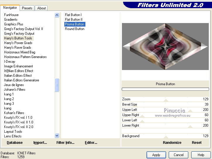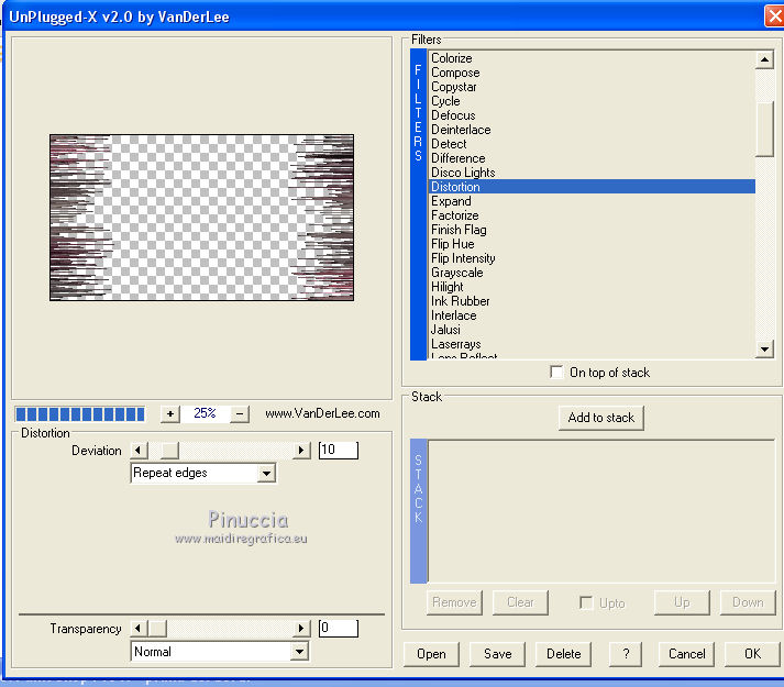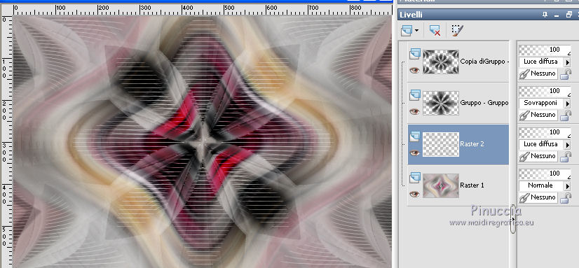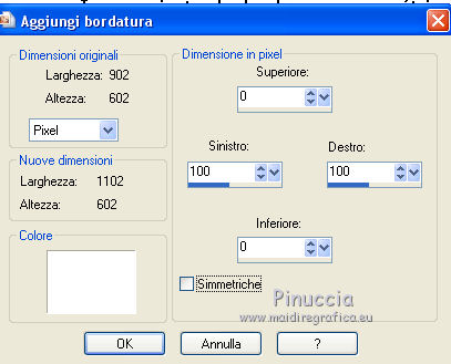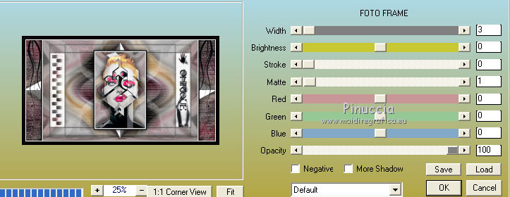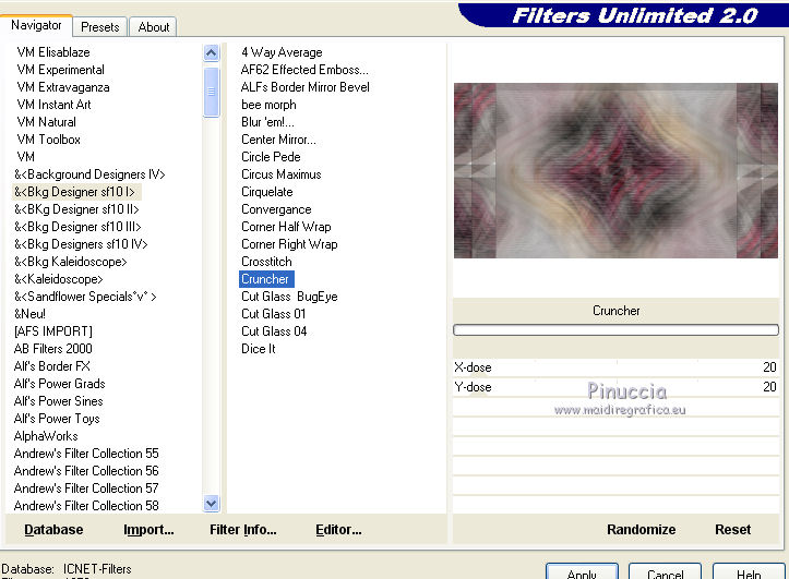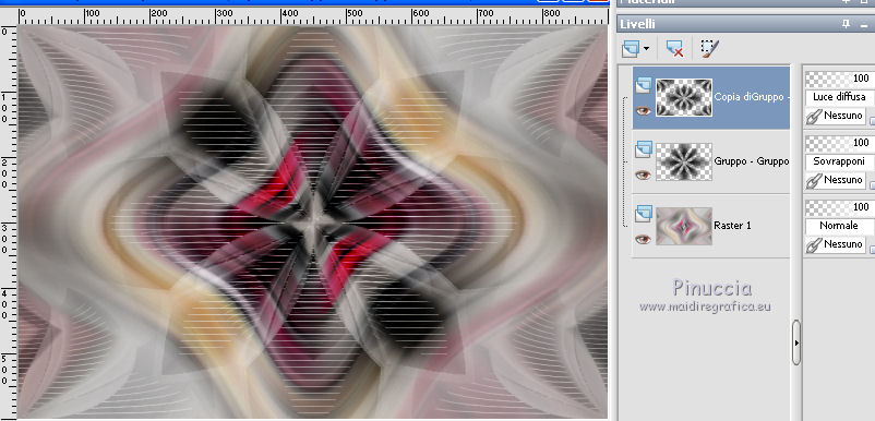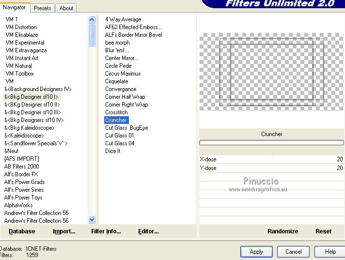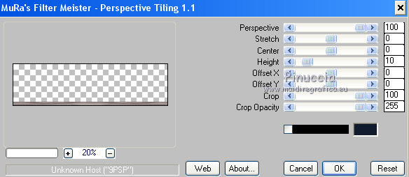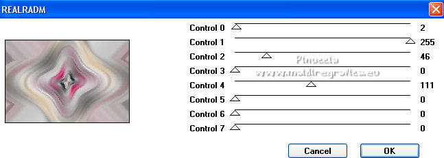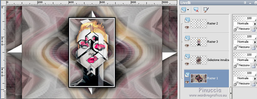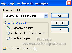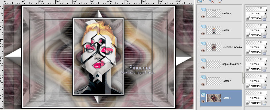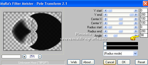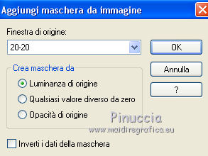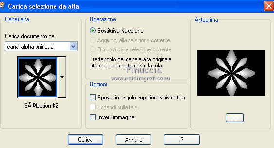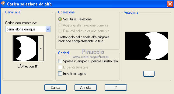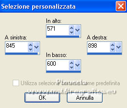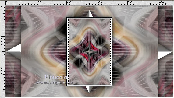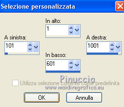 qui puoi trovare qualche risposta ai tuoi dubbi. Se l'argomento che ti interessa non è presente, ti prego di segnalarmelo. Questo tutorial è stato realizzato con Corel2020 e tradotto con CorelX, ma può essere realizzato anche con le altre versioni di PSP. Dalla versione X4, il comando Immagine>Rifletti è stato sostituito con Immagine>Capovolgi in orizzontale, e il comando Immagine>Capovolgi con Immagine>Capovolgi in verticale. Nelle versioni X5 e X6, le funzioni sono state migliorate rendendo disponibile il menu Oggetti. Con la nuova versione X7, sono tornati Rifletti>Capovolgi, ma con nuove varianti. Vedi la scheda sull'argomento qui Occorrente: Materiale qui Per il tube e la maschera grazie Guismo e Nikita. Il resto del materiale è di Moi-Même. (in questa pagina trovi i links ai siti dei creatori del materiale) Filtri: se hai problemi con i filtri, consulta la mia sezione filtri qui Filters Unlimited 2.0 qui &<Bkg Designer sf10I> - Center Mirror, Cruncher (da importare in Unlimited) qui Sybia - Realradm qui Mura's Meister - Pole Transform qui Mura's Meister - Perspective Tiling qui Flaming Pear - Flexify 2 qui AP [Lines] - Lines SilverLining qui Harry's Button Tools qui VanDerLee - Unplugged-X qui AAA Frames - Foto Frame qui I filtri Sybia e Harry's Button si possono usare da soli o importati in Filters Unlimited (come fare vedi qui) Se un filtro fornito appare con questa icona ![]() non esitare a cambiare modalità di miscelatura e opacità secondo i colori utilizzati. Metti la selezione onirique 3 nella cartella Selezioni. Apri le maschere in PSP e minimizzale con il resto del materiale. Ricordati di cancellare il watermark prima di copiare i tubes, e di non salvare le modifiche quando li chiudi. Imposta il colore di primo piano con il colore bianco, e il colore di sfondo con il colore nero. ![]() 1. Apri canal alpha Onirique (dimensione 900 x 600 pixels) Finestra>Duplica o sulla tastiera maiuscola+D per fare una copia. ![]() Chiudi l'originale. La copia, che sarà la base del tuo lavoro, non è vuota, ma contiene le selezioni salvate sul canale alfa. (nel materiale trovi le selezioni da salvare "da disco", in caso di problemi con il canale alfa) 2. Selezione>Seleziona tutto. Apri il tube principale e vai a Modifica>Copia. Minimizza il tube. Torna al tuo lavoro e vai a Modifica>Incolla nella selezione. Selezione>Deseleziona. Effetti>Effetti di immagine>Motivo unico, con i settaggi standard. ![]() Regola>Sfocatura>Sfocatura radiale. ![]() Livelli>Unisci>Unisci tutto. 3. Livelli>Innalza livello di sfondo. 4. Effetti>Plugins>Sybia - Realradm, con i settaggi standard. ![]() 5. Livelli>Nuovo livello raster. Riempi il livello con il colore nero di sfondo.Livelli>Nuovo livello maschera>Da immagine. Apri il menu sotto la finestra di origine e vedrai la lista dei files aperti. Seleziona la maschera 1250182158_nikita_masque. ![]() Effetti>Effetti di bordo>Aumenta. Livelli>Unisci>Unisci gruppo. 6. Per cancellare la firma della maschera: Attiva lo strumento Selezione ![]() (non importa il tipo di selezione impostato, perchè con la selezione personalizzata si ottiene sempre un rettangolo) clicca sull'icona Selezione personalizzata ![]() e imposta i seguenti settaggi. ![]() Premi sulla tastiera il tasto CANC ![]() Selezione>Deseleziona. Effetti>EFfetti di riflesso>Specchio rotante. ![]() Effetti>Plugins>Mura's Meister - Pole Transform. ![]() 7. Selezione>Carica/Salva selezione>Carica selezione da canale alfa. La selezione #1 è subito disponibile. Devi soltanto cliccare Carica. ![]() Livelli>Nuovo livello maschera>Da immagine. Apri il menu sotto la finestra di origine e seleziona la maschera 20-20. ![]() Livelli>Unisci>Unisci gruppo. Selezione>Deseleziona. Effetti>Plugins>Filters Unlimited 2.0 - &<Bkg Designer sf10I> - Center Mirror, con i settaggi standard ![]() Selezione>Carica/Salva selezione>Carica selezione da canale alfa. Apri il menu delle selezioni e carica la selezione #2. ![]() Effetti>Plugins>AP [Lines] - Lines SilverLining. ![]() Selezione>Deseleziona. Cambia la modalità di miscelatura di questo livello in Sovrapponi. 8. Livelli>Duplica. Effetti>Plugins>Flaming Pear - Flexify 2 ![]() Effetti>Effetti di immagine>Motivo unico, con i settaggi standard. ![]() Cambia la modalità di miscelatura di questo livello in Luce diffusa. Regola>Messa a fuoco>Metti a fuoco. ![]() 9. Attiva il livello raster 1. Apri il tube déco 1 e vai a Modifica>Copia. Torna al tuo lavoro e vai a Modifica>Incolla come nuovo livello. Cambia la modalità di miscelatura di questo livello in Luce diffusa. ![]() 10. Immagine>Aggiungi bordatura, 1 pixel, simmetriche, colore nero. Selezione>Seleziona tutto. Immagine>Aggiungi bordatura, simmetriche non selezionato, colore bianco. ![]() Effetti>Effetti di immagine>Motivo unico, con i settaggi standard. ![]() Selezione>Inverti. Effetti>Plugins>Filters Unlimited 2.0 - Harry's Button Tools - Prisma Button, con i settaggi standard. ![]() Ripeti l'Effetto una seconda volta. Selezione>Deseleziona. 11. Selezione>Carica/Salva selezione>Carica selezione da disco. Cerca e carica la selezione onirique3. ![]() Selezione>Inverti. Effetti>Effetti di immagine>Motivo unico, con i settaggi standard. ![]() Selezione>Inverti. 12. Effetti>Plugins>Filters Unlimited 2.0 - &<Bkg Designer sf10I> - Cruncher, con i settaggi standard. ![]() Regola>Messa a fuoco>Metti a fuoco. Selezione>Inverti. Effetti>Effetti 3D>Sfalsa ombra, colore nero. ![]() Selezione>Innalza selezione a livello. Selezione>Deseleziona. 13. Immagine>Ridimensiona, al 50%, tutti i livelli non selezionato. Immagine>Ruota per gradi - 90 gradi a destra. ![]() Regola>Messa a fuoco>Metti a fuoco. Effetti>Effetti 3D>Sfalsa ombra, con i settaggi precedenti. 14. Apri il tube cadre centre, cancella la firma e vai a Modifica>Copia. Torna al tuo lavoro e vai a Modifica>Incolla come nuovo livello. Lascialo come sta. 15. Attiva lo strumento Bacchetta magica , tolleranza e sfumatura 0,e clicca nella cornice per selezionarla. ![]() Selezio