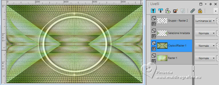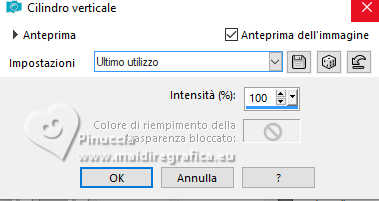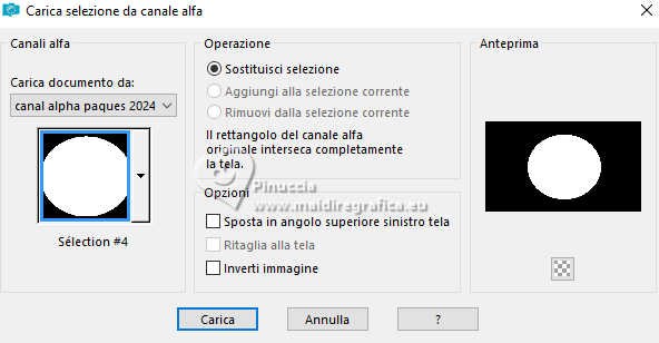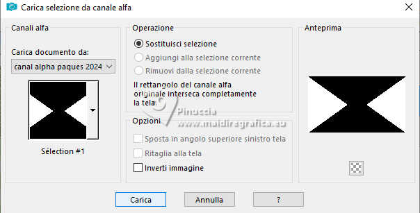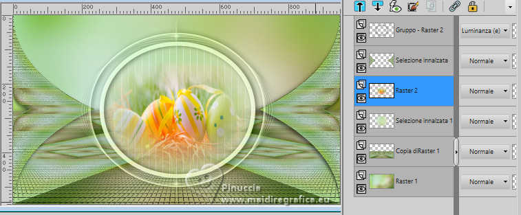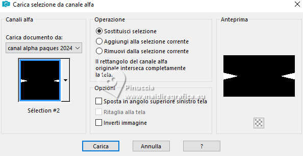 qui puoi trovare qualche risposta ai tuoi dubbi. Se l'argomento che ti interessa non è presente, ti prego di segnalarmelo. Questo tutorial, creato con PSP 2020, è stato tradotto con PSPX9, ma può essere realizzato anche con le altre versioni di PSP. Dalla versione X4, il comando Immagine>Rifletti è stato sostituito con Immagine>Capovolgi in orizzontale, e il comando Immagine>Capovolgi con Immagine>Capovolgi in verticale. Nelle versioni X5 e X6, le funzioni sono state migliorate rendendo disponibile il menu Oggetti. Con la nuova versione X7, sono tornati Rifletti>Capovolgi, ma con nuove varianti. Vedi la scheda sull'argomento qui English Translation qui/here Le vostre versioni qui![]() Occorrente: Un tube a scelta. Il resto del materiale ![]() Per gli altri tubes grazie Wieske, Guismo e Karine, per la maschera grazie Narah. Il resto del materiale è di Moi-Méme. Il tube usato e non fornito è di Adrienne; trovi il link del suo blog nella pagina qui sotto. (in questa pagina trovi i links ai siti dei creatori del materiale) ![]() se hai problemi con i filtri, consulta la mia sezione filtri qui Filters Unlimited 2.0 qui Screenworks - Aged Mosaic, Dot Screen qui Graphics Plus - Button Beveler II qui AP [Lines] - Lines SilverLining qui Mura's Meister - Perspective Tiling qui I filtri Screenworks e Graphics Plus si possono usare da soli o importati in Filters Unlimited (come fare vedi qui) Se un filtro fornito appare con questa icona ![]() non esitare a cambiare modalità di miscelatura e opacità secondo i colori utilizzati. ![]() Se hai problemi con il canale alfa, apri una nuova immagine trasparente 950 x 550 pixels, e usa le selezioni da disco. Apri la maschera in PSP e minimizzala con il resto del materiale. Imposta il colore di primo piano con #ffffff, e il colore di sfondo con #aece7c. ![]() 1. Apri canal_alpha_paques24 Questa immagine, che sarà la base del tuo lavoro non è vuota, ma contiene le selezioni salvate sul canale alfa. Selezione>Seleziona tutto. 2. Apri l'immagine di sfondo fond ![]() Modifica>Copia. Torna al tuo lavoro e vai a Modifica>Incolla nella selezione. Selezione>Deseleziona. per adattare lo sfondo ai tuoi colori, puoi usare per esempio il filtro Adjust>Variations 3. Livelli>Duplica. Effetti>Plugins>Filters Unlimited 2.0 - Screenworks - Aged Mosaic ![]() se usi il filtro da solo: Effetti>Plugins>Screenworks - Aged Mosaic ![]() Effetti>Plugins>Mura's Meister - Perspective Tiling. ![]() 4. Livelli>Duplica. Immagine>Rifletti>Rifletti verticalmente (Immagine>Capovolgi). Livelli>Unisci>Unisci giù. Effetti>Effetti di riflesso>Specchio rotante, con i settaggi standard. ![]() 5. Selezione>Carica/Salva selezione>Carica selezione da canale alfa. La selezione sélection 1 è subito disponibile. Devi soltanto cliccare Carica. ![]() Selezione>Innalza selezione a livello. Note: una selezione successiva sostituisce la precedente. Altrimenti fai Selezione>Deseleziona e continua. 6. Selezione>Carica/Salva selezione>Carica selezione da canale alfa. Apri il menu delle selezioni e carica la selezione sélection 2 ![]() Premi sulla tastiera il tasto CANC ![]() Selezione>Deseleziona. Effetti>Effetti 3D>Sfalsa ombra, colore nero. ![]() Effetti>EFfetti geometrici>Cilindro verticale. ![]() 7. Livelli>Nuovo livello raster. Riempi il livello con il colore bianco.Livelli>Nuovo livello maschera>Da immagine. Apri il menu sotto la finestra di origine e vedrai la lista dei files aperti. Seleziona la maschera NarahsMasks_1818 ![]() Livelli>Unisci>Unisci gruppo. Immagine>Ridimensiona, al 60%, tutti i livelli non selezionato. Tasto K per attivare lo strumento Puntatore ![]() imposta Posizione X: 192,00 e Posizione Y: 0,00. ![]() Livelli>Duplica. Immagine>Rifletti>Rifletti verticalmente (Immagine>Capovolgi). Mantieni Posizione X: 192,00 e imposta Posizione Y: 266,00. ![]() Livelli>Unisci>Unisci giù. Cambia la modalità di micealtura di questo livello in Luminanza (esistente). Mantieni Posizione X: 192,00 e imposta Posizione Y: 9,00. ![]() Tasto M per deselezionare lo strumento. Effetti>Effetti 3D>Sfalsa ombra, colore nero. ![]() 8. Attiva il livello Copia di Raster 1, il secondo dal basso. ![]() Effetti>Plugins>Mura's Meister - Perspective Tiling, con i settaggi precedenti. ![]() Selezione>Carica/Salva selezione>Carica selezione da canale alfa. Apri il menu delle selezioni e carica la selezione sélection 3 ![]() Premi 3 volte il tasto CANC .Selezione>Deseleziona. Effetti>Effetti 3D>Sfalsa ombra, con i settaggi precedenti. 9. Attiva nuovamente il livello di sfondo, Raster 1. Selezione>Carica/Salva selezione>Carica selezione da canale alfa. Apri il menu delle selezioni e carica la selezione sélection 4 ![]() Selezione>Innalza selezione a livello. Livelli>Disponi>Sposta su. Regola>Sfocatura>Sfocatura gaussiana - raggio 50. ![]() Effetti>Plugins>AP [Lines] - Lines SilverLining. ![]() Mantieni selezionato. 10. Livelli>Nuovo livello raster. Apri il misted K@rine_Dreams_;Misted_Easter ![]() Modifica>Copia. Torna al tuo lavoro e vai a Modifica>Incolla nella selezione. Selezione>Deseleziona. Dovresti avere questo: ![]() (adatta ai tuoi tube) 11. Attiva nuovamente il livello Raster 1. Livelli>Nuovo livello raster. Selezione>Seleziona tutto. Modifica>Incolla nella selezione - il misted è sempre in memoria. Selezione>Deseleziona. Effetti>Effetti di immagine>Motivo unico, con i settaggi standard. ![]() Regola>Messa a fuoco>Metti a fuoco. Abbassa l'opacità di questo livello al 50%. Effetti>Plugins>AP [Lines] - Lines SilverLining. ![]() 12. Attiva il livello superiore. Apri il tube déco lapins blancs ![]() Cancella il watermark e vai a Modifica>Copia. Torna al tuo lavoro e vai a Modifica>Incolla come nuovo livello. Tasto K per attivare lo strumento Puntatore ![]() e imposta Posizione X: 239,00 e Posizione Y: 238,00. ![]() 13. Apri il tube calguiseasteregg… ![]() Cancella il watermark e vai a Modifica>Copia. Torna al tuo lavoro e vai a Modifica>Incolla come nuovo livello. Immagine>Ridimensiona, al 60%, t