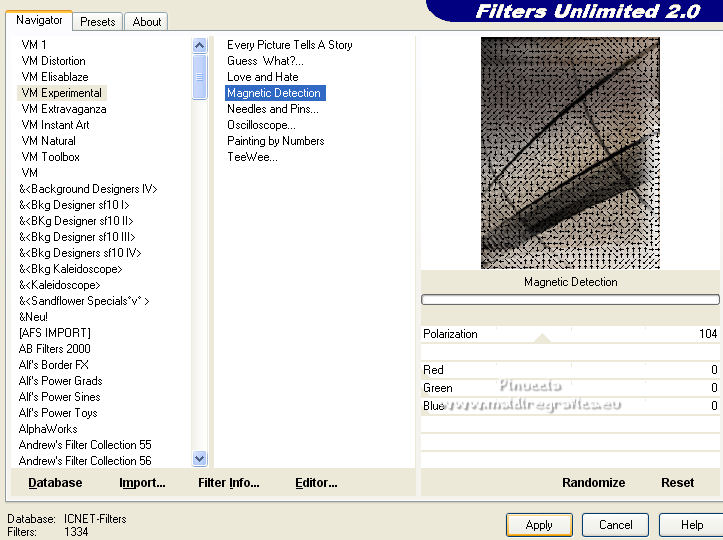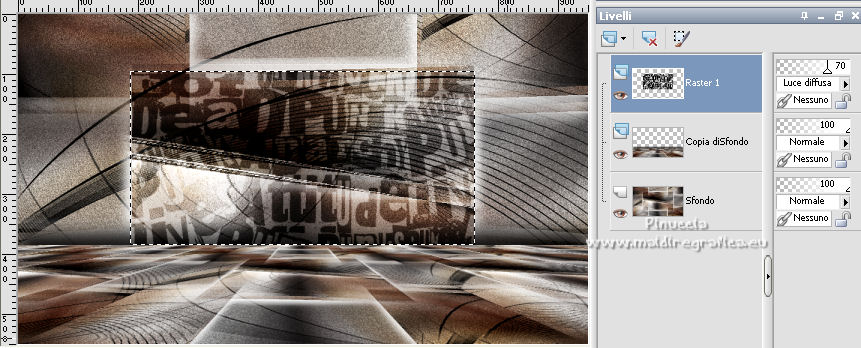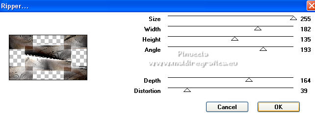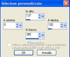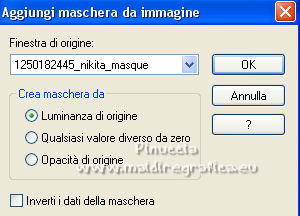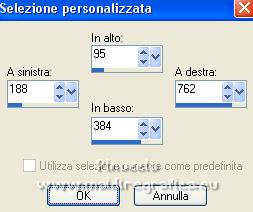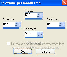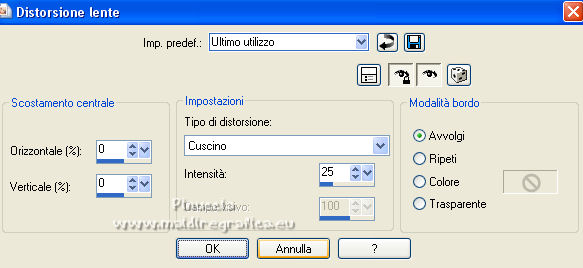 qui puoi trovare qualche risposta ai tuoi dubbi. Se l'argomento che ti interessa non è presente, ti prego di segnalarmelo. Questo tutorial è stato realizzato con Corel2020 e tradotto con CorelX, ma può essere realizzato anche con le altre versioni di PSP. Dalla versione X4, il comando Immagine>Rifletti è stato sostituito con Immagine>Capovolgi in orizzontale, e il comando Immagine>Capovolgi con Immagine>Capovolgi in verticale. Nelle versioni X5 e X6, le funzioni sono state migliorate rendendo disponibile il menu Oggetti. Con la nuova versione X7, sono tornati Rifletti>Capovolgi, ma con nuove varianti. Vedi la scheda sull'argomento qui English Translation qui/here Le vostre versioni qui/hereOccorrente: Materiale qui Per il tube e la maschera grazie LisaT e Nikita. Immagine deco da Internet. Il resto del materiale è di Moi-Même. (in questa pagina trovi i links ai siti dei creatori del materiale) Filtri: se hai problemi con i filtri, consulta la mia sezione filtri qui Filters Unlimited 2.0 qui VM Toolbox - Brightness Noise qui VM Natural - Ripper qui VM Experimental - Magnetic Detection qui Mura's Meister - Perspective Tiling qui I filtri della serie VM si possono usare da soli o importati in Filters Unlimited (come fare vedi qui) Se un filtro fornito appare con questa icona ![]() non esitare a cambiare modalità di miscelatura e opacità secondo i colori utilizzati. Apri la maschera in PSP e minimizzala con il resto del materiale. Imposta il colore di primo piano con #000000, e il colore di sfondo con #3a221c. ![]() 1. Apri una nuova immagine trasparente 950 x 550 pixels. Selezione>Seleziona tutto. (se vuoi accentuare uno dei tuoi colori, riempi il livello con il colore scelto, io non l'ho fatto). Apri il tube principale (per l'esempio la donna) e vai a Modifica>Copia. Torna al tuo lavoro e vai a Modifica>Incolla nella selezione. Selezione>Deseleziona. 2. Effetti>Effetti di immagine>Motivo unico, con i settaggi standard. ![]() Regola>Sfocatura>Sfocatura radiale. ![]() Livelli>Unisci>Unisci tutto. Regola>Sfocatura>Sfocatura gaussiana - raggio 10. ![]() Effetti>Plugins>VM Toolbox - Brightness Noise, con i settaggi standard. ![]() 3. Livelli>Nuovo livello raster. Riempi il livello con il colore nero di primo piano.Livelli>Nuovo livello maschera>Da immagine. Apri il menu sotto la finestra di origine e vedrai la lista dei files aperti. Seleziona la maschera 1250182445_nikita_masque. ![]() Effetti>Effetti di bordo>Aumenta. Livelli>Unisci>Unisci gruppo. Attiva lo strumento Selezione ![]() (non importa il tipo di selezione impostato, perché con la selezione personalizzata si ottiene sempre un rettangolo) clicca sull'icona Selezione personalizzata ![]() e imposta i seguenti settaggi. ![]() Premi sulla tastiera il tasto CANC ![]() Selezione>Deseleziona. Livelli>Unisci>Unisci giù. 4. Livelli>Duplica. Effetti>Effetti di distorsione>Distorsione Lente. ![]() Immagine>Ridimensiona, al 60%, tutti i livelli non selezionato. Effetti>Effetti di immagine>Motivo unico, con i settaggi standard. ![]() Cambia la modalità di miscelatura di questo livello in Luce netta. Effetti>Effetti 3D>Sfalsa ombra, colore bianco. ![]() Effetti>Plugins>VM Natural - Ripper. ![]() Effetti>Effetti di immagine>Motivo unico, Intermittente verticale. ![]() Regola>Messa a fuoco>Metti a fuoco. Effetti>Effetti 3D>Sfalsa ombra, con i settaggi precedenti. Livelli>Unisci>Unisci giù. 5. Livelli>Duplica. Effetti>Plugins>Mura's Meister - Perspective Tiling. ![]() Effetti>Effetti 3D>Sfalsa ombra, colore nero. ![]() 6. Selezione personalizzata ![]() ![]() Livelli>Nuovo livello raster. Apri l'immagine punkRock1..., e vai a Modifica>Copia. Torna al tuo lavoro e vai a Modifica>Incolla nella selezione. Cambia la modalità di miscelatura di questo livello in Luce diffusa, e abbassa l'opacità al 70%. ![]() Selezione>Deseleziona. 7. Attiva il livello di sfondo. Selezione personalizzata ![]() ![]() Livelli>Innalza selezione a livello. Livelli>Disponi>Porta in alto. Effetti>Plugins>Filters Unlimited 2.0 - VM Experimental - Magnetic Detection, con i settaggi standard. ![]() 8. Livelli>Nuovo livello raster. Apri il tube della donna. Immagine>Rifletti. Modifica>Copia. Torna al tuo lavoro e vai a Modifica>Incolla nella selezione. Regola>Messa a fuoco>Metti a fuoco. Selezione>Deseleziona. Effetti>Effetti 3D>Sfalsa ombra, colore nero. ![]() 9. Attiva il livello sottostante. Effetti>Effetti 3D>Sfalsa ombra, con i settaggi precedenti. 19. Attiva il livello di sfondo. Modifica>Copia. 20. Immagine>Aggiungi bordatura, 1 pixel, simmetriche, colore di primo piano (nero). Immagine>Aggiungi bordatura, 3 pixels, simmetriche, colore di sfondo. Immagine>Aggiungi bordatura, 1 pixel, simmetriche, colore di primo piano (nero). Selezione>Seleziona tutto. Immagine>Aggiungi bordatura, 30 pixels, simmetriche, colore di sfondo. Selezione>Inverti. Modifica>Incolla nella selezione. Regola>Messa a fuoco>Metti a fuoco. Selezione>Inverti. Effetti>Effetti 3D>Sfalsa ombra, con i settaggi precedenti. Selezione>Deseleziona. 12. Attiva nuovamente il tube della donna. Immagine>Rifletti (o Modifica>Annulla Rifletti). Modifica>Copia. Torna al tuo lavoro e vai a Modifica>Incolla come nuovo livello. Immagine>Ridimensiona, all'80%, tutti i livelli non selezionato. Tasto K per attivare lo strumento Puntatore ![]() e imposta posizione X: 573,00 e Posizione Y: 42,00. ![]() 13. Livelli>Duplica, e attiva il livello sottostante dell'originale. Regola>Sfocatura>Sfocatura gaussiana - raggio 30. ![]() Cambia la modalità di miscelatura di questo livello in Moltiplica. 14. Attiva il livello superiore. Apri il tube déco coins, e vai a Modifica>Copia. Torna al tuo lavoro e vai a Modifica>Incolla come nuovo livello. Apri il tube titre e vai a Modifica>Copia. Torna al tuo lavoro e vai a Modifica>Incolla come nuovo livello. Spostalo in alto come nel mio esempio.Cambia la modalità di miscelatura di questo livello in Sovrapponi. 15. Firma il tuo lavoro su un nuovo livello. Aggiungi la firma dell'aut
