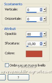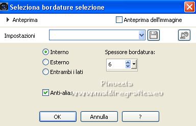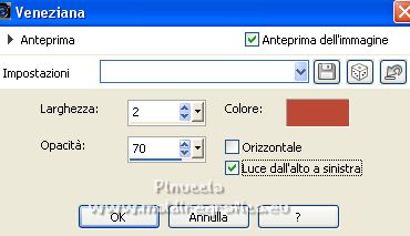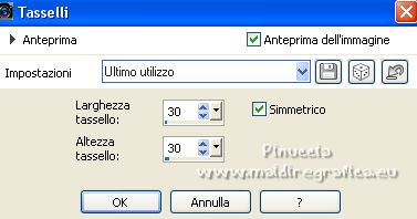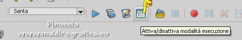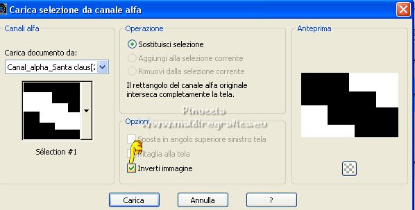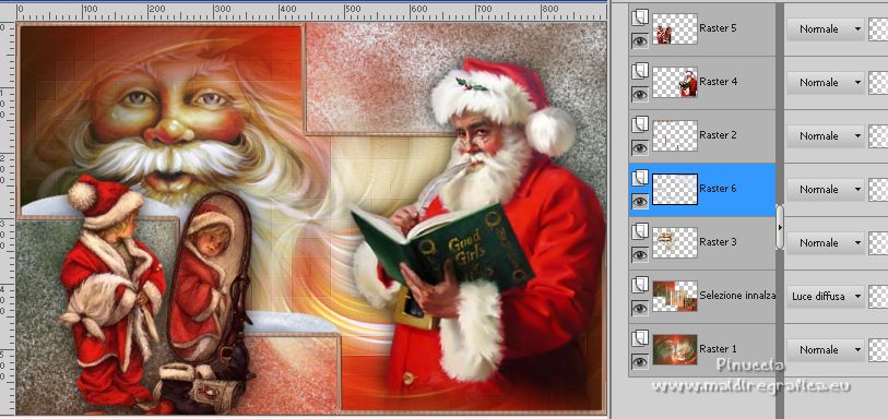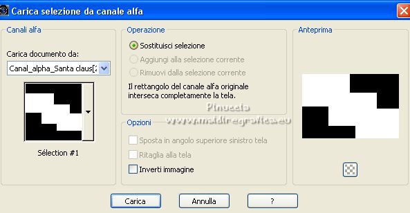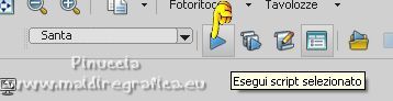 qui puoi trovare qualche risposta ai tuoi dubbi. Se l'argomento che ti interessa non è presente, ti prego di segnalarmelo. Questo tutorial è stato realizzato con Corel2019 e tradotto con CorelX, ma può essere realizzato anche con le altre versioni di PSP. Dalla versione X4, il comando Immagine>Rifletti è stato sostituito con Immagine>Capovolgi in orizzontale, e il comando Immagine>Capovolgi con Immagine>Capovolgi in verticale. Nelle versioni X5 e X6, le funzioni sono state migliorate rendendo disponibile il menu Oggetti. Con la nuova versione X7, sono tornati Rifletti>Capovolgi, ma con nuove varianti. Vedi la scheda sull'argomento qui Traduzione inglese qui![]() Occorrente: ![]() Per i tubes grazie Nikita, Elly, Tineke. L'immagine di sfondo, i decos e il wordart sono di Moi-Même. (in questa pagina trovi i links ai siti dei creatori del materiale) ![]() se hai problemi con i filtri, consulta la mia sezione filtri qui Alien Skin Eye Candy 5 Impact qui AAA Frames - Foto Frame qui ![]() non esitare a cambiare modalità di miscelatura e opacità secondo i colori utilizzati. Se hai problemi con il canale alfa, apri una nuova immagine trasparente 900 x 600 pixels, e usa le selezioni da disco. Imposta il colore di primo piano con il colore chiaro #ffe9c3, e il colore di sfondo con il colore rosso #bc4936. ![]() 1. Apri canal alpha_santa claus Questa immagine, che sarà la base del tuo lavoro, non è vuota, ma contiene le selezioni salvate sul canale alfa. 2. Selezione>Seleziona tutto. Apri l'immagine di sfondo Fond histoire noel ![]() Modifica>Copia. Torna al tuo lavoro e vai a Modifica>Incolla nella selezione. Selezione>Deseleziona. se vuoi puoi modificare i colori: per esempio: riempi il livello con uno dei tuoi colori, Nuovo livello raster. Incolla l'immagine di sfondo nella selezione. Cambia la modalità di miscelatura di questo livello a tuo piacimento 3. Selezione>Carica/Salva selezione>Carica selezione da canale alfa. La selezione Sélection 1 è subito disponibile. Devi soltanto cliccare Carica. ![]() Selezione>Innalza selezione a livello. Mantieni selezionato. 4. Livelli>Nuovo livello raster. Selezione>Modifica>Seleziona bordature selezione. ![]() Riempi la selezione con il colore chiaro di primo piano #ffe9c3.Effetti>Effetti di trama>Veneziana - colore di sfondo #bc4936. ![]() Effetti>Plugins>Alien Skin Eye Candy 5 Impact - Glass. Seleziona il preset Clear no drop shadow e ok. ![]() Effetti>Effetti 3D>Sfalsa ombra, colore nero. ![]() Selezione>Deseleziona. 5. Attiva il livello sottostante, Selezione innalzata Selezione>Carica/Salva selezione>Carica selezione da canale alfa. Carica nuovamente la selezione Sélection 1 ![]() Regola>Sfocatura>Sfocatura gaussiana - raggio 15. ![]() Effetti>Effetti di distorsione>Tasselli. ![]() Effetti>Effetti di bordo>Aumenta di più. Cambia la modalità di miscelatura di questo livello in Luce diffusa. Selezione>Deseleziona. 6. Apri il tube del viso 15122013es6 ![]() Cancella la firma e vai a Modifica>Copia. Torna al tuo lavoro e vai a Modifica>Incolla come nuovo livello. Spostalo in alto a sinistra.![]() Selezione>Carica/Salva selezione>Carica selezione da canale alfa. Carica nuovamente la selezione sélection 1, Inverti selezionato. ![]() Se necessario, riposiziona il tuo misted con lo strumento Spostamento ![]() Premi sulla tastiera il tasto CANC ![]() Selezione>Deseleziona. Alla prossima selezione, non dimenticare di deselezionare Inverti immagine 7. Attiva il livello superiore. Apri il tube del babbo natale 13508436236_noel nikita ![]() Cancella la firma e vai a Modifica>Copia. Torna al tuo lavoro e vai a Modifica>Incolla come nuovo livello. Immagine>Ridimensiona, all'80%, tutti i livelli non selezionato. Tasto K per attivare lo strumento Puntatore ![]() e imposta Posizione X: 484,00 e Posizione Y: 52,00. ![]() Effetti>Effetti 3D>Sfalsa ombra, colore nero. ![]() 8. Apri il tube del bambino 1Kerst ![]() Cancella la firma e vai a Modifica>Copia. Torna al tuo lavoro e vai a Modifica>Incolla come nuovo livello. Strumento Puntatore ![]() e imposta Posizione X: 58,00 e Posizione Y: 219,00. ![]() Effetti>Effetti 3D>Sfalsa ombra, con i settaggi precedenti. ![]() 9. Apri il tube déco snow ![]() Cancella la firma e vai a Modifica>Copia. Torna al tuo lavoro e vai a Modifica>Incolla come nuovo livello. Livelli>Disponi>Sposta giù - 3 volte (sotto il livello della cornice) ![]() 10. Apri il tube Tineke's tubes-185 ![]() Cancella la firma e vai a Modifica>Copia. Torna al tuo lavoro e vai a Modifica>Incolla come nuovo livello. Immagine>Ridimensiona, all'80%, tutti i livelli non selezionato. Strumento Puntatore ![]() e imposta Posizione X: 424,00 e Posizione Y: -14,00. ![]() Effetti>Effetti 3D>Sfalsa ombra, colore nero. ![]() Cancella la parte del tube al di fuori della cornice (se necessario carica la selezione 2 del canale alfa). ![]() Effetti>Effetti 3D>Sfalsa ombra, colore rosso di sfondo. ![]() 11. Apri il tube étoiles ![]() Cancella la firma e vai a Modifica>Copia. Torna al tuo lavoro e vai a Modifica>Incolla come nuovo livello. Cambia la modalità di miscelatura di questo livello in Sovrapponi. 12. Se non vedi la barra degli scripts: Visualizza>Barre degli strumenti>Scripts apri il menu e seleziona lo script santa Clicca sulla freccia per eseguire lo script. ![]() Se vuoi cambiare i colori, attiva la Modalità di esecuzione, cliccando sull'icona corrispondente. ![]() Si aprirà una finestra ad ogni passaggio: cambia il colore e continua. Quando apparirà la finestra del filtro, controlla i settaggi (se hai usato il filtro in precedenza, lo script memorizza i vecchi settaggi). ![]() ***** Se hai problemi con lo script, questi sono i settaggi che lo compongono. 12. Immagine>Aggiungi bordatura, 1 pixel, simmetriche, colore di sfondo #bc4936. Immagine>Aggiungi bordatura, 10 pixels, simmetriche, colore di primo piano #ffe9c3. Immagine>Aggiungi bordatura, 1 pixel, simmetriche, colore di sfondo #bc4936. Selezione>Seleziona tutto. Immagine>Aggiungi bordatura,