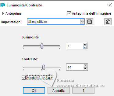 qui puoi trovare qualche risposta ai tuoi dubbi. Se l'argomento che ti interessa non è presente, ti prego di segnalarmelo. Questo tutorial è stato realizzato con PSP Ultimate 2020 e tradotto con PSPX7, ma può essere realizzato anche con le altre versioni di PSP. Dalla versione X4, il comando Immagine>Rifletti è stato sostituito con Immagine>Capovolgi in orizzontale, e il comando Immagine>Capovolgi con Immagine>Capovolgi in verticale. Nelle versioni X5 e X6, le funzioni sono state migliorate rendendo disponibile il menu Oggetti. Con la nuova versione X7, sono tornati Rifletti>Capovolgi, ma con nuove varianti. Vedi la scheda sull'argomento qui English Translation qui/here Le vostre versioni qui![]() Occorrente: ![]() Decoballon di freepng Il resto del materiale è di Moi-Même. (in questa pagina trovi i links ai siti dei creatori del materiale) ![]() se hai problemi con i filtri, consulta la mia sezione filtri qui Filters Unlimited 2.0 qui &<Bkg Designer sf10I> - Cruncher (da importare in Unlimited) qui VanDerLee - Halftone - nel materiale Mura's Meister - Perspective Tiling qui ![]() non esitare a cambiare modalità di miscelatura e opacità secondo i colori utilizzati. Nelle ultime versioni di PSP non c'é il gradiente di primo piano/sfondo (Corel_06_029) Puoi usare i gradienti delle versioni precedenti. Trovi qui i gradienti Corel X. ![]() Se hai problemi con il canale alfa, Apri una nuova immagine trasparente 950 x 550 pixels, e usa le selezioni da disco. Imposta il colore di primo piano con il colore 1 #691620, e il colore di sfondo con il colore #000000. ![]() Terzo colore: #979797. 1. Apri canal alpha Simply the best Questa immagine non è vuota, ma contiene le selezioni salvate sul canale alfa. Riempi l'immagine trasparente con il colore di primo piano.2. Livelli>Nuovo livello raster. Selezione>Seleziona tutto. Apri fond SB ![]() Modifica>Copia. Torna al tuo lavoro e vai a Modifica>Incolla nella selezione. Selezione>Deseleziona. Per adattare ai tuoi colori: cambia la modalità di miscelatura in Luminanza (esistente). Livelli>Unisci>Unisci giù. 3. Livelli>Duplica. Effetti>Plugins>Mura's Meister - Perspective Tiling, con i settaggi standard. ![]() Immagine>Ridimensiona, all'80%, tutti i livelli non selezionato. Effetti>Effetti di immagine>Motivo unico, con i settaggi standard. ![]() 4. Effetti>Effetti 3D>Sfalsa ombra, colore 3 #979797. ![]() Effetti>Plugins>Filters Unlimited 2.0 - &<Bkg Designer sf10I> - Cruncher, con i settaggi standard. ![]() Cambia la modalità di miscelatura di questo livello in Filtra. ![]() 4. Passa il colore di primo piano a Gradiente di primo piano/sfondo, stile Lineare. ![]() Selezione>Carica/Salva selezione>Carica selezione da canale alfa. La selezione Sélection 1 è subito disponibile. Devi soltanto cliccare Carica. ![]() Livelli>Nuovo livello raster. Riempi la selezione con il gradiente.Attiva il livello sottostante: Modifica>Taglia (questo comando taglia e tiene in memoria). ![]() Torna sul livello superiore. Modifica>Incolla nella selezione. ![]() Mantieni selezionato. 5. Effetti>Effetti geometrici>Cerchio. ![]() Selezione>Inverti. Premi sulla tastiera il tasto CANC ![]() Selezione>Deseleziona. Effetti>Effetti 3D>Sfalsa ombra, con i settaggi precedenti. 6. Attiva il livello sottostante. Effetti>Effetti 3D>Sfalsa ombra, con i settaggi precedenti. ![]() Livelli>Duplica. Effetti>Plugins>Mura's Meister - Perspective Tiling, height 10 ![]() 7. Livelli>Duplica. Immagine>Capovolgi. Livelli>Unisci>Unisci giù. Effetti>Effetti di distorsione>Onda. ![]() Modifica>Ripeti Onda - 2 volte. ![]() Effetti>Effetti 3D>Sfalsa ombra, con i settaggi precedenti. 8. Selezione>Carica/Salva selezione>Carica selezione da canale alfa. Apri il menu delle selezioni e carica la selezione Sélection 2. ![]() Premi sulla tastiera il tasto CANC ![]() Selezione>Deseleziona. 9. Selezione>Carica/Salva selezione>Carica selezione da canale alfa. Apri il menu delle selezioni e carica la selezione Sélection 3. ![]() Effetti>Plugins>VanDerLee - Halftone. ![]() Il livello è già in modalità Filtra. Selezione>Deseleziona. 10. Attiva il livello superiore del cerchio. Livelli>Unisci>Unisci giù. 11. Attiva il livello sottostante. ![]() Effetti>Effetti di bordo>Aumenta. 12. Attiva il livello superiore. Apri il tube principale CR7 MM ![]() Cancella il watermark e vai a Modifica>Copia. Torna al tuo lavoro e vai a Modifica>Incolla come nuovo livello. Spostalo a destra.Con lo strumento Puntatore (K) ![]() Posizione x: 574,00 e Posizione Y: 79,00. ![]() Tasto M per deselezionare lo strumento. 13. Livelli>Duplica. Attiva il livello sottostante dell'originale. Regola>Sfocatura>Sfocatura da movimento. ![]() Effetti>Effetti di distorsione>Onda, con i settaggi precedenti. Cambia la modalità di miscelatura di questo livello in Luce diffusa. 14. Facoltativo, soltanto se usi il tube fornito. Attiva il livello superiore del tube. Regola>Correzione fotografica in un passaggio. Regola>Luminosità e contrasto>Luminosità e contrasto. ![]() 15. Attiva il livello del tube. Effetti>Effetti 3D>Sfalsa ombra, colore nero. ![]() 1 16. Attiva il livello di sfondo Raster 1. Modifica>Copia 17. Immagine>Aggiungi bordatura, 1 pixel, simmetriche, colore di sfondo. Immagine>Aggiungi bordatura, 2 pixels, simmetriche, colore di primo piano. Immagine>Aggiungi bordatura, 1 pixel, simmetriche, colore di sfondo. Selezione>Seleziona tutto. Immagine>Aggiungi bordatura, 50 pixels, simmetriche, colore 3 #979797. Selezione>Inverti. Modifica>Incolla nella selezione Effetti>Plugins>VanDerLee - Halftone ![]() Regola>Messa a fuoco>Metti a fuoco. Selezione>Inverti. Effetti>Effetti 3D>Scalpello, colore di primo piano. ![]() Selezione>Deseleziona. 18. Apri il testo titre ![]() Modifica>Copia. Torna al tuo lavoro e vai a Modifica>Incolla come nuovo livello. Colorizza, secondo i tuoi colori. Strumento Puntatore (K) ![]() ![]() 19. Apri il tuo tube deco - per il mio esempio ![]() Modifica>Copia. Torna al tuo lavoro e vai a Modifica>Incolla