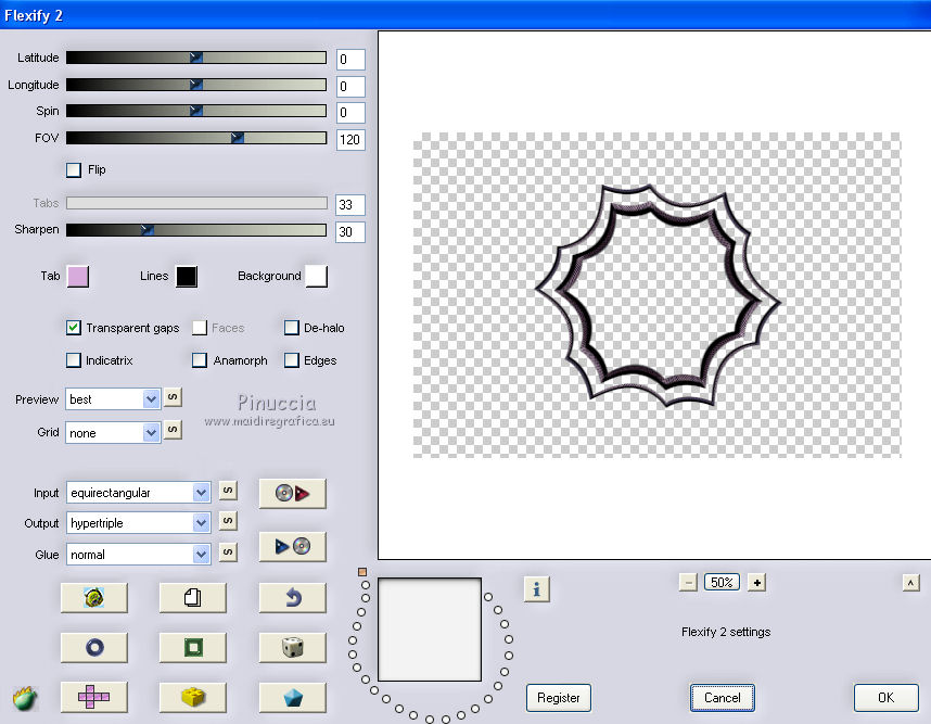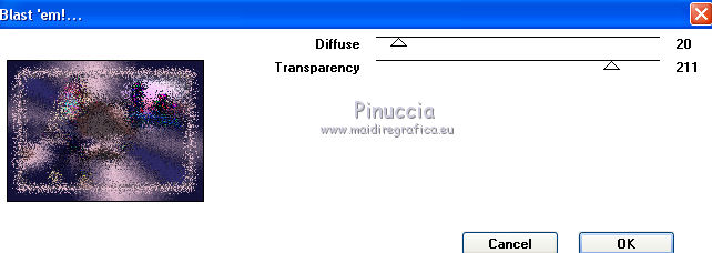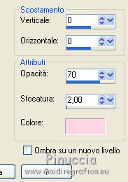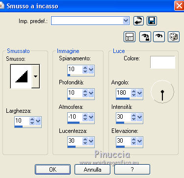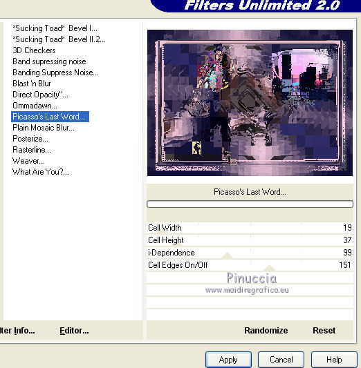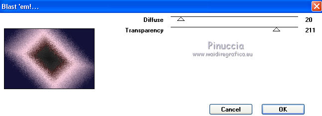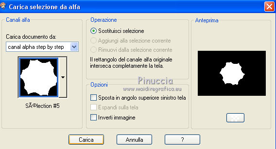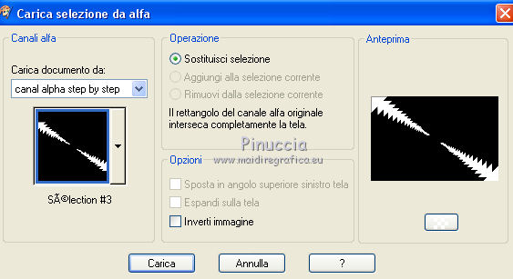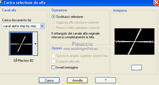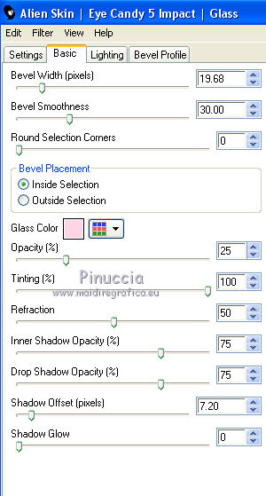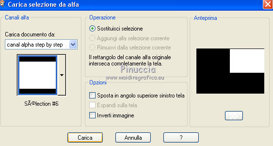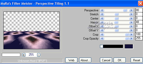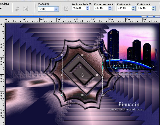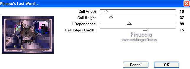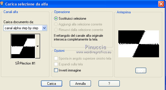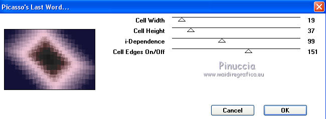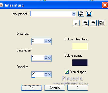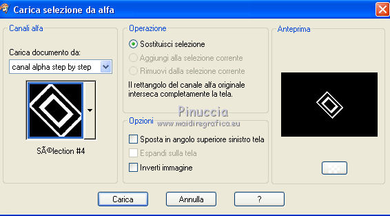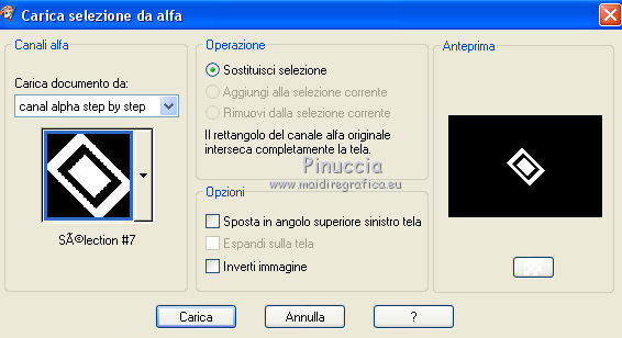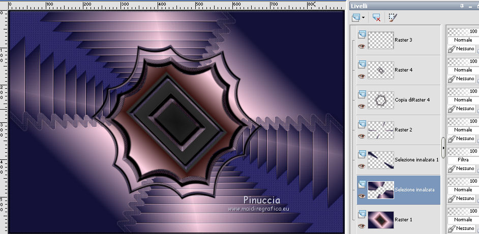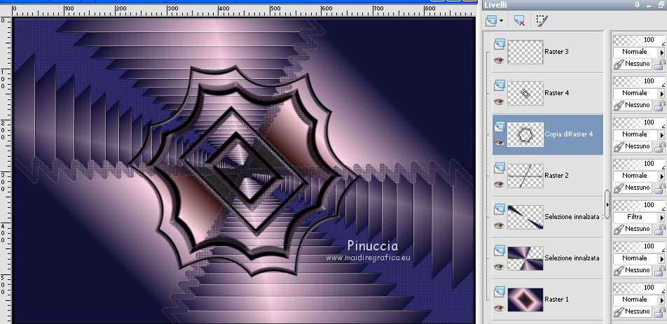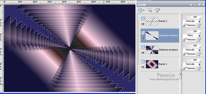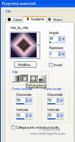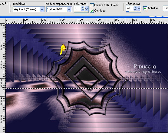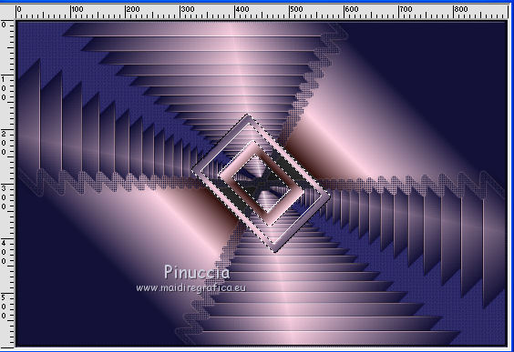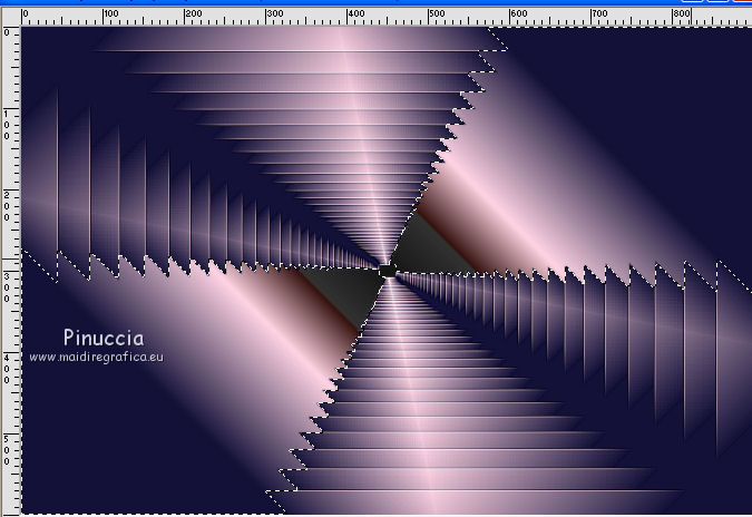 qui puoi trovare qualche risposta ai tuoi dubbi. Se l'argomento che ti interessa non è presente, ti prego di segnalarmelo. Questo tutorial è stato realizzato con Corel2020 e tradotto con CorelX7, ma può essere realizzato anche con le altre versioni di PSP. Dalla versione X4, il comando Immagine>Rifletti è stato sostituito con Immagine>Capovolgi in orizzontale, e il comando Immagine>Capovolgi con Immagine>Capovolgi in verticale. Nelle versioni X5 e X6, le funzioni sono state migliorate rendendo disponibile il menu Oggetti. Con la nuova versione X7, sono tornati Rifletti>Capovolgi, ma con nuove varianti. Vedi la scheda sull'argomento qui Occorrente: Materiale qui Per i tubes grazie Gabry e Sonia. Il resto del materiale è di Moi-Même (in questa pagina trovi i links ai siti dei creatori del materiale) Filtri: se hai problemi con i filtri, consulta la mia sezione filtri qui Filters Unlimited 2.0 qui Toadies - Blast'em, Picasso Last Word qui Alien Skin Eye Candy 5 Impact - Glass qui Flaming Pear - Flexify 2 qui Mura's Meister - Perspective Tiling qui I filtri Toadies si possono usare da soli o importati in Filters Unlimited (come fare vedi qui) Se un filtro fornito appare con questa icona ![]() non esitare a cambiare modalità di miscelatura e opacità secondo i colori utilizzati. Metti il gradiente nella cartella Gradienti. Imposta il colore di primo piano con #ffd4e4, e il colore di sfondo con il colore #141238. ![]() Passa il colore di primo piano a Gradiente, e seleziona il gradiente Step by step, stile Rettangolare ![]() 1. Apri canal alpha step_by_step. L'immagine, che sarà la base del tuo lavoro, non è vuota, ma contiene le selezioni salvate sul canale alfa. Se hai problemi con le selezioni, puoi usare le selezioni alternative fornite nel materiale (da mettere nella cartella Selezioni). Riempi l'immagine trasparente con il gradiente.usa il viraggio per colorizzare il livello, se stai usando altri colori 2. Selezione>Seleziona tutto. Selezione>Modifica>Contrai - 50 pixels. ![]() Selezione>Inverti. Selezione>Innalza selezione a livello. Selezione>Deseleziona. Effetti>Effetti di riflesso>Fuga di specchi. ![]() Effetti>Effetti di bordo>Aumenta di più. 3. Selezione>Carica/Salva selezione>Carica selezione da canale alfa. La selezione #1 è subito disponibile. Devi soltanto cliccare Carica. ![]() Premi sulla tastiera il tasto CANC ![]() ![]() Selezione>Deseleziona. Effetti>Effetti 3D>Sfalsa ombra, colore nero. ![]() 4. Livelli>Nuovo livello raster. Selezione>Carica/Salva selezione>Carica selezione da canale alfa. Apri il menu delle selezioni e carica la selezione #2. ![]() Riempi la selezione con il gradiente.Effetti>Effetti di trama>Intessitura. Colore intessitura: #ffffc8 Colore spazio: colore di sfondo ![]() Effetti>Effetti 3D>Sfalsa ombra, colore di primo piano. ![]() Selezione>Deseleziona. 5. Attiva il livello sottostante, Selezione innalzata. Selezione>Carica/Salva selezione>Carica selezione da canale alfa. Apri il menu delle selezioni e carica la selezione #3. ![]() Selezione>Innalza seleziona a livello. Effetti>Effetti di trama>Intessitura, con i settaggi precedenti. Cambia la modalità di miscelatura di questo livello in Filtra, o secondo i tuoi colori. ![]() Selezione>Deseleziona. 6. Attiva il livello superiore, Raster 2. Livelli>Nuovo livello raster. Selezione>Seleziona tutto. Selezione>Modifica>Contrai - 5 pixels. Selezione>Inverti. Riempi la selezione con il gradiente.Effetti>Effetti di trama>Intessitura, con i settaggi precedenti. Effetti>Effetti 3D>Smusso a incasso. ![]() Selezione>Deseleziona. 7. Attiva il livello sottostante, Raster 2. Livelli>Nuovo livello raster. Selezione>Carica/Salva selezione>Carica selezione da canale alfa. Apri il menu delle selezioni e carica la selezione #4. ![]() Riempi la selezione con il gradiente.![]() Effetti>Effetti di trama>Intessitura, con i settaggi precedenti. Effetti>Effetti 3D>Smusso a incasso, con i settaggi precedenti. Selezione>Deseleziona. Effetti>Effetti 3D>Sfalsa ombra, colore nero. ![]() 8. Livelli>Duplica. (nel materiale l'autrice ha aggiunto questo deco al materiale, se necessario. Se lo usi, dovrai adattarlo al tuo lavoro). Effetti>Plugins>Flaming Pear - Flexify 2. ![]() Livelli>Disponi>Sposta giù. ![]() Effetti>Effetti 3D>Sfalsa ombra, con i settaggi precedenti. 9. Attiva il livello sottostante, Raster 2. Selezione>Carica/Salva selezione>Carica selezione da canale alfa. Apri il menu delle selezioni e carica la selezione #5. ![]() Premi sulla tastiera il tasto CANC. Mantieni selezionato e attiva il livello sottostante, Selezione innalzata 1. Premi sulla tastiera il tasto CANC. Ancora Attiva il livello sottostante, Selezione innalzata. Premi sulla tastiera il tasto CANC. Selezione>Deseleziona. ![]() 10. Attiva il ivello di sfondo Raster 1. Effetti>Plugins>Toadies - Blast'em, con i settaggi standard. ![]() 11. Livelli>Duplica. Effetti>Plugins>Toadies - Picasso's last word ![]() Effetti>Plugins>Mura's Meister - Perspective Tiling. ![]() Attiva lo strumento Bacchetta magica , sfumatura 40,e clicca nella parte trasparente per selezionarla. ![]() Premi 5 volte CANC sur la tastiera. Selezione>Deseleziona. (non dimenticare di riportare la sfumatura a 0) 11. Attiva nuovamente il livello inferiore, Raster 1. Livelli>Nuovo livello raster. Selezione>Carica/Salva selezione>Carica selezione da canale alfa. Apri il menu delle selezioni e carica la selezione #6. ![]() Apri il tube del paesaggio di Sonia e vai a Modifica>Copia. Torna al tuo lavoro e vai a Modifica>Incolla nella selezione. Selezione>Deseleziona. Cambia la modalità di miscelatura di questo livello in Luce netta, o altro. 12. Rimani su questo livello. Selezione>Carica/Salva selezione>Carica selezione da canale alfa. Apri il menu delle selezioni e carica nuovamente la selezione #5. ![]() Premi sulla tastiera il tasto CANC. Selezione>Deseleziona. 13. Attiva il livello superiore, Raster 3. Livelli>Nuovo livello raster. Selezione>Carica/Salva selezione>Carica selezione da can