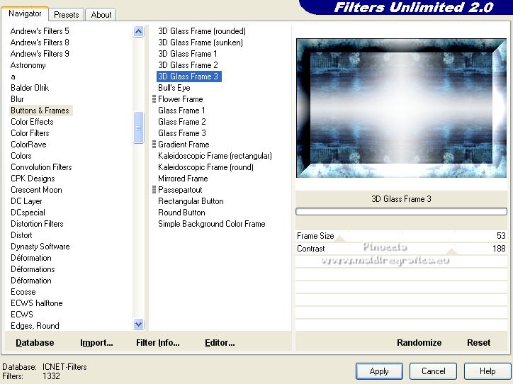 Effects>Plugins>Filters Unlimited 2.0 - Buttons & Frames - 3D Glass Frame 3.