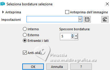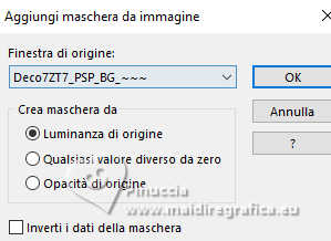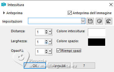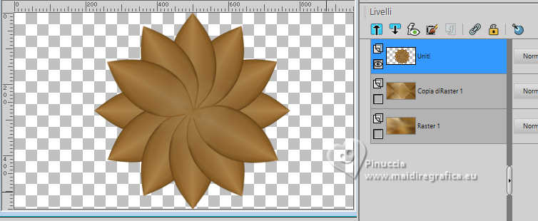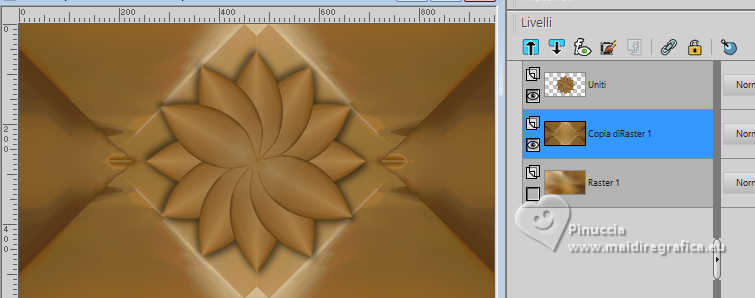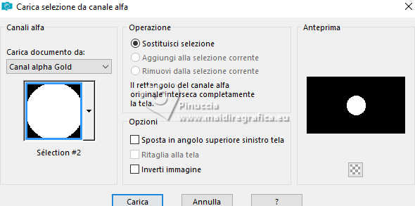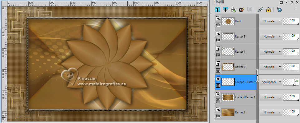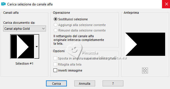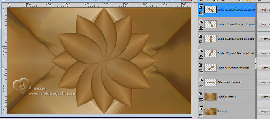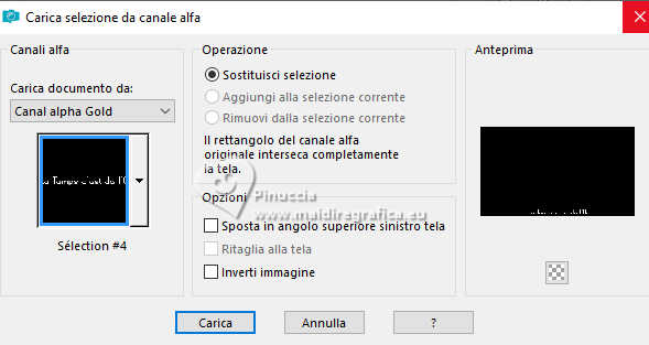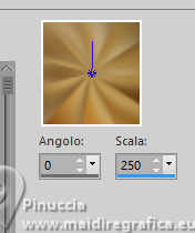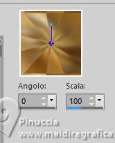 qui puoi trovare qualche risposta ai tuoi dubbi. Se l'argomento che ti interessa non è presente, ti prego di segnalarmelo. Questo tutorial, creato con PSP 2020, è stato tradotto con PSPX9, ma può essere realizzato anche con le altre versioni di PSP. Dalla versione X4, il comando Immagine>Rifletti è stato sostituito con Immagine>Capovolgi in orizzontale, e il comando Immagine>Capovolgi con Immagine>Capovolgi in verticale. Nelle versioni X5 e X6, le funzioni sono state migliorate rendendo disponibile il menu Oggetti. Con la nuova versione X7, sono tornati Rifletti>Capovolgi, ma con nuove varianti. Vedi la scheda sull'argomento qui English Translation qui/here![]() Occorrente: ![]() Per il tube del paesaggio grazie Kalan. Il resto del materiale è di Moi-Méme. (in questa pagina trovi i links ai siti dei creatori del materiale) ![]() se hai problemi con i filtri, consulta la mia sezione filtri qui Filters Unlimited 2.0 qui &> Bkg Designer sf10III> - Turbine Mirror (da importare in Unlimited) qui AP Distort - Distort-SlicedTurn qui Flaming Pear - Flexify 2 qui Alien Skin Eye Candy 5 Impact - Glass qui ![]() non esitare a cambiare modalità di miscelatura e opacità secondo i colori utilizzati. ![]() Se hai problemi con il canale alfa, apri una nuova immagine trasparente 950 x 550 pixels, e usa le selezioni da disco. Apri il motivo motif_gold_MM e la maschera in PSP e minimizzali con il resto del materiale. Imposta il colore di primo piano con il colore bianco #ffffff, e il colore di sfondo con il colore nero #000000. ![]() 1. Apri canal_alpha_Gold Questa immagine, che sarà la base del tuo lavoro non è vuota, ma contiene le selezioni salvate sul canale alfa. Selezione>Seleziona tutto. Attiva il motivo motif_gold_MM ![]() Modifica>Copia. Minimizza il motivo, che userai come motivo di primo piano. Torna al tuo lavoro e vai a Modifica>Incolla nella selezione. Selezione>Deseleziona. per cambiare i colori del tuo lavoro, cambia direttamente il colore del motivo (vedi altri colori nel materiale) Regola>Sfocatura>Sfocatura gaussiana - raggio 30. ![]() 2. Livelli>Duplica. Effetti>Plugins>Filters Unlimited 2.0 - &> Bkg Designer sf10III> - Turbine Mirror, con i settaggi standard. ![]() Effetti>Plugins>AP Distort - SlicedTurn ![]() Effetti>Plugins>Mehdi - Sorting Tiles. ![]() 3. Immagine>Ruota a destra Effetti>Effetti di riflesso>Specchio rotante, con i settaggi standard. ![]() Immagine>Ruota a sinistra. 4. Selezione>Carica/Salva selezione>Carica selezione da canale alfa. La selezione sélection 1 è subito disponibile. Devi soltanto cliccare Carica. ![]() Selezione>Innalza selezione a livello. Selezione>Deseleziona. Effetti>Plugins>Flaming Pear - Flexify 2 ![]() 5. Immagine>Ridimensiona, all'80%, tutti i livelli non selezionato. Tasto K per attivare lo strumento Puntatore ![]() e imposta Posizione x: 225,00 e Posizione Y: 207,00. ![]() 6. Livelli>Duplica. Immagine>Rifletti>Rifletti orizzontalmente. Imposta Posizione X: 497,00 e lascia Posizione Y: 207,00. ![]() Tasto M per deselezionare lo strumento. Livelli>Unisci>Unisci giù. 7. Attenzione, il passaggio che segue si deve realizzare 5 volte. Livelli>Duplica. Immagine>Ruota per gradi - 30 gradi a sinistra. ![]() Livelli>Duplica. Immagine>Ruota per gradi, con i settaggi precedenti. Livelli>Duplica. Immagine>Ruota per gradi, con i settaggi precedenti. Livelli>Duplica. Immagine>Ruota per gradi, con i settaggi precedenti. Livelli>Duplica. Immagine>Ruota per gradi, con i settaggi precedenti. Livelli>Duplica. Immagine>Ruota per gradi, con i settaggi precedenti. Adesso abbiamo 6 copie dello stesso livello, per un totale di 12 petali. ![]() Chiudi i due livelli inferiori. Livelli>Unisci>Unisci visibile. Rimani su questo livello ![]() 8. Immagine>Ridimensiona, all'80%, tutti i livelli non selezionato. Regola>Messa a fuoco>Metti a fuoco. Tasto K per attivare lo strumento Puntatore ![]() e imposta Posizione x: 255,00 e lascia Posizione Y: 55,00. ![]() Tasto M per deselezionare lo strumento. Effetti>Effetti 3D>Sfalsa ombra, colore nero. ![]() Ripeti l'Effetto Sfalsa ombra, verticale e orizzontale -7. 9. Apri e attiva il livello sottostante, Copia di Raster 1. Effetti>Effetti di riflesso>Specchio rotante, con i settaggi precedenti. ![]() La tag e i livelli ![]() Immagine>Ridimensiona, all'80%, tutti i livelli non selezionato. Attiva lo strumento Selezione ![]() e clicca su Livello opaco ![]() ![]() Livelli>Nuovo livello raster. Selezione>Inverti. Passa il colore di primo piano a Motivo cerca e seleziona il motivo minimizzzato motif_gold_MM ![]() Riempi la selezione con il motivo.Regola>Sfocatura>Sfocatura gaussiana, con i settaggi precedenti. Effetti>Effetti di trama>Intessitura colore intessitura: bianco colore spazio: nero. ![]() 10. Selezione>Inverti. Livelli>Nuovo livello raster. Selezione>Modifica>Seleziona bordature selezione. ![]() Riempi la selezione con il motivo.Effetti>Plugins>Alien Skin eye Candy 5 Impact - Glass Seleziona il preset Clear con i seguenti settaggi ![]() Selezione>Deseleziona. 11. Apri déco coins ![]() Cancella il watermark e vai a Modifica>Copia. Torna al tuo lavoro e vai a Modifica>Incolla come nuovo livello. Livelli>Disponi>Sposta giù. 12. Riapri il livello di sfondo, Raster 1. Attiva il livello Copia di Raster 1. Attiva nuovamente lo strumento Selezione ![]() e clicca su Livello opaco ![]() Passa il colore di primo piano a Colore. ![]() Livelli>Nuovo livello raster. Riempi il livello con il colore bianco.Livelli>Nuovo livello maschera>Da immagine. Apri il menu sotto la finestra di origine e vedrai la lista dei files aperti. Seleziona la maschera Deco72T7_PSP_BG ![]() Livelli>Duplica. Livelli>Unisci>Unisci gruppo. Cambia la modalità di miscelatura di questo livello in Sovrapponi, e abbassa l'opacità al 70%. Mantieni selezionato. ![]() 13. Livelli>Nuovo livello raster. Apri il tube del paesaggio 8YLPi2PXm2... ![]() Cancella il watermark e vai a Modifica>Copia. Torna al tuo lavoro e vai a Modifica>Incolla nella selezione. Selezi