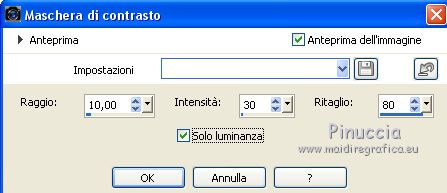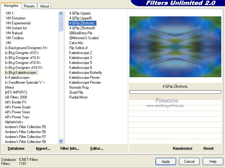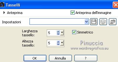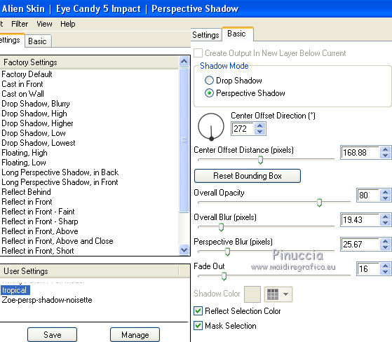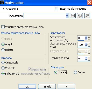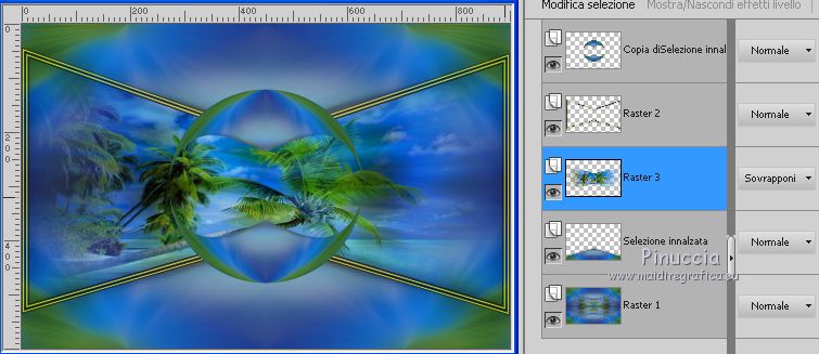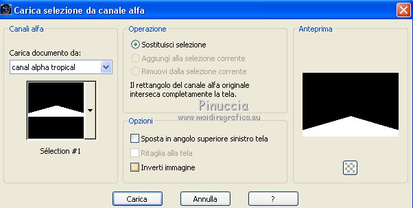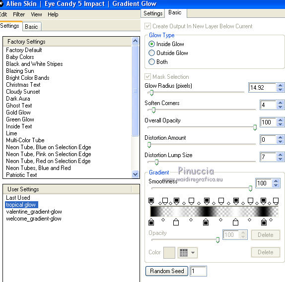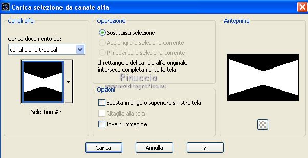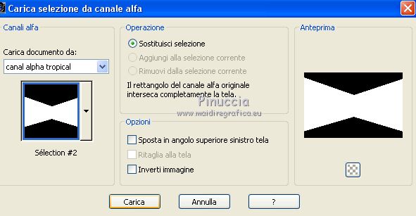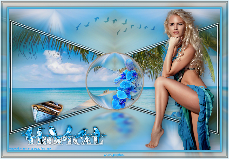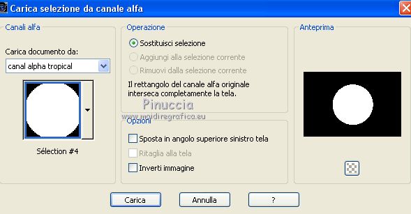 qui puoi trovare qualche risposta ai tuoi dubbi. Se l'argomento che ti interessa non è presente, ti prego di segnalarmelo. Questo tutorial è stato realizzato con Corel2020 e tradotto con CorelX7, ma può essere realizzato anche con le altre versioni di PSP. Dalla versione X4, il comando Immagine>Rifletti è stato sostituito con Immagine>Capovolgi in orizzontale, e il comando Immagine>Capovolgi con Immagine>Capovolgi in verticale. Nelle versioni X5 e X6, le funzioni sono state migliorate rendendo disponibile il menu Oggetti. Con la nuova versione X7, sono tornati Rifletti>Capovolgi, ma con nuove varianti. Vedi la scheda sull'argomento qui Occorrente: Materiale qui Per il tube grazie Jeanne. Il resto del materiale è di Moi-même. (in questa pagina trovi i links ai siti dei creatori del materiale) Filtri: se hai problemi con i filtri, consulta la mia sezione filtri qui Filters Unlimited 2.0 qui &<Bkg Kaleidoscope/gt; - 4 QFlip ZBottomL (da importare in Unlimited) qui Alien Skin Eye Candy 5 Impact - Glass, Perspective Shadow, Gradient Glow qui ![]() non esitare a cambiare modalità di miscelatura e opacità secondo i colori utilizzati. Metti i presets Cliccando sul file una o due volte (a seconda delle tue impostazioni), automaticamente il preset si installerà nella cartella corretta. perchè uno o due clic vedi qui Imposta il colore di primo piano con #577cdc, e il colore di sfondo con #243988. ![]() 1. Apri canal alpha tropical. Finestra>Duplica o sulla tastiera maiuscola+D per fare una copia. ![]() Chiudi l'originale. La copia, che sarà la base del tuo lavoro, non è vuota, ma contiene le selezioni salvate sul canale alfa. (se hai problemi con il canale alfa, apri una nuova immagine trasparente 900 x 600 pixels, e carica le selezioni da disco, usando le selezioni fornite nel materiale). Riempi l'immagine trasparente con il colore di sfondo.Apri il misted del paesaggio e vai a Modifica>Copia. Torna al tuo lavoro e vai a Modifica>Incolla come nuovo livello. Nota: se il tuo paesaggio è piccolo, aggungi un nuovo livello, Selezione>seleziona tutto e incolla nella selezione Regola>Sfocatura>Sfocatura radiale. ![]() Effetti>Effetti di immagine>Motivo unico, con i settaggi standard. ![]() 2. Attiva il livello sottostante. Selezione>Seleziona tutto. Immagine>Ritaglia la selezione. 3. Attiva il livello superiore. Livelli>Unisci>Unisci giù. Effetti>Plugins>Filters Unlimited 2.0 - &<Bkg Kaleidoscope/gt; - 4 QFlip ZBottomL ![]() (ovviamente il risultato potrà differire secondo il paesaggio). 4. Selezione>Carica/Salva selezione>Carica selezione da canale alpha. La selezione #1 è subito disponibile. Devi soltanto cliccare Carica. se hai problemi con il canale alfa, carica da disco la selezione che trovi nel materiale ![]() Selezione>Innalza selezione a livello. Livelli>Duplica - 2 volte. Selezione>Deseleziona. Immagine>Capovolgi. Livelli>Unisci>Unisci giù. Effetti>Effetti geometrici>Cerchio. ![]() Immagine>Ridimensiona, al 60%, tutti i livelli non selezionato. 5. Attiva il livello sottostante. ![]() Effetti>Effetti di distorsione>Tasselli. ![]() Effetti>Effetti 3D>Sfalsa ombra, colore nero. ![]() 6. (Nota per questo passaggio. Nel materiale trovi, in caso di necessità, il deco gradient glow neutro, da copiare/incollare come nuovo livello e posizionare come nell'esempio). Livelli>Nuovo livello raster. Selezione>Carica/Salva selezione>Carica selezione da canale alpha. Apri il menu delle selezioni e carica la selezione #2. ![]() Effetti>Plugins>Alien Skin Eye Candy 5 Impact - Gradient Glow. Seleziona il preset Tropical glow e ok. ![]() Selezione>Deseleziona. Imposta il colore di primo piano con il terzo colore #fff419. ![]() Attiva lo strumento Cambia colore ![]() clicca più volte per adattare il colore al colore di primo piano. ![]() Effetti>Effetti 3D>Sfalsa ombra, con i settaggi precedenti. 7. Attiva il livello sottostante. Livelli>Nuovo livello raster. Selezione>Carica/Salva selezione>Carica selezione da canale alpha. Apri il menu delle selezioni e carica la selezione #3. ![]() Modifica>Incolla nella selezione (il paesaggio è sempre in memoria). Selezione>Deseleziona. Cambia la modalità di miscelatura di questo livello in Sovrapponi (o secondo i tuoi colori). ![]() 8. Attiva il livello superiore. Livelli>Nuovo livello raster. Selezione>Carica/Salva selezione>Carica selezione da canale alpha. Apri il menu delle selezioni e carica la selezione #4. ![]() Riempi con il colore giallo di primo piano #fff419.Selezione>Modifica>Contrai 8 pixels. Premi sulla tastiera il tasto CANC ![]() Selezione>Deseleziona. Effetti>Plugins>Alien Skin Eye Candy 5 Impact - Glass Seleziona il preset Clear no drop shadow. ![]() Livelli>Unisci>Unisci giù. 9. Apri il tube de pappagallo e vai a Modifica>Copia. Torna al tuo lavoro e vai a Modifica>Incolla come nuovo livello. Immagine>Ridimensiona, al 70%, tutti i livelli non selezionato. (se usi un altro tube, adatta in modo che l'altezza sia quella dell'interno del cerchio). Se necessario, posiziona correttamente il tube al centro del cerchio.Effetti>Effetti 3D>Sfalsa ombra, colore nero. ![]() Livelli>Unisci>Unisci giù. Immagine>Ridimensiona, al 70%, tutti i livelli non selezionato. Effetti>Plugins>Alien Skin Eye Candy 5 Impact - Perspective Shadow. Seleziona il preset tropicalshadow e ok. ![]() Effetti>Effetti 3D>Sfalsa ombra, con i settaggi precedenti. 10. Apri il tube degli uccelli e vai a Modifica>Copia. Torna al tuo lavoro e vai a Modifica>Incolla come nuovo livello. Sposta il tube in alto a sinistra.Mantieni la modalità di miscelatura in Sovrapponi. 11. Apri il tube della donna e vai a Modifica>Copia. Torna al tuo lavoro e vai a Modifica>Incolla come nuovo livello. Immagine>Ridimensiona, al 70%, tutti i livelli non selezionato. Sposta il tube a destra.Effetti>Effetti 3D>Sfalsa ombra, a scelta. 12. Immagine>Aggiungi bordatura, 5 pixels, simmetriche, colore di sfondo. Immagine>Aggiungi bordatura, 1 pixel, simmetriche, colore di primo piano #fff419. Immagine>Aggi