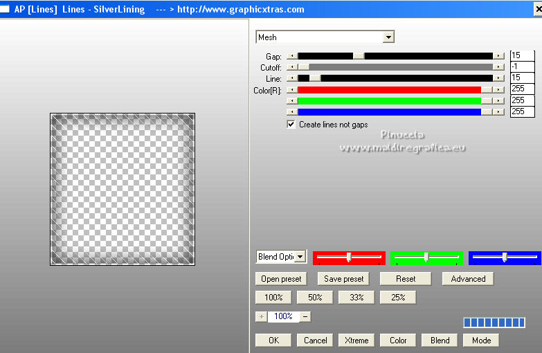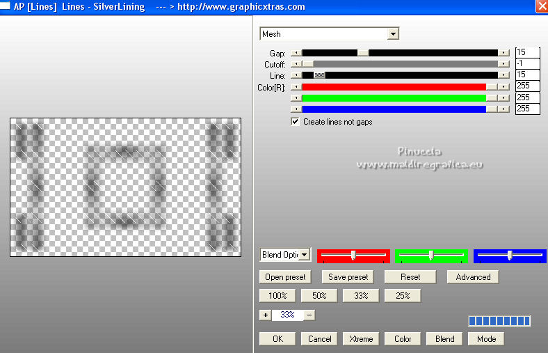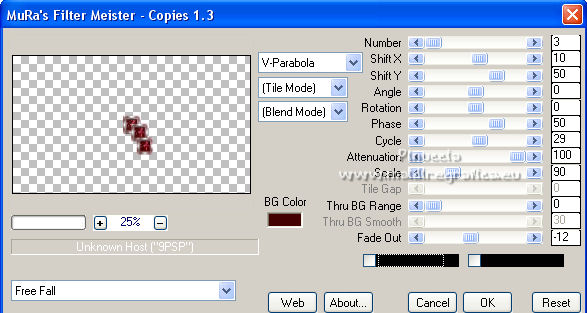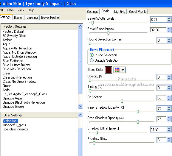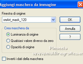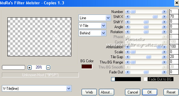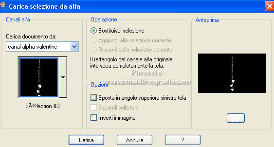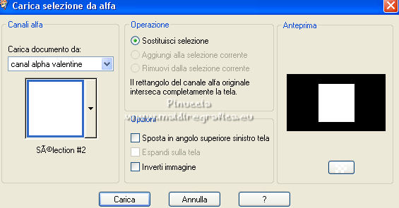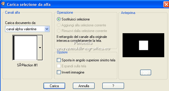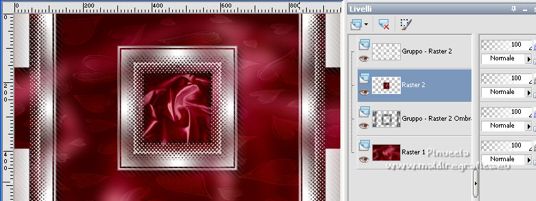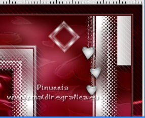 qui puoi trovare qualche risposta ai tuoi dubbi. Se l'argomento che ti interessa non è presente, ti prego di segnalarmelo. Questo tutorial è stato realizzato con Corel2020 e tradotto con CorelX, ma può essere realizzato anche con le altre versioni di PSP. Dalla versione X4, il comando Immagine>Rifletti è stato sostituito con Immagine>Capovolgi in orizzontale, e il comando Immagine>Capovolgi con Immagine>Capovolgi in verticale. Nelle versioni X5 e X6, le funzioni sono state migliorate rendendo disponibile il menu Oggetti. Con la nuova versione X7, sono tornati Rifletti>Capovolgi, ma con nuove varianti. Vedi la scheda sull'argomento qui Occorrente: Materiale qui Grazie per il tube Isa e per la maschera SmArt Designs. L'immagine tissu trovata su Interner. Il resto del materiale è di Moi-Même. (in questa pagina trovi i links ai siti dei creatori del materiale) Filtri: se hai problemi con i filtri, consulta la mia sezione filtri qui AP [Lines\ - Lines SilverLining qui Alien Skin Eye Candy 5 Impact - Glass qui Mura's Meister - Copies qui ![]() non esitare a cambiare modalità di miscelatura e opacità secondo i colori utilizzati. Metti il preset Cliccando sul file una o due volte (a seconda delle tue impostazioni), automaticamente il preset si installerà nella cartella corretta. perchè uno o due clic vedi qui > Apri la maschera in PSP e minimizzala con il resto del materiale. Imposta il colore di primo piano con #ffffff, e il colore di sfondo con un colore del tuo tube: #440101. ![]() 1. Apri canal alpha_valentine (dimensione 950 x 550 pixels). Finestra>Duplica o sulla tastiera maiuscola+D per fare una copia. ![]() Chiudi l'originale. La copia, che sarà la base del tuo lavoro, non è vuota, ma contiene le selezioni salvate sul canale alfa. Selezione>Seleziona tutto. Apri l'immagine "fond" e vai a Modifica>Copia. Torna al tuo lavoro e vai a Modifica>Incolla nella selezione. Selezione>Deseleziona. **** o, per adattare ai tuoi colori: riempi l'immagine trasparente con il colore di sfondo.Livelli>Nuovo livello raster. Modifica>Incolla nella selezione l'immagine "fond". Cambia la modalità di miscelatura di questo livello in Luminanza (esistente), e abbassa l'opacità all'80%. Livelli>Unisci>Unisci giù. **** 2. Livelli>Nuovo livello raster. Riempi il livello con il colore bianco.Livelli>Nuovo livello maschera>Da immagine. Apri il menu sotto la finestra di origine e vedrai la lista dei files aperti. Seleziona la maschera smArt_maszk_120. ![]() Regola>Messa a fuoco>Metti a fuoco. Livelli>Unisci>Unisci gruppo. Effetti>Effetti 3D>Sfalsa ombra, colore nero, ombra su nuovo livello selezionato. ![]() 3. Rimani posizionato sul livello dell'ombra. Effetti>Plugins>AP [Lines] - Lines SilverLining. ![]() Livelli>Duplica. Livelli>Unisci>Unisci giù. 4. Attiva il livello superiore. Selezione>Carica/Salva selezione>Carica selezione da canale alfa. La selezione #1 è subito disponibile. Devi soltanto cliccare Carica. ![]() Livelli>Nuovo livello raster. Apri l'immagine "tissu" e vai a Modifica>Copia. Torna al tuo lavoro e vai a Modifica>Incolla nella selezione. **** o, per adattare ai tuoi colori: Livelli>Nuovo livello raster. Riempi con il colore di sfondo.Livelli>Nuovo livello raster. Modifica>Incolla nella selezione l'immagine "fond". Cambia la modalità di miscelatura di questo livello in Luminanza (esistente) Livelli>Unisci>Unisci giù. **** Livelli>Nuovo livello raster. Effetti>Effetti 3D>Ritaglio. ![]() Effetti>Plugins>AP [Lines] - Lines SilverLining, con i settaggi precedenti. ![]() Selezione>Deseleziona. Livelli>Unisci>Unisci giù. Livelli>Disponi>Sposta giù. ![]() 5. Attiva il livello superiore. Selezione>Carica/Salva selezione>Carica selezione da canale alfa. Apri il menu delle selezioni e carica la selezione #2. ![]() Modifica>Copia Speciale>Copia Unione. Modifica>Incolla come nuovo livello. Selezione>Deseleziona. Immagine>Ridimensiona, al 20%, tutti i livelli non selezionato. Effetti>Plugins>Mura's Meister - Copies. ![]() Sposta l'immagine nell'angolo in alto a sinistra:con lo strumento Puntatore ![]() imposta Posizione X e Y a 0,00 ![]() Regola>Messa a fuoco>Metti a fuoco. 6. Effetti>Plugins>Alien Skin Eye Candy 5 Impact - Glass. Seleziona il preset valentine e sotto Basic, imposta il tuo colore di sfondo. ![]() 7. Livelli>Duplica. Immagine>Capovolgi. Immagine>Rifletti. Livelli>Unisci>Unisci giù. 8. Livelli>Nuovo livello raster. Selezione>Carica/Salva selezione>Carica selezione da canale alfa. Apri il menu delle selezioni e carica la selezione #3. ![]() Riempi con il colore bianco,(un clic sui cuori e un clic sulle catene). Effetti>Plugins>Alien Skin Eye Candy 5 Impact - Glass, con i settaggi precedenti. Selezione>Deseleziona. Tasto K sulla tastiera per attivare lo strumento Puntatore ![]() e imposta Posizione X: 86,00 e Posizione Y: 0,00 ![]() Effetti>Effetti 3D>Sfalsa ombra, colore nero, ombra su nuovo livello non selezionato. ![]() 9. Livelli>Duplica. Immagine>Rifletti. Mantieni Posizione X: 786,00 e imposta Posizione Y: -235,00. ![]() 10. Apri il tube della donna e vai a Modifica>Copia. Torna al tuo lavoro e vai a Modifica>Incolla come nuovo livello. Immagine>Ridimensiona, all'80%, tutti i livelli non selezionato. Imposta Posizione X: 179,00 e Posizione Y: 7,00 (o secondo il tuo tube). ![]() Livelli>Duplica. Attiva il livello sottostante dell'originale. Regola>Sfocatura>Sfocatura gaussiana - raggio 20. ![]() Cambia la modalità di miscelatura di questo livello in Moltiplica. 11. Attiva il livello della maschera, Gruppo Raster 2. Selezione>Carica/Salva selezione>Carica selezione da canale alfa. Apri il menu delle selezioni e carica nuovamente la selezione #2. ![]() Modifica>Copia. Selezione>Deseleziona. Modifica>Incolla come nuova immagine e minimizza per il momento. 12. Torna al tuo lavoro. Immagine>Aggiungi bordatura, 1 pixel, simmetriche, colore bianco. Immagine>Aggiungi bordatura, 5 pixels, simmetriche, colore di sfondo. Immagine>Aggiungi bordatura, 1 pixel, simmetriche, colore bian
