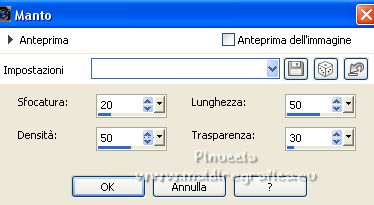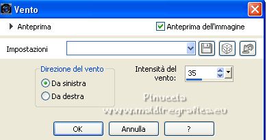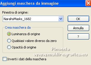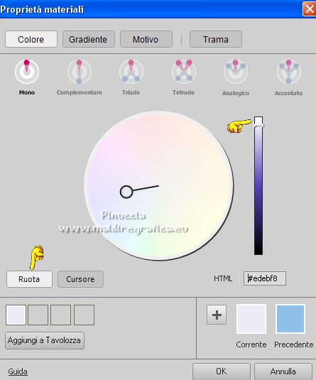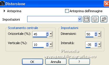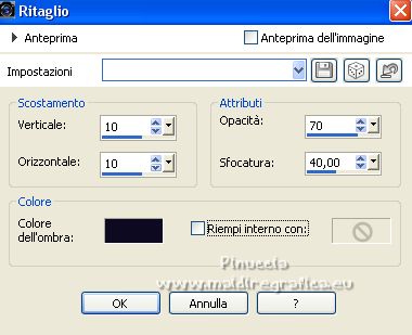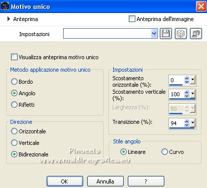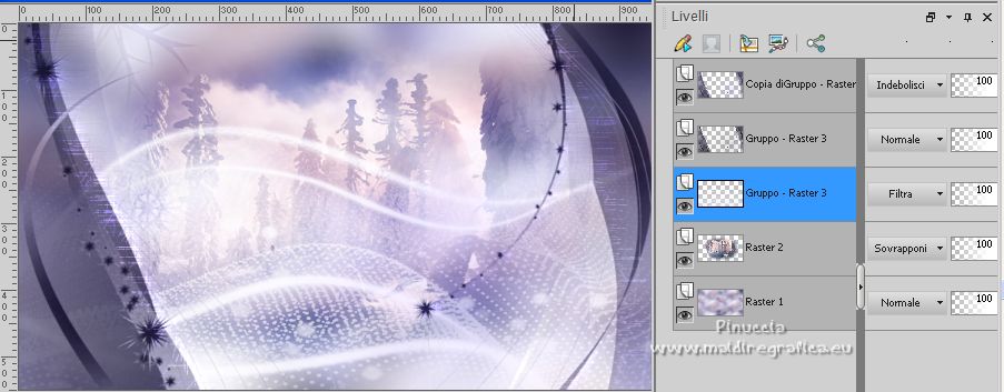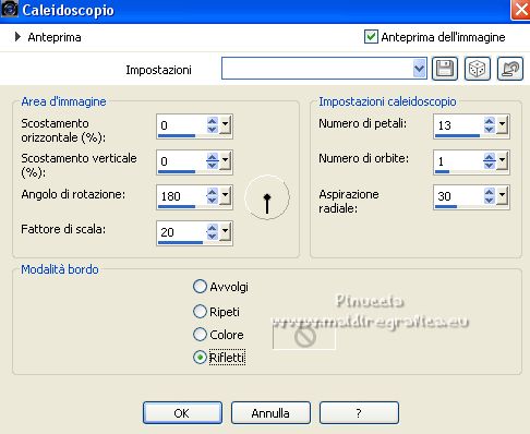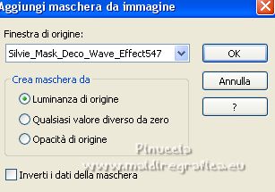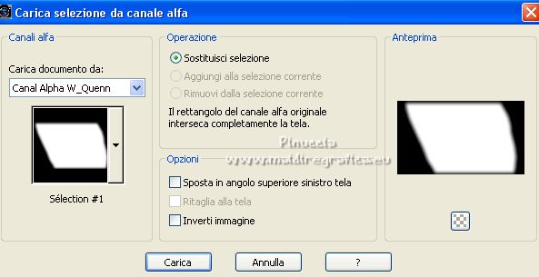 qui puoi trovare qualche risposta ai tuoi dubbi. Se l'argomento che ti interessa non è presente, ti prego di segnalarmelo. Questo tutorial è stato realizzato con Corel2020 e tradotto con CorelX, ma può essere realizzato anche con le altre versioni di PSP. Dalla versione X4, il comando Immagine>Rifletti è stato sostituito con Immagine>Capovolgi in orizzontale, e il comando Immagine>Capovolgi con Immagine>Capovolgi in verticale. Nelle versioni X5 e X6, le funzioni sono state migliorate rendendo disponibile il menu Oggetti. Con la nuova versione X7, sono tornati Rifletti>Capovolgi, ma con nuove varianti. Vedi la scheda sull'argomento qui English Translation qui/here![]() Occorrente: ![]() Grazie: per i tubes Isa e Mentali e per le maschere Narah e Silvie. Il resto del materiale è di Moi-Même. (in questa pagina trovi i links ai siti dei creatori del materiale) ![]() se hai problemi con i filtri, consulta la mia sezione filtri qui Mura's Meister - Perspective Tiling qui AP Lines - Lines SilverLining qui Alien Skin Eye Candy 5 Impact - Perspective Shadow qui AAA Frames - Foto Frame qui ![]() non esitare a cambiare modalità di miscelatura e opacità secondo i colori utilizzati. Nelle ultime versioni di PSP non c'é il gradiente di primo piano/sfondo (Corel_06_029) Puoi usare i gradienti delle versioni precedenti. Trovi qui i gradienti Corel X. Metti il preset Cliccando sul file una o due volte (a seconda delle tue impostazioni), automaticamente il preset si installerà nella cartella corretta. perché uno o due clic vedi qui ![]() Apri le maschere in PSP e minimizzale con il resto del materiale. Se hai problemi con il canale alfa, apri una nuova immagine trasparente 950 x 550 pixels, e usa la selezioni da disco. 1. Scegli un colore scuro dal tuo tube. Con l'aiuto della ruota, sposta il cursore per ottenere il colore chiaro: ![]() Imposta il colore di primo piano con il colore chiaro #edebf8, e il colore di sfondo con il colore scuro #0f0c22. ![]() Passa il colore di primo piano a Gradiente di primo piano/sfondo, stile Rettangolare. ![]() 2. Apri canal alpha W_Queen Questa immagine, che sarà la base del tuo lavoro, non è vuota, ma contiene una selezione salvata sul canale alfa. Riempi l'immagine trasparente con il gradiente.Effetti>Effetti di riflesso>caleidoscopio. ![]() 3. Selezione>Seleziona tutto. Apri il tube della donna HFI0042 ![]() Cancella la firma e vai a Modifica>Copia. Minimizza il tube. Torna al tuo lavoro e vai a Modifica>Incolla nella selezione. Selezione>Deseleziona. Effetti>Effetti di immagine>Motivo unico, con i settaggi standard. ![]() Effetti>Effetti di immagine>Motivo unico. ![]() Regola>Sfocatura>Sfocatura gaussiana - raggio 20. ![]() 4. Livelli>Nuovo livello raster. Selezione>Carica/Salva selezione>Carica selezione da canale alfa. La selezione sélection #1 è subito disponibile. Devi soltanto cliccare Carica. ![]() Apri il tube del paesaggio mentali-misted2143 ![]() Modifica>Copia. Torna al tuo lavoro e vai a Modifica>Incolla nella selezione. Cambia la modalità di miscelatura di questo livello in Sovrapponi, o secondo i tuoi colori. Selezione>Deseleziona. 5. Livelli>Nuovo livello raster. Riempi il livello con il colore di sfondo.Livelli>Nuovo livello maschera>Da immagine. Apri il menu sotto la finestra di origine e vedrai la lista dei files aperti. Seleziona la maschera NarahsMasks_1682. ![]() Livelli>Unisci>Unisci gruppo. 6. Livelli>Duplica. Effetti>Effetti di distorsione>Vento. ![]() Cambia la modalità di miscelatura di questo livello in Indebolisci, o secondo i tuoi colori. Effetti>Effetti di trama>Manto. ![]() 7. Attiva il livello sottostante. Livelli>Nuovo livello raster. Porta il colore di primo piano a Colore. Riempi il livello con il colore di primo piano.Livelli>Nuovo livello maschera>Da immagine. Apri il menu sotto la finestra di origine e vedrai la lista dei files aperti. Seleziona la maschera Silvie_Mask_Deco_Wave_Effect547. ![]() Livelli>Unisci>Unisci gruppo. Cambia la modalità di miscelatura di questo livello in Filtra. Livelli>Disponi>Sposta giù. ![]() 8. Modifica>Copia Speciale>Copia Unione. Modifica>Incolla come nuovo livello. Livelli>Disponi>Porta in alto. Effetti>Plugins>Mura's Meister - Perspective Tiling. ![]() Effetti>Effetti 3D>Sfalsa ombra, colore di sfondo. ![]() 9. Livelli>Duplica. Immagine>Capovolgi. Livelli>Unisci>Unisci giù. Effetti>Effetti di distorsione>Distorsione. ![]() Effetti>Effetti 3D>Sfalsa ombra, con i settaggi precedenti. 10. Apri il tube déco snowscape ![]() Cancella il watermark e vai a Modifica>Copia . Torna al tuo lavoro e vai a Modifica>Incolla come nuovo livello. Tasto K per attivare lo strumento Puntatore ![]() mantieni Posizione X: 0,00 e imposta Posizione Y: 375,00. ![]() Tasto M per deselezionare lo strumento. 11. Livelli>Nuovo livello raster. Selezione>Seleziona tutto. Riempi con il colore di sfondo.Selezione>Modifica>Contrai - 4 pixels. Riempi con il colore di primo piano.Selezione>Modifica>Contrai - 4 pixels. Riempi con il colore di sfondo.Selezione>Modifica>Contrai - 2 pixels. Premi sulla tastiera il tasto CANC ![]() Mantieni selezionato. 12. Livelli>Nuovo livello raster. Effetti>Effetti 3D>Ritaglio, colore di sfondo (o nero se il vostro colore è troppo chiaro). ![]() Selezione>Deseleziona. 13. Livelli>Duplica. Immagine>Rifletti. Immagine>Capovolgi. Livelli>Unisci>Unisci giù. Effetti>Plugins>AP Lines - Lines SilverLining. ![]() Livelli>Disponi>Sposta giù. 14. Attiva il livello superiore. Apri il tube déco étoiles de neige ![]() Cancella il watermark e vai a Modifica>Copia. Torna al tuo lavoro e vai a Modifica>Incolla come nuovo livello. Tasto K per attivare lo strumento Puntatore ![]() imposta Posizione X: 34,00 e mantieni Posizione Y: 1,00. ![]() Effetti>Effetti 3D>Sfalsa ombra, con i settaggi precedenti. 15. Apri titre ![]() Modifica>Copia. Torna al tuo lavoro e vai a Modifica>Incolla come nuovo livello. Imposta Posizione X: 656,00 e Posizione Y: 364,00. ![]() Tasto M per deselezionare lo strument