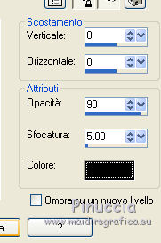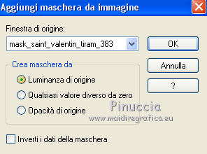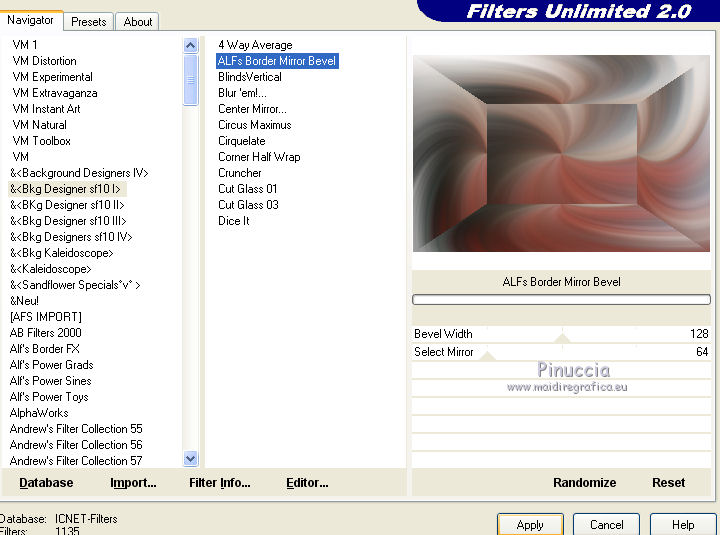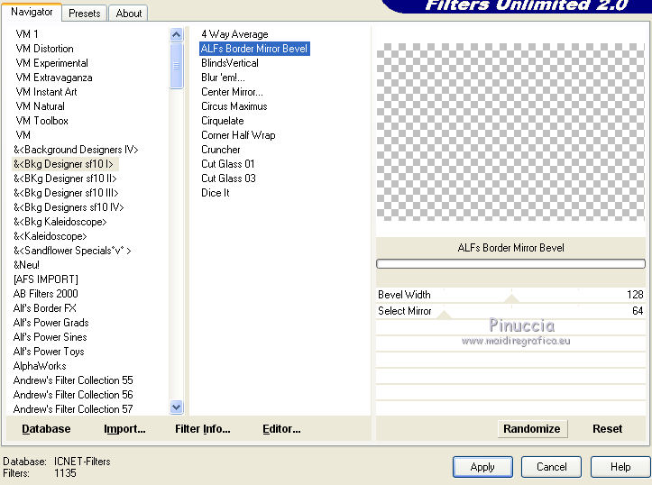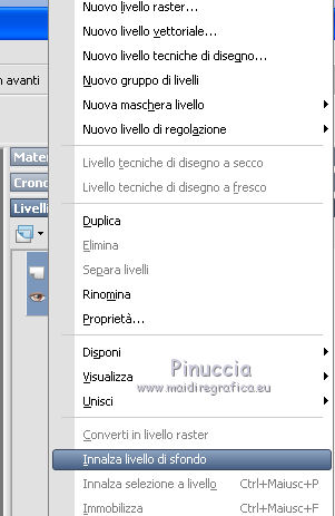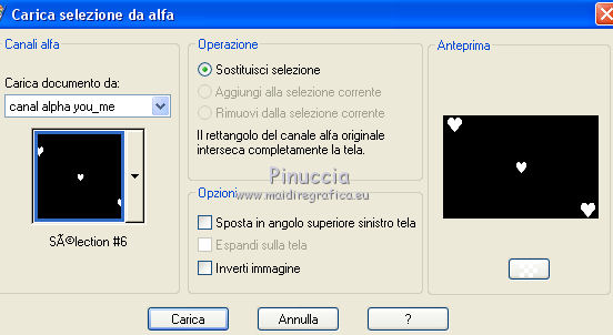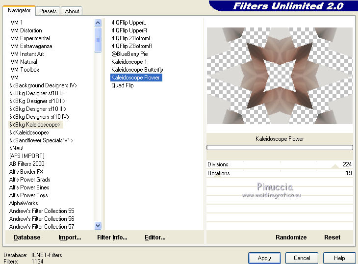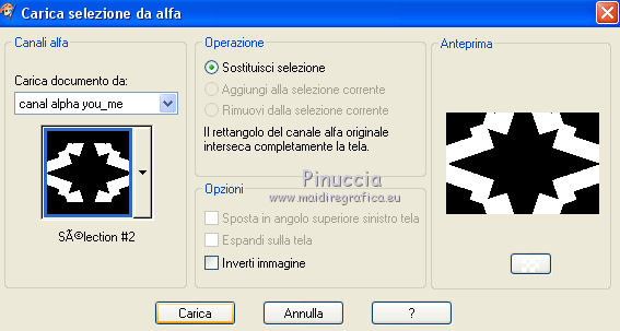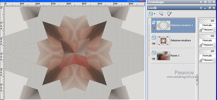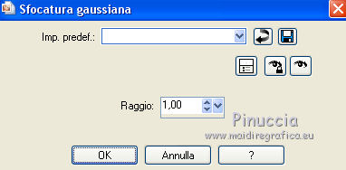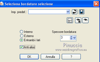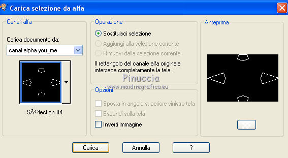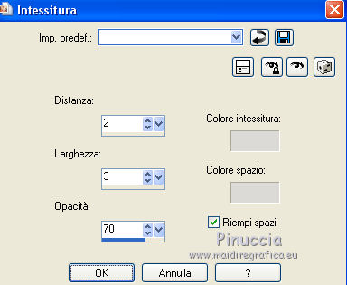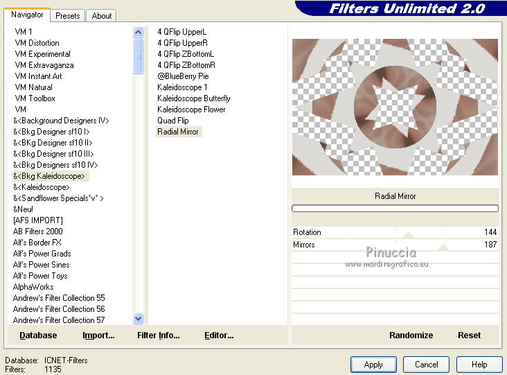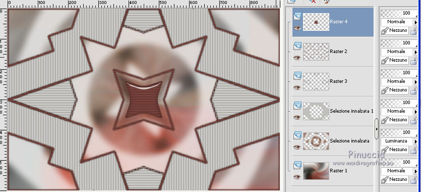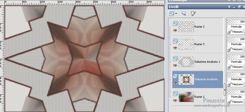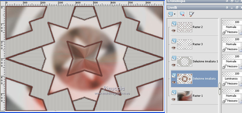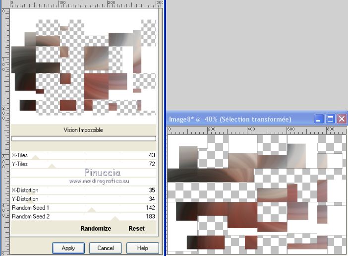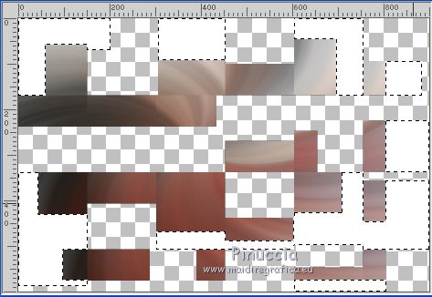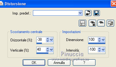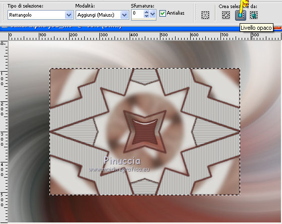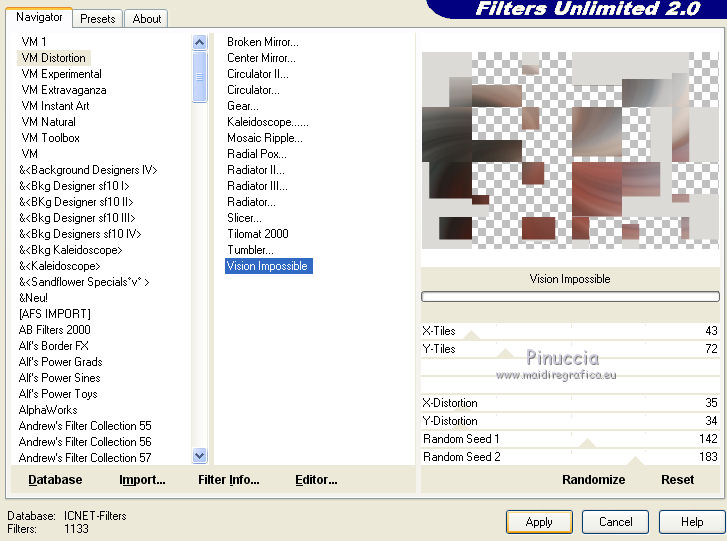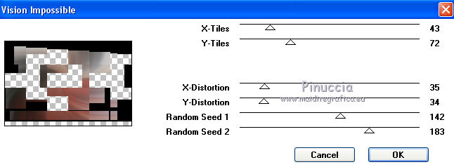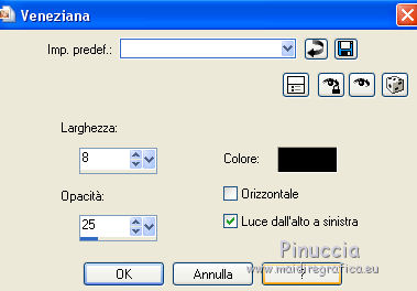 qui puoi trovare qualche risposta ai tuoi dubbi. Se l'argomento che ti interessa non è presente, ti prego di segnalarmelo. Questo tutorial è stato realizzato con Corel2020 e tradotto con CorelX7, ma può essere realizzato anche con le altre versioni di PSP. Dalla versione X4, il comando Immagine>Rifletti è stato sostituito con Immagine>Capovolgi in orizzontale, e il comando Immagine>Capovolgi con Immagine>Capovolgi in verticale. Nelle versioni X5 e X6, le funzioni sono state migliorate rendendo disponibile il menu Oggetti. Con la nuova versione X7, sono tornati Rifletti>Capovolgi, ma con nuove varianti. Vedi la scheda sull'argomento qui Occorrente: Materiale qui Per il tube grazie Alina Il resto del materiale è di Moi-Même (in questa pagina trovi i links ai siti dei creatori del materiale) Filtri: se hai problemi con i filtri, consulta la mia sezione filtri qui Filters Unlimited 2.0 qui &<Bkg Designer sf10Igt; - Alf's BorderMirror Bevel (da importare in Unlimited) qui &<Bkg Kaleidoscope> - Kaleidoscope Flowers, Radial Mirror (da importare in Unlimited) qui VM Distortion - Vision impossible qui nel materiale l'effetto in formato ffx da importare in Unlimited) I filtri VM Distortion si possono usare da soli o importati in Filters Unlimited (come fare vedi qui) Se un filtro fornito appare con questa icona ![]() non esitare a cambiare modalità di miscelatura e opacità secondo i colori utilizzati. Se intendi usare il testo, aprilo e minimizzalo. Lo troverai nella lista dei font disponibili quando ti servirà. Con i nuovi sistemi operativi questo non è più possibile. Per usare un font, occorre copiarlo nella cartella Fonts di Windows. Imposta il colore di primo piano con #824942, e il colore di sfondo con il colore #dbdad7. ![]() 1. Apri canal alpha you_me. L'immagine, che sarà la base del tuo lavoro, non è vuota, ma contiene le selezioni salvate sul canale alfa. Se hai problemi con le selezioni, puoi usare le selezioni alternative fornite nel materiale (da mettere nella cartella Selezioni). Selezione>Seleziona tutto. Apri il tube della coppia, cancella il watermark e vai a Modifica>Copia. Minimizza il tube che ti servirà ancora. Torna al tuo lavoro e vai a Modifica>Incolla nella selezione. Selezione>Deseleziona. Regola>Sfocatura>Sfocatura radiale. ![]() Livelli>Unisci>Unisci tutto. Nella paletta dei livelli, clicca con il tasto destro del mouse sul livello, e nel menu che si apre seleziona Innalza livello di sfondo. ![]() 3. Selezione>Seleziona tutto. Selezione>Modifica>Contrai - 100 pixels. Selezione>Innalza selezione a livello. Selezione>Deseleziona. 4. Effetti>Plugins>Filters Unlimited 2.0 - VM Distortion - Vision Impossible, con i settaggi standard ![]() Chiudendo il livello inferiore, questo è il risultato usando la versione software di Unlimited ![]() ***** attenzione, se stai usando la versione di Unlimited che non ha bisogno di installazione, perchè è composta da files in formato 8bf, avrai un risultato differente ![]() Se non vuoi sostituire il filtro nei Percorsi files, poi selezionare le parti bianche con la bacchetta magica ![]() ![]() e riempire le selezioni con il colore chiaro di sfondo(prima di riempire ti consiglio di espandere la selezione di 1-2 pixels (Selezione>Modifica>Espandi) Se invece usi il filtro da solo, avrai una anteprima differente, ma il risultato sarà lo stesso di quello con l'effetto importato in Unlimited software ![]() ![]() ***** Effetti>Plugins>&<Bkg Kaleidoscope> - Kaleidoscope Flower ![]() 5. Selezione>Carica/Salva selezione>Carica selezione da canale alfa. La selezione #1 è subito disponibile. Devi soltanto cliccare Carica. ![]() Selezione>Innalza selezione a livello. Effetti>Effetti di trama>Veneziana. ![]() Selezione>Deseleziona. 6. Livelli>Nuovo livello raster. Selezione>Carica/Salva selezione>Carica selezione da canale alfa. Apri il menu delle selezioni e carica la selezione #2. ![]() Riempi la selezione con il colore chiaro di sfondo.Effetti>Effetti di trama>Veneziana, con i settaggi precedenti, ma Orizzontale non selezionato. ![]() Selezione>Deseleziona. Livelli>Unisci>Unisci giù. ![]() 7. Livelli>Nuovo livello raster. Selezione>Carica/Salva selezione>Carica selezione da canale alfa. Apri il menu delle selezioni e carica la selezione #3. ![]() Riempi la selezione con il colore di primo piano.Regola>Sfocatura>Sfocatura gaussiana - raggio 1. ![]() Effetti>Effetti di trama>Veneziana, orizzontale non selezionato. ![]() Selezione>Deseleziona. Effetti>Effetti 3D>Sfalsa ombra, colore nero. ![]() 8. Attiva il livello sottostante, Selezione innalzata 1 Livelli>Nuovo livello raster. Selezione>Carica/Salva selezione>Carica selezione da canale alfa. Apri il menu delle selezioni e carica la selezione #4. ![]() Imposta il colore di sfondo con il colore #dbdad7. ![]() Riempi la selezione con il colore di sfondo #dbdad7.Effetti>Effetti di trama>Intessitura, entrambi i colori con il colore chiaro #dbdad7 ![]() Selezione>Deseleziona. Effetti>Effetti 3D>Sfalsa ombra, con i settaggi precedenti. 9. Attiva il livello Selezione innalzata (il secondo dal basso) ![]() Prima del prossimo filtro (che è influnzato dal colore di sfondo, imposta nuovamente il colore di sfondo con il colore chiaro #dbdad7. Effetti>Plugins>Filters Unlimited 2.0 - &<Bkg Kaleidoscope> - Radial Mirror. ![]() Regola>Sfocatura>Sfocatura gaussiana - raggio 10 ![]() Cambia la modalità di miscelatura di questo livello in Luminanza ![]() 10. Attiva il livello superiore. Livelli>Nuovo livello raster. Selezione>Carica/Salva selezione>Carica selezione da canale alfa. Apri il menu delle selezioni e carica la selezione #5. ![]() Riempi la selezione con il colore di primo piano.Effetti>Effetti di trama>Veneziana, con i settaggi precedenti. ![]() Selezione>Deseleziona. Effetti>Plugins>Alien Skin Eye Candy 5 Impact - Glass. Selezione il preset Clear no drop shadow e ok. ![]() Risultato ![]() 11. Chiudi il livello inferiore, Raster 1. Livelli>Unisci>Unisci visibile. 12. Riapri il livello Rast