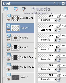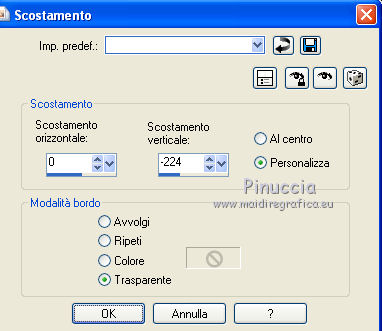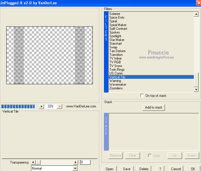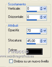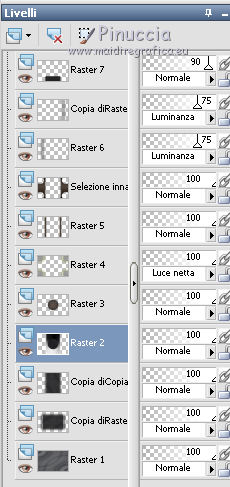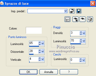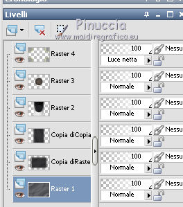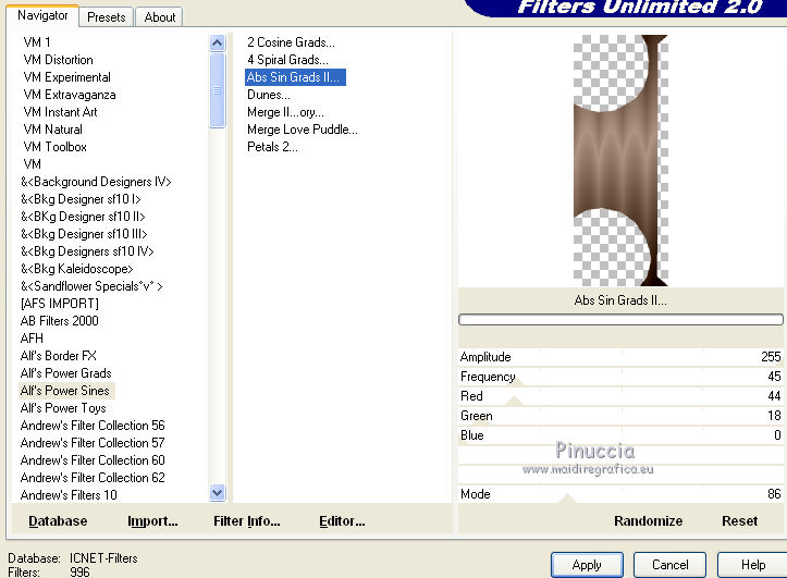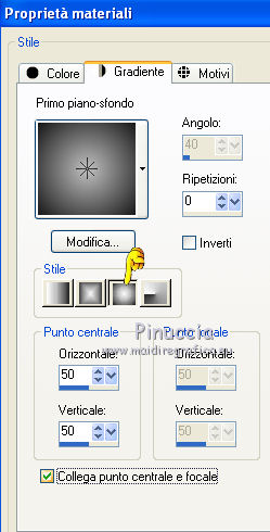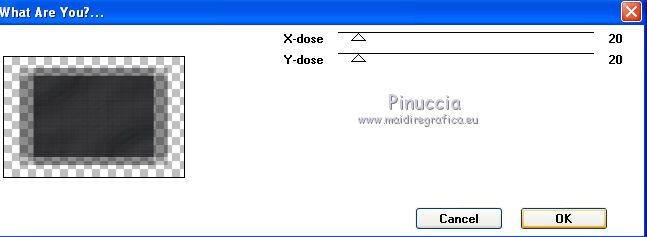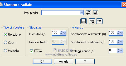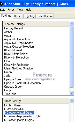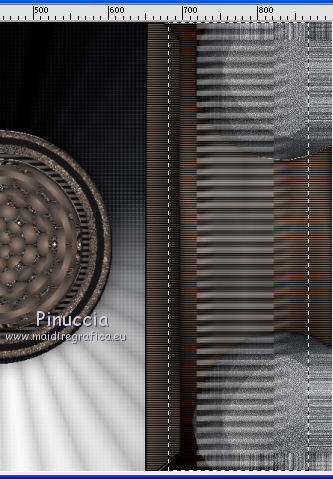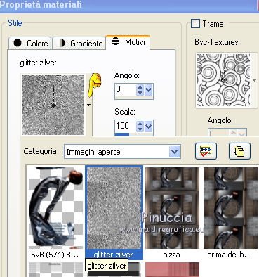 qui puoi trovare qualche risposta ai tuoi dubbi. Se l'argomento che ti interessa non è presente, ti prego di segnalarmelo. Questo tutorial è stato creato con PSP X3, ma può essere eseguito anche con le altre versioni di PSP. Per tradurlo, ho usato PSP X. Occorrente: Materiale qui Per il tube della donna grazie Syl. Grazie a tutti i creatori di tubes per le loro immagini. Lascia intatto il nome del tube. Il © appartiene all'artista originale. Mantieni il credito di chi ha creato il tube. Filtri in caso di dubbi, ricorda di consultare la mia sezione filtri qui Filters Unlimited 2.0 qui Alf's power Sines (da importare in Unlimited) qui Graphics Plus - Cross Shadow qui RCS filter pak 1.0 qui Alien Skin Eye Candy 5 Impact qui Simple qui Toadies qui VanDerLee Unplugged X qui ![]() Se stai usando altri colori e/o materiali, sei libero di sperimentare le modalità di miscelatura più adatte. Metti il preset MDlessen-Aizza-ECGlas nella cartella del filtro. Con un doppio clic sul file il preset sarà automaticamente installato nella cartella corretta. Metti le selezioni nella cartella Selezioni. Apri il motivo argento "glitter zilver" in PSP e minimizzalo con il resto del materiale. 1. Imposta il colore di primo piano con #c0c0c0, e il colore di sfondo con #181819. Passa il colore di primo piano a Gradiente, con i seguenti settaggi. ![]() 2. Apri una nuova immagine trasparente 900 x 600 pixels, e riempila con il gradiente.3. Selezione>Seleziona tutto. Apri il tube SvB(574)beauty e vai a Modifica>Copia. non chiuderlo perchè ti servirà ancora Torna al tuo lavoro e vai a Modifica>Incolla nella selezione. Selezione>Deseleziona. 4. Effetti>Effetti di immagine>Motivo unico. ![]() 5. Regola>Sfocatura>Sfocatura radiale. ![]() 6. Livelli>Duplica. Immagine>Capovolgi. Immagine>Rifletti. Abbassa l'opacità di questo livello al 50%. Livelli>Unisci>Unisci giù. 7. Livelli>Duplica. Effetti>Plugins>RCS filter pak 1.0 - RCS screenworks - Grid. e avrai questo. ![]() 8. Immagine>Ridimensiona, al 75%, tutti i livelli non selezionato. 9. Effetti>Plugins>Toadies - What are you. ![]() 10. Livelli>Duplica. Immagine>Ruota per gradi - 90 gradi a sinistra. ![]() 11. Apri il tube Aizza MD e vai a Modifica>Copia. Torna al tuo lavoro e vai a Modifica>Incolla come nuovo livello. 12. Selezione>Carica/Salva selezione>Carica selezione da disco. Cerca e carica la selezione MDlessen-selectie76. ![]() 13. Livelli>Nuovo livello raster. Selezione>Modifica>Espandi - 1 pixels. Apri deco3_Aizza MD e vai a Modifica>Copia. Torna al tuo lavoro e vai a Modifica>Incolla nella selezione. Selezione>Deseleziona. 14. Effetti>Plugins>Alien Skin Eye Candy 5 Impact - Glass. Seleziona il preset MDlessen-Aizza-ECglas e ok. ![]() 15. Effetti>Effetti 3D>Sfalsa ombra, con il colore nero. ![]() 16. Selezione>Carica/Salva selezione>Carica selezione da disco. Cerca e carica la selezione MDlessen-selectie77. ![]() 17. Livelli>Nuovo livello raster. Passa il colore di primo piano a Motivi, apri il menu e sotto Immagini aperte seleziona il motivo glitter, con i seguenti settaggi. ![]() Riempi la selezione con il motivo argento.Selezione>Deseleziona. 18. Effetti>Plugins>Simple - Top left mirror. 19. Effetti>Plugins>Toadies - What are you, con i settaggi precedenti. Cambia la modalità di miscelatura di questo livello in Luce netta. 20. Selezione>Carica/Salva selezione>Carica selezione da disco. Cerca e carica la selezione MDlessen-selectie79. ![]() Attiva il livello inferiore. ![]() Selezione>Innalza selezione a livello. Livelli>Disponi>Porta in alto. 21. Effetti>Plugins>Filters Unlimited 2.0 - Alf's power sines - Abs Sin Grads II. ![]() 22. Effetti>Effetti di trama>Veneziana, con il colore nero. ![]() 23. Effetti>Plugins>Alien Skin Eye Candy 5 Impact - Glass, con i settaggi precedenti. 24. Effetti>Effetti 3D>Sfalsa ombra, con il colore nero. ![]() Selezione>Deseleziona. 25. Livelli>Duplica. Immagine>Rifletti. Livelli>Unisci>Unisci giù. 26. Selezione>Carica/Salva selezione>Carica selezione da disco. Cerca e carica la selezione MDlessen-selectie78. ![]() 27. Attiva il livello Raster 4. ![]() Premi sulla tastiera il tasto CANC. 28. Livelli>Nuovo livello raster. Imposta il colore di primo piano con #9a8373, e riempi il livello con questo colore.29. Selezione>Modifica>Seleziona bordature selezione. ![]() Livelli>Nuovo livello raster. Riempi con il colore di sfondo.Selezione>Deseleziona. 30. Livelli>Unisci>Unisci giù. Effetti>Effetti di trama>Veneziana, con i settaggi precedenti. se trovi troppo scuro il risultato dell'effetto, puoi applicarlo con il colore di primo piano. Vedi l'esempio in fondo al tutorial con questa variante 31. Apri deco Aizza MD e vai a Modifica>Copia. Torna al tuo lavoro e vai a Modifica>Incolla come nuovo livello. Livelli>Disponi>Porta in alto. 32. Effetti>Plugins>VanderLee - Unplugged X - Vertical Tile. ![]() 33. Livelli>Duplica. Regola>Sfocatura>Sfocatura da movimento. ![]() Livelli>Unisci>Unisci giù. 34. Attiva lo strumento Selezione , rettangolo,e seleziona la parte destra. ![]() Premi sulla tastiera il tasto CANC. Selezione>Deseleziona. Cambia la modalità di miscelatura di questo livello in Luminanza. 35. Livelli>Duplica. Immagine>Rifletti. 36. Apri deco2 Aizza MD e vai a Modifica>Copia. Torna al tuo lavoro e vai a Modifica>Incolla come nuovo livello. 37. Effetti>Effetti di immagine>Scostamento. ![]() Abbassa l'opacità di questo livello al 90%. 38. Attiva nuovamente il tube SvB(574)Beauty, e vai a Modifica>Copia. Torna al tuo lavoro e vai a Modifica>Incolla come nuovo livello. Immagine>Ridimensiona, al 90%, tutti i livelli non selezionato. 39. Effetti>Effetti di immagine>Scostamento. ![]() 40. Attiva il livello Raster 2. ![]() 41. Effetti>Effetti di illuminazione>Sprazzo di luce. ![]() 42. Immagine>Aggiungi bordatura, 2 pixels, simmetriche, con il colore di sfondo. 43. Livelli>Duplica. Immagine>Ridimensiona, all'85%, tutti i livelli non selezionato. Attiva il livello di sfondo. ![]() Regola>Sfocatura>Sfocatura radiale, con i set