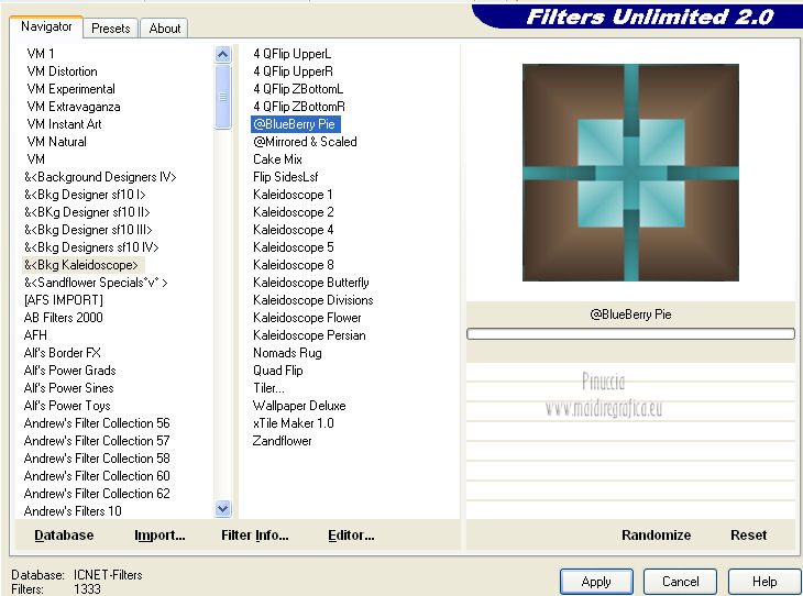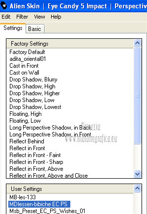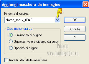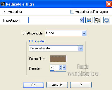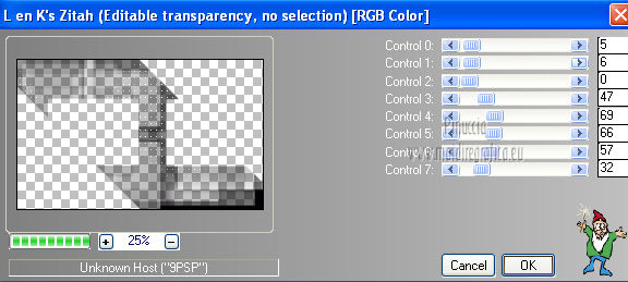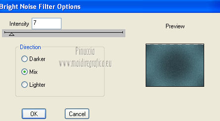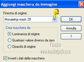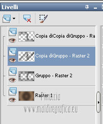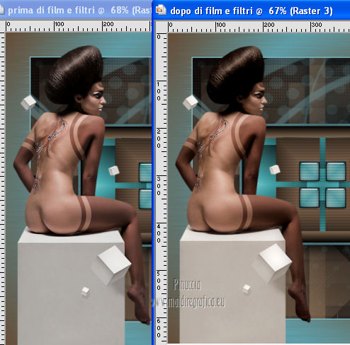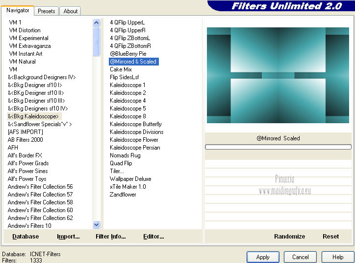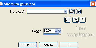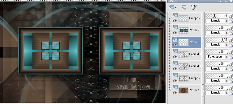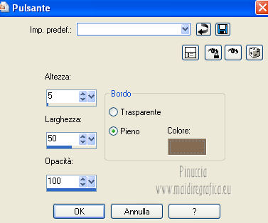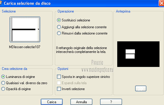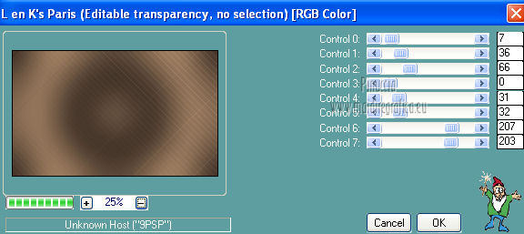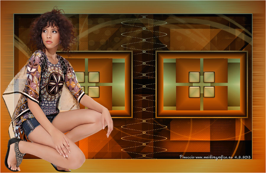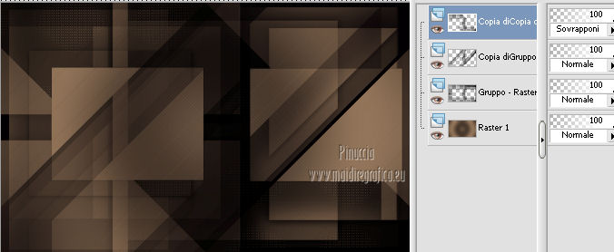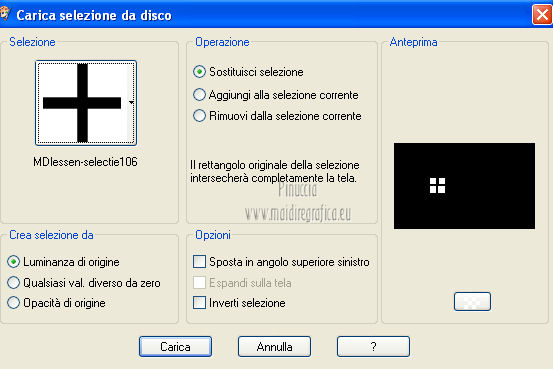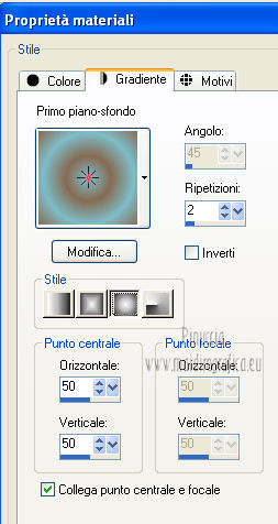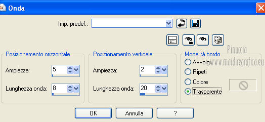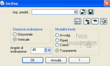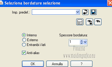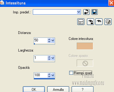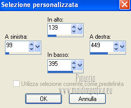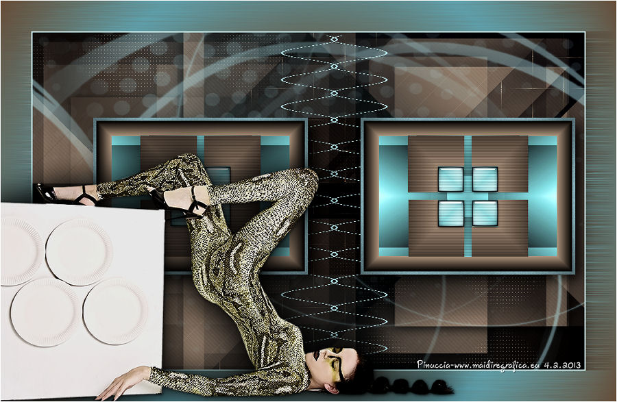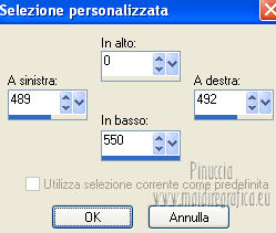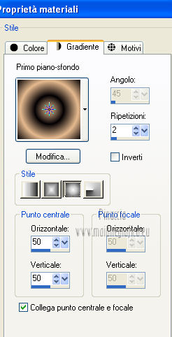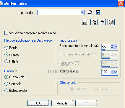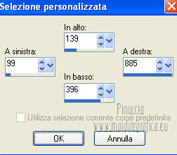 qui puoi trovare qualche risposta ai tuoi dubbi. Se l'argomento che ti interessa non è presente, ti prego di segnalarmelo. Questo tutorial è stato creato con PSP X3, ma può essere eseguito anche con le altre versioni di PSP. Per tradurlo, ho usato PSP X. Occorrente: Materiale qui Per il tube della donna grazie Annelies Una maschera è di Narah La seconda maschera e il resto del materiale sono di Monique Mantieni il credito di chi ha creato il tube. Filtri in caso di dubbi, ricorda di consultare la mia sezione filtri qui Filters Unlimited 2.0 (da importare in Unlimited) qui &<Bkg Kaleidoscope> qui L&K landksiteofwonders - Paris qui L&K landksiteofwonders - Zitah qui Alien Skin Eye Candy 5 Impact - Perspective Shadow qui ![]() Se stai usando altri colori e/o materiali, sei libero di sperimentare le modalità di miscelatura più adatte. Metti il preset MDlessen-bibicheEC PS nella cartella del filtro Alien Skin Eye Candy 5 Impact/Setting/Shadow. Cliccando sul file una o due volte (a seconda delle tue impostazioni), automaticamente il preset si installerà nella cartella corretta. perchè uno o due clic vedi qui Metti le selezioni nella cartella Selezioni. Apri le maschere in PSP e minimizzale con il resto del materiale. Imposta il colore di primo piano con #e5b98e, e il colore di sfondo con #040104. ![]() Passa il colore di primo piano a Gradiente, stile Sprazzo di luce. ![]() 1. Apri una nuova immagine trasparente 900 x 550 pixels, e riempila con il gradiente.2. Regola>Sfocatura>Sfocatura gaussiana - raggio 85. ![]() 3. Effetti>Plugins>L&K landksiteofwonders - L& Paris. ![]() 4. Livelli>Nuovo livello raster. Riempi il livello con il colore di sfondo.5. Livelli>Nuovo livello maschera>Da immagine. Apri il menu sotto la finestra di origine e vedrai la lista dei files aperti. Seleziona la maschera Monaiekje_mask_29, con i seguenti settaggi: ![]() Livelli>Unisci>Unisci gruppo. 6. Livelli>Duplica. Effetti>Effetti geometrici>Inclina. ![]() 7. Di nuovo Livelli>Duplica. Effetti>Effetti geometrici>Inclina. ![]() 8. Effetti>Plugins>L&K landksiteofwonders - L& Zitah. ![]() 9. Cambia la modalità di miscelatura di questo livello in Sovrapponi. ![]() 10. Attiva il livello della prima copia della maschera (copia di gruppo Raster 2). ![]() 11. Effetti>Effetti di trama>Intessitura. Colore intessitura: primo piano #e5b98e. ![]() Regola>Messa a fuoco>Metti a fuoco. 12. Attiva lo strumento Selezione ,clicca sull'icona Selezione personalizzata ![]() e imposta i seguenti settaggi: ![]() Livelli>Nuovo livello raster. Livelli>Disponi>Porta in alto. 13. Cambia il colore di primo piano con #7ebdc8. ![]() Lascia impostato il gradiente (che cambierà tonalità) come colore di primo piano. ![]() Riempi la selezione con il gradiente.14. Regola>Sfocatura>Sfocatura gaussiana - raggio 50. ![]() 15. Effetti>Plugins>DSB Flux - Bright Noise. ![]() 16. Selezione>Modifica>Contrai - 30 pixels. Apri deco_bibiche_MD e vai a Modifica>Copia. Torna al tuo lavoro e vai a Modifica>Incolla nella selezione. 17. Effetti>Effetti 3D>Scalpello - colore #866b53. ![]() 18. Effetti>Plugins>Filters Unlimited 2.0 - &<Bkg Kaleidoscope> - @Mirrored & Scaled. ![]() 19. Selezione>Carica/Salva selezione>Carica selezione da disco. Cerca e carica la selezione MDlessen-selectie107. ![]() Selezione>Modifica>Espandi - 1 pixel. 20. Effetti>Effetti 3D>Pulsante - colore #866b53. ![]() 21. Effetti>Plugins>Filters Unlimited 2.0 - &<Bkg Kaleidoscope> - @BlueBerry Pie. ![]() 22. Effetti>Effetti di trama>Veneziana - colore di sfondo #040104. ![]() 23. Selezione>Carica/Salva selezione>Carica selezione da disco. Cerca e carica la selezione MDlessen-selectie106. ![]() Selezione>Innalza selezione a livello. 24. Effetti>Plugins>Alien Skin Eye Candy 5 Impact - Glass. Seleziona il preset Clear e ok. ![]() 25. Selezione>Modifica>Seleziona bordature selezione. ![]() 26. Riempi la selezione con il colore di sfondo.Selezione>Deseleziona. 27. Livelli>Unisci>Unisci giù. Livelli>Duplica. Immagine>Rifletti. 28. Effetti>Effetti di immagine>Scostamento. ![]() 29. Livelli>Unisci>Unisci giù. 30. Effetti>Plugins>Alien Skin Eye Candy 5 Impact - Perspective Shadow. Seleziona il preset Drop Shadow blurry e ok. ![]() 31. Livelli>Nuovo livello raster. Riporta il colore di primo piano da Gradiente a Colore. Riempi il livello con il colore di primo piano.32. Livelli>Nuovo livello maschera>Da immagine. Apri il menu sotto la finestra di origine e seleziona la maschera Narah_mask_0349, con i seguenti settaggi: ![]() Livelli>Unisci>Unisci gruppo. 33. Effetti>Effetti di immagine>Motivo unico. ![]() Abbassa l'opacità di questo livello al 40%. 34. Selezione personalizzata ![]() ![]() Premi sulla tastiera il tasto CANC. Selezione>Deseleziona. 35. Selezione personalizzata ![]() ![]() 36. Livelli>Nuovo livello raster. Riempi la selezione con il colore di primo piano.Selezione>Deseleziona. 38. Effetti>Effetti di distorsione>Onda. ![]() 39. Livelli>Duplica. Immagine>Rifletti. Livelli>Unisci>Unisci giù. 40. Effetti>Effetti di immagine>Scostamento. ![]() 41. Abbassa l'opacità di questo livello al 75%. Regola>Messa a fuoco>Metti a fuoco. Selezione>Deseleziona. 42. Livelli>Disponi>Sposta giù - 2 volte. ![]() 43. Lascia il colore di primo piano con #7ebdc8. Cambia il colore di sfondo con #866b53. Passa il colore di primo piano a Gradiente, con i settaggi precedenti. ![]() 44. Immagine>Aggiungi bordatura, 2 pixels, simmetriche, con il colore di primo piano. Selezione>Seleziona tutto. Immagine>Aggiungi bordatura, 50 pixels, simmetriche, con il colore di sfondo. 45. Effetti>Effetti 3D>Sfalsa ombra, con il colore nero. ![]() Selezione>Inverti. 46. Livelli>Nuovo livello raster. Riempi con il gradiente.47. Effetti>Plugins>DSB Flux - Blast. ![]() 48. Livelli>Duplica. Selezione>Deseleziona. Immagine>Rifletti. Cambia la modalità di miscelatura di questo livello in Moltiplica, e abbassa l'opacità al 50%. 49. Apri il tube Alies 12VR53-woman-24012013 e vai a Modifica>Copia. Torna al tuo lavoro e vai a Modifi