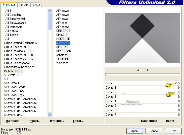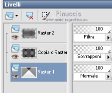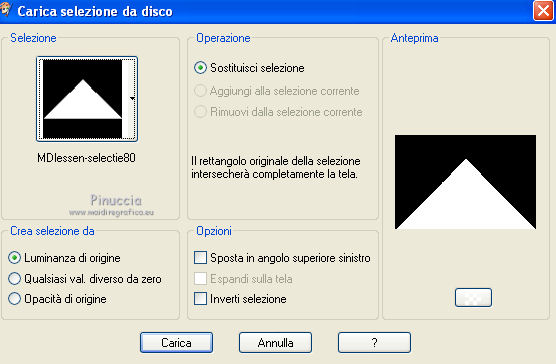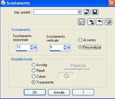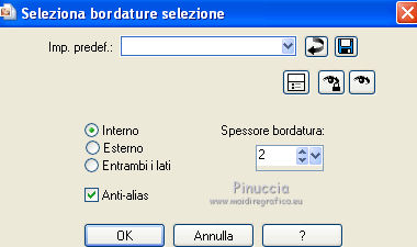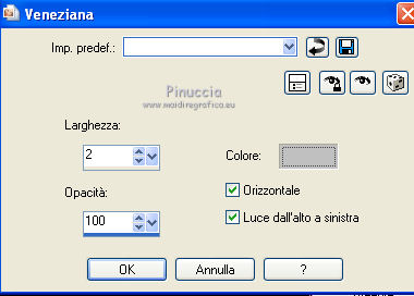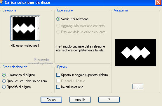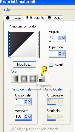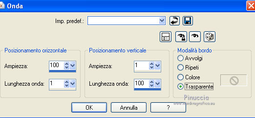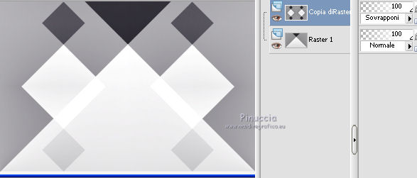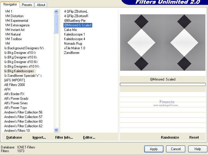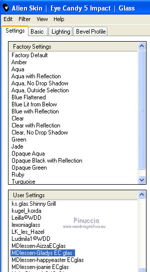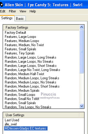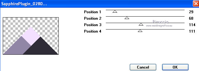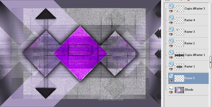 qui puoi trovare qualche risposta ai tuoi dubbi. Se l'argomento che ti interessa non è presente, ti prego di segnalarmelo. Questo tutorial è stato creato con PSP X3, ma può essere eseguito anche con le altre versioni di PSP. Per tradurlo, ho usato PSP X. Occorrente: Materiale qui Per i tubes grazie Mary Lascia intatto il nome del tube. Il © appartiene all'artista originale. Mantieni il credito di chi ha creato il tube. Filtri in caso di dubbi, ricorda di consultare la mia sezione filtri qui Filters Unlimited 2.0 qui AFS IMPORT (da importare in Unlimited) qui &<Background Kaleidoscope> (da importare in Unlimited) qui Alien Skin Eye Candy 5 Textures qui Alien Skin Eye Candy 5 Impact qui Graphics Plus qui Sapphire filters 03 qui ![]() Se stai usando altri colori e/o materiali, sei libero di sperimentare le modalità di miscelatura più adatte. Metti i preset MDlessen-gladys-ECGlas e MDlessen-gladys-EC Textures nelle rispettive cartelle del filtro. Con un doppio clic sul file il preset sarà automaticamente installato nella cartella corretta. Metti le selezioni nella cartella Selezioni. 1. Imposta il colore di primo piano con #ffffff, e il colore di sfondo con #252329. Passa il colore di primo piano a Gradiente, con i seguenti settaggi. ![]() 2. Apri una nuova immagine trasparente 900 x 600 pixels, e riempila con il gradiente.3. Livelli>Duplica. Immagine>Rifletti. Abbassa l'opacità di questo livello al 50%. Livelli>Unisci>Unisci giù. 4. Livelli>Duplica. Effetti>Plugins>Filters Unlimited 2.0 - AFS IMPORT - Mirroff. ![]() 5. Effetti>Plugins>Filters Unlimited 2.0 - &<Bkg Kaleidoscope> - Mirrored & Scaled. ![]() 6. Cambia la modalità di miscelatura di questo livello in Sovrapponi. ![]() 7. Immagine>Ridimensiona, all'85%, tutti i livelli non selezionato. Effetti>Effetti di trama>Veneziana - colore nero. ![]() 8. Apri Monaikje ag10 e vai a Modifica>Copia. Torna al tuo lavoro e vai a Modifica>Incolla come nuovo livello. Immagine>Ridimensiona, all'85%, tutti i livelli non selezionato. Cambia la modalità di miscelatura di questo livello in Filtra. 9. Selezione>Carica/Salva selezione>Carica selezione da disco. Cerca e carica la selezione MDlessen-selectie80. ![]() 10. Attiva il livello Raster 1. ![]() Selezione>Innalza selezione a livello. 11. Imposta il colore di primo piano con #c3b3df, e riempi la selezione con questo colore.Selezione>Deseleziona. 12. Effetti>Plugins>Sapphire Filters 03 - Sapphireplugins_0280. ![]() 13. Livelli>Duplica. Immagine>Capovolgi. 14. Selezione>Carica/Salva selezione>Carica selezione da disco. Cerca e carica la selezione MDlessen-selectie83. ![]() 15. Livelli>Nuovo livello raster. Imposta il colore di primo piano con #554f60, e riempi la selezione con questo colore.16. Effetti>Plugins>Graphics Plus - Cross Shadow, con i settaggi standard. ![]() Selezione>Deseleziona. 17. Livelli>Duplica. Immagine>Rifletti. Livelli>Unisci>Unisci tutto. 18. Selezione>Carica/Salva selezione>Carica selezione da disco. Cerca e carica la selezione MDlessen-selectie81. ![]() 19. Livelli>Nuovo livello raster. Modifica>Incolla nella selezione (il tube Monaiekje ag10 dovrebbe essere ancora in memoria, se così non fosse attivalo e copialo nuovamente). 20. Effetti>Effetti 3D>Sfalsa ombra, con il colore nero. ![]() Ripeti l'Effetto Sfalsa ombra, cambiando verticale e orizzontale con -8. 21. Effetti>Plugins>Alien Skin Eye Candy 5 Impact - Glass. Seleziona il preset MDlessen-Gladys EC glas e ok. ![]() Cambia la modalità di miscelatura di questo livello in Luminanza. 22. Livelli>Duplica. Selezione>Deseleziona. 23. Effetti>Effetti di immagine>Motivo unico. ![]() Cambia la modalità di miscelatura di questo livello in Indebolisci. 24. Effetti>Effetti di trama>Veneziana, con i settaggi precedenti. 25. Selezione>Carica/Salva selezione>Carica selezione da disco. Cerca e carica la selezione MDlessen-selectie82. ![]() 26. Livelli>Nuovo livello raster. Riempi la selezione con il colore di sfondo.27. Effetti>Plugins>Alien Skin Eye Candy 5 Textures - Swirl. Seleziona il preset MDlessen-Gladys EC textures e ok. ![]() 27. Effetti>Plugins>Alien Skin Eye Candy 5 Impact – Glass, seleziona il preset Clear e ok. ![]() 28. Selezione>Modifica>Seleziona bordature selezione. ![]() 29. Livelli>Nuovo livello raster. Riempi la selezione con il colore di sfondo.30. Effetti>Effetti di trama>Veneziana - colore #c0c0c0. ![]() Selezione>Deseleziona. 31. Livelli>Unisci>Unisci giù. 32. Effetti>Plugins>Mura's Meister - Copies. ![]() 33. Immagine>Ridimensiona, all'85%, tutti i livelli non selezionato. 34. Immagine>Ruota per gradi - 90 gradi a destra. ![]() 35. Effetti>Effetti di immagine>Scostamento. ![]() 36. Livelli>Duplica. Effetti>Effetti di immagine>Scostamento. ![]() 37. Livelli>Unisci>Unisci giù. Immagine>Rifletti. 38. Effetti>Effetti 3D>Sfalsa ombra, con il colore nero. ![]() 39. Selezione>Carica/Salva selezione>Carica selezione da disco. Carica nuovamente la selezione MDlessen-selectie82. ![]() 40. Livelli>Nuovo livello raster. Riempi la selezione con il colore di sfondo.41. Effetti>Plugins>Alien Skin Eye Candy 5 Impact - Glass, con i settaggi precedenti. Selezione>Deseleziona. 42. Livelli>Duplica. Immagine>Capovolgi. 43. Selezione>Carica/Salva selezione>Carica selezione da disco. Cerca e carica la selezione MDlessen-selectie84. ![]() 44. Livelli>Nuovo livello raster. Riempi la selezione con il colore di sfondo.45. Selezione>Deseleziona. Livelli>Disponi>Sposta giù. 46. Selezione>Carica/Salva selezione>Carica selezione da disco. Carica nuovamente la selezione MDlessen-selectie84. ![]() 47. Livelli>Nuovo livello raster. Imposta il colore di primo piano con #ffffff. Riempi la selezione con questo colore.Selezione>Deseleziona. 48. Effetti>Effetti di distorsione>Onda. ![]() Livelli>Disponi>Porta sotto, e il livello si posizionerà sopra il livello inferiore di sfondo. ![]() 49. Immagine>Aggiungi bordatura, 1 pixel, simmetriche, con il colore di primo piano (#ffffff). Livelli>Duplica. Immagine>Ridimensiona, all'85%, tut
