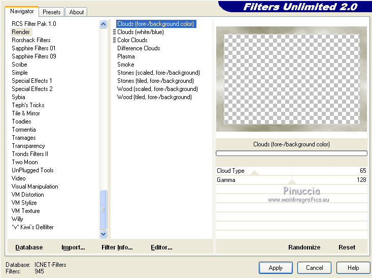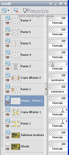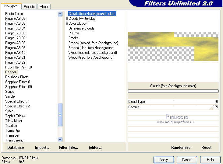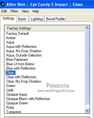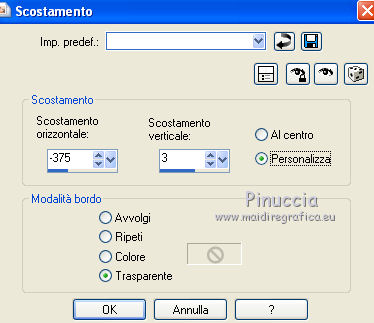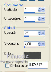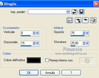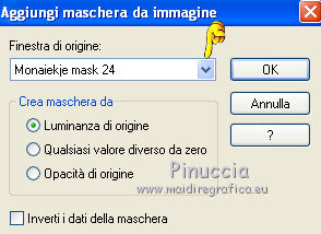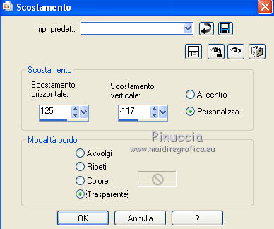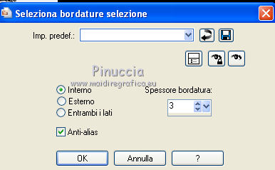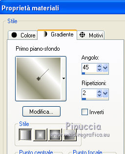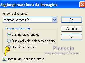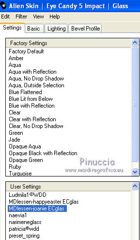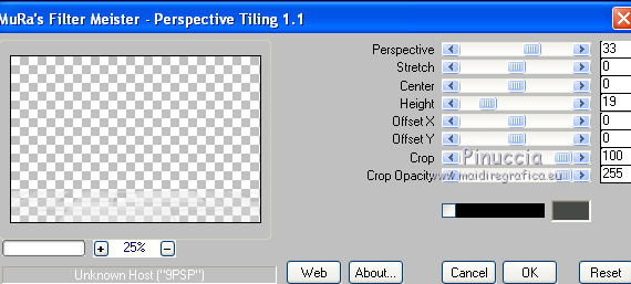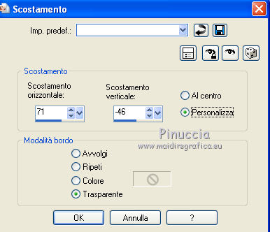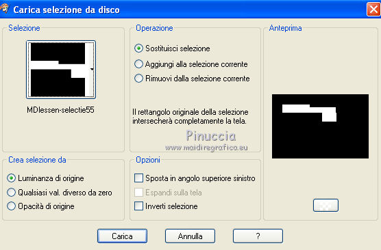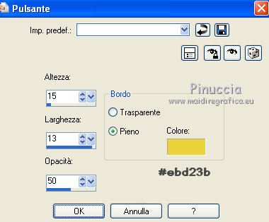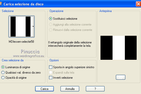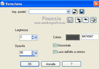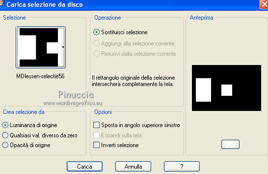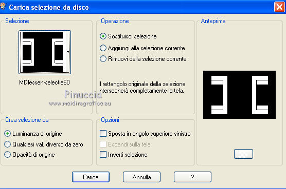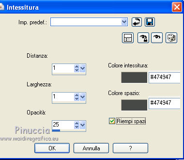 qui puoi trovare qualche risposta ai tuoi dubbi. Se l'argomento che ti interessa non è presente, ti prego di segnalarmelo. Questo tutorial è stato creato con PSP X3, ma può essere eseguito anche con le altre versioni di PSP. Per tradurlo, ho usato PSP X. Occorrente: Materiale qui Il tube della donna è di Joanie I tubes deco sono di Athenais La trama è di Cameron Il resto del materiale è di Monique. Grazie a tutti i creatori di tubes per le loro immagini. Lascia intatto il nome del tube. Il © appartiene all'artista originale. Mantieni il credito di chi ha creato il tube. Filtri in caso di dubbi, ricorda di consultare la mia sezione filtri qui Filters Unlimited 2.0 qui Simple qui Mura's Meister - Perspective Tiling qui Alien Skin Eye Candy 5 Impact qui ![]() Se stai usando altri colori e/o materiali, sei libero di sperimentare le modalità di miscelatura più adatte. Metti il preset MDlessen-joanieECglass nella cartella del filtro Alien Skin Eye Candy 5 Impact>Settings>Glass. Doppio clic sul file e il preset sarà automaticamente installato. Se preferisci puoi importarlo, quando ti servirà, dalla cartella in cui hai scompattato il materiale. Vedi la scheda del filtro qui e come importare un preset in Eye Candy qui Metti le selezioni nella cartella Selezioni. Apri la maschera in PSP e minimizzala con il resto del materiale. Imposta il colore di primo piano con #ebd23b, e il colore di sfondo con #474947. 1. Apri una nuova immagine trasparente 900 x 600 pixels, e riempila con il colore di primo piano.2. Livelli>Nuovo livello raster. Riempi con il colore di sfondo.3. Livelli>Nuovo livello maschera>Da immagine. Apri il menu sotto la finestra di origine e vedrai la lista dei files aperti. Seleziona la maschera Monaiekje_mask24. ![]() Livelli>Unisci>Unisci tutto. 4. Selezione>Seleziona tutto. Selezione>Modifica>Contrai - 45 pixels. ![]() Selezione>Innalza selezione a livello. 5. Effetti>Effetti 3D>Sfalsa ombra, con il colore nero. ![]() 6. Selezione>Carica/Salva selezione>Carica selezione da disco. Cerca e carica la selezione MDlessen-selectie55. ![]() 7. Selezione>Modifica>Espandi - 1 pixel. ![]() 8. Livelli>Nuovo livello raster. Riempi la selezione con il colore di primo piano.9. Effetti>Plugins>Filters Unlimited 2.0 - Render - Clouds (fore-/background color). ![]() Selezione>Deseleziona. 10. Effetti>Effetti di distorsione>Vento - da destra, intensità 100. ![]() 11. Livelli>Duplica. Immagine>Rifletti. Livelli>Unisci>Unisci giù. 12. Livelli>Duplica. Immagine>Capovolgi. 13. Effetti>Effetti di immagine>Scostamento. ![]() Livelli>Unisci>Unisci giù. Effetti>Effetti di bordo>Aumenta. Abbassa l'opacità di questo livello al 65%. ![]() 14. Livelli>Nuovo livello raster. Imposta il colore di primo piano con #ffffff, e riempi il livello con questo colore.15. Livelli>Nuovo livello maschera>Da immagine. Apri il menu sotto la finestra di origine e carica nuovamente la maschera Monaiekje_mask24, questa volta seleziona "Inverti i dati della maschera". ![]() Livelli>Unisci>Unisci gruppo. 16. Effetti>Effetti 3D>Sfalsa ombra, con il colore di sfondo. ![]() Effetti>Effetti di bordo>Aumenta. 17. Attiva il livello sottostante Raster 1. Livelli>Duplica. 18. Immagine>Ruota per gradi - 90 gradi a sinistra. ![]() 19. Effetti>Effetti 3D>Sfalsa ombra, con il colore nero. ![]() 20. Selezione>Carica/Salva selezione>Carica selezione da disco. Cerca e carica la selezione MDlessen-selectie56. ![]() 21. Selezione>Modifica>Espandi - 1 pixel. Attiva il livello superiore. Livelli>Nuovo livello raster. Riempi la selezione con il colore di primo piano.22. Apri la trama texturacameron_horizon4 e vai a Modifica>Copia. Torna al tuo lavoro e vai a Modifica>Incolla nella selezione. Cambia la modalità di miscelatura di questo livello in Luminanza. 23. Selezione>Modifica>Seleziona bordature selezione. ![]() 24. Livelli>Nuovo livello raster. Riempi la selezione con il colore di sfondo.Selezione>Deseleziona. 25. Livelli>Duplica. Effetti>Effetti di immagine>Scostamento. ![]() 26. Livelli>Duplica. Effetti>Effetti di immagine>Scostamento. ![]() 27. Livelli>Unisci>Unisci giù - 3 volte - per unire i livelli dei due bordi con quello della trama. Livelli>Duplica. 28. Effetti>Plugins>Simple - Top Left Mirror. ![]() 29. Selezione>Carica/Salva selezione>Carica selezione da disco. Cerca e carica la selezione MDlessen-selectie58. ![]() 30. Livelli>Nuovo livello raster. Riempi la selezione con il colore di primo piano.31. Effetti>Effetti di trama>Intessitura entrambi i colori impostati con il colore di sfondo. ![]() Abbassa l'opacità di questo livello al 20%. 32. Selezione>Carica/Salva selezione>Carica selezione da disco. Cerca e carica la selezione MDlessen-selectie57. ![]() 33. Selezione>Modifica>Espandi - 1 pixel. 34. Livelli>Nuovo livello raster. Riempi la selezione con il colore di primo piano.35. Effetti>Plugins>Alien Skin Eye 5 Impact - Glass. Seleziona il preset MDlessen-joanie ECglas e ok. ![]() 36. Selezione>Carica/Salva selezione>Carica selezione da disco. Cerca e carica la selezione MDlessen-selectie59. ![]() 37. Selezione>Modifica>Espandi - 1 pixel. Livelli>Nuovo livello raster. Imposta nuovamente il colore di primo piano con #ebd23b, e riempi la selezione con questo colore.38. Effetti>Effetti 3D>Pulsante - con il colore di primo piano. ![]() 39. Effetti>Plugins>Alien Skin Eye 5 Impact - Glass. Seleziona il preset Clear e ok. ![]() 40. Selezione>Carica/Salva selezione>Carica selezione da disco. Cerca e carica la selezione MDlessen-selectie60. ![]() 41. Selezione>Modifica>Espandi - 1 pixel. Livelli>Nuovo livello raster. 42. Effetti>Effetti 3D>Ritaglio, con il colore nero. ![]() 43. Effetti>Effetti di trama>Veneziana - colore di sfondo. ![]() 44. Effetti>Effetti di bordo>Aumenta. Selezione>Deseleziona. 45. Apri il tube element Joanie MD e vai a Modifica>Copia. Torna al tuo lavoro e vai a Modifica>Incolla come nuovo livello. 46. Effetti>Effetti di immagine>Scostamento. ![]() 47. Livelli>Duplica. Immagine>Rifletti. Livelli>Unisci>U