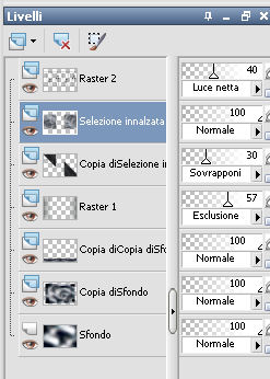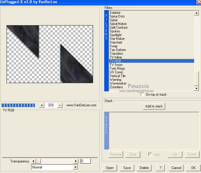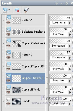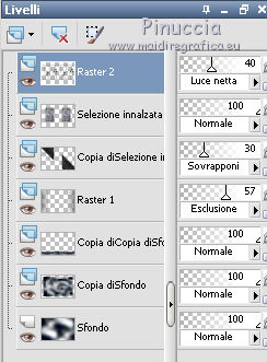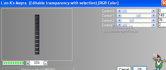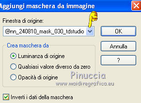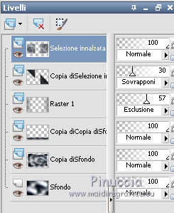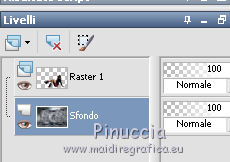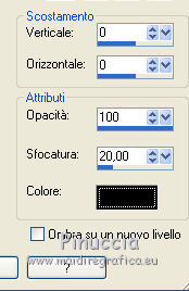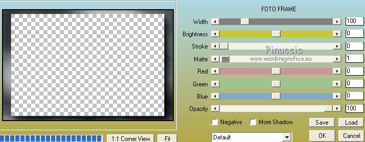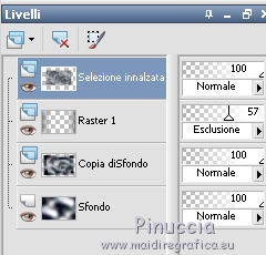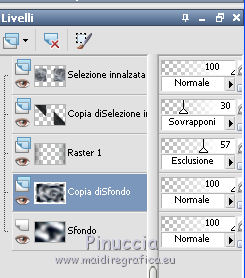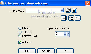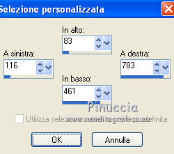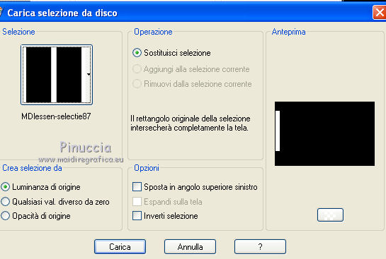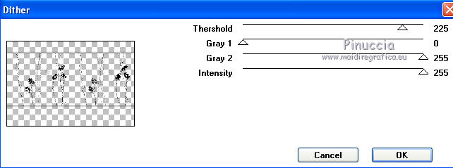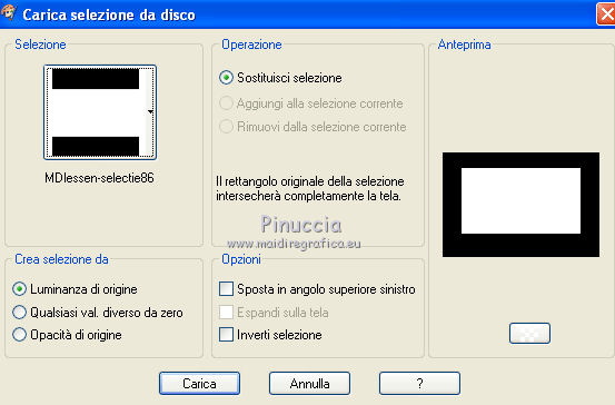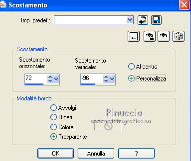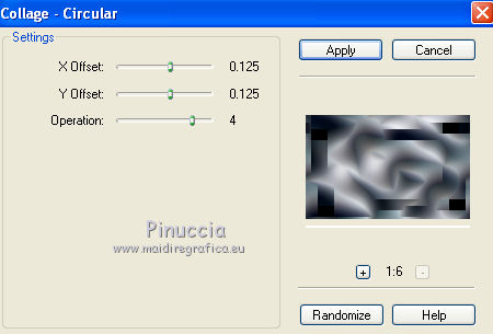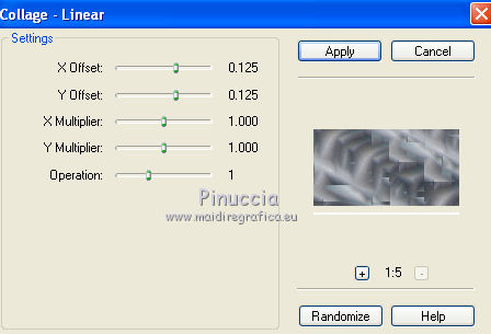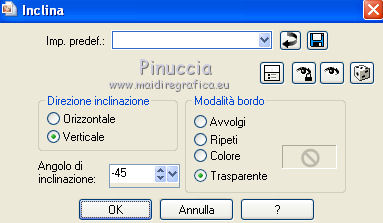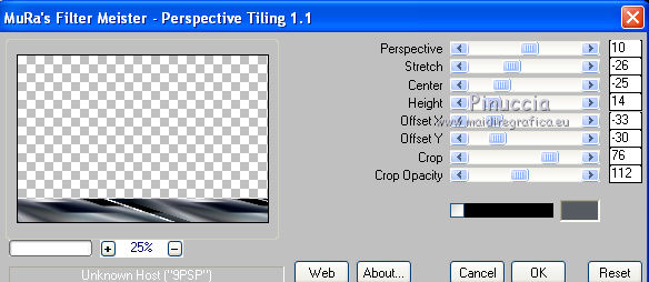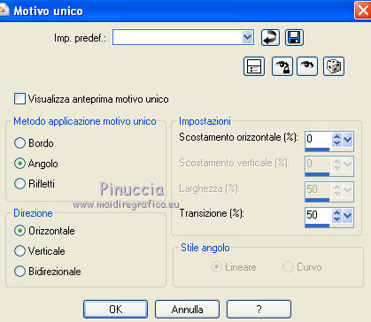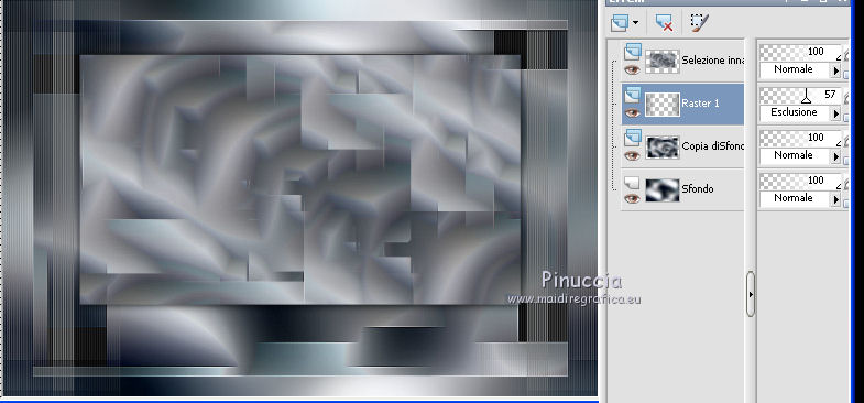 qui puoi trovare qualche risposta ai tuoi dubbi. Se l'argomento che ti interessa non è presente, ti prego di segnalarmelo. Questo tutorial è stato creato con PSP X3, ma può essere eseguito anche con le altre versioni di PSP. Per tradurlo, ho usato PSP X. Occorrente: Materiale qui Per il tube della donna grazie Tocha. Per il tube dei fiori grazie Nicole. Per la maschera grazie @nn Il resto del materiale è di Monaiekje. Lascia intatto il nome del tube. Il © appartiene all'artista originale. Mantieni il credito di chi ha creato il tube. Filtri in caso di dubbi, ricorda di consultare la mia sezione filtri qui AAA Frames - Foto Frame qui Visual Manipulation qui L&K - L&K Mayra qui Mura's Meister - Perspective Tiling qui Simple - Left Right Wrap (bonus) qui Toadies qui VanDerLee - Unplugged-X qui FM Tile Tools qui ![]() Se stai usando altri colori e/o materiali, sei libero di sperimentare le modalità di miscelatura più adatte. Metti le selezioni nella cartella Selezioni. Apri la maschera in PSP e minimizzala con il resto del materiale. 1. Imposta il colore di primo piano con #ffffff, e il colore di sfondo con #565b61. Apri l'immagine Monaiekje ag11. Duplicala usando la combinazione di tasti maiuscola+D (o Finestra>Duplica), e chiudi l'originale. La copia sarà la base del tuo lavoro. 2. Livelli>Duplica. Immagine>Ridimensiona, al 90%, tutti i livelli non selezionato. 3. Effetti>Plugins>FM Tile Tools - Collage-circular. ![]() Effetti>Effetti di bordo>Aumenta. 4. Attiva lo strumento Selezione ,clicca sull'icona Selezione personalizzata ![]() e imposta i seguenti settaggi: ![]() Selezione>Innalza selezione a livello. 5. Effetti>Plugins>FM Tile Tools - Collage-Linear. ![]() 6. Effetti>Effetti 3D>Sfalsa ombra, con il colore nero. ![]() 7. Selezione>Carica/Salva selezione>Carica selezione da disco. Cerca e carica la selezione MDlessen-selectie85. ![]() Livelli>Nuovo livello raster. Riempi la selezione con il colore di primo piano.8. Effetti>Effetti di trama>Veneziana, con il colore nero. ![]() Selezione>Deseleziona. 9. Effetti>Plugins>Toadies - What are you. ![]() Ripeti l'Effetto con gli stessi settaggi. 10. Livelli>Disponi>Sposta giù. Livelli>Duplica. Immagine>Rifletti. Livelli>Unisci>Unisci giù. 11. Cambia la modalità di miscelatura di questo livello in Esclusione, e abbassa l'opacità al 57%. Effetti>Effetti di bordo>Aumenta. 12. Dovresti avere questo. ![]() 13. Attiva il livello Selezione innalzata. ![]() Effetti>Plugins>Simple - Left right wrap. 14. Livelli>Duplica. Effetti>Effetti geometrici>Inclina. ![]() 15. Effetti>Plugins>VanDerLee - Unplugged X - TV RGB. ![]() 16. Livelli>Disponi>Sposta giù. Cambia la modalità di miscelatura di questo livello in Sovrapponi, e abbassa l'opacità al 30%. 17. Attiva il livello copia di sfondo. ![]() Livelli>Duplica. 18. Effetti>Plugins>Mura's Meister - Perspective Tiling. ![]() 19. Livelli>Duplica. Immagine>Rifletti. Abbassa l'opacità di questo livello al 50%. Livelli>Unisci>Unisci giù. 20. Effetti>Effetti 3D>Sfalsa ombra, con il colore nero. ![]() Ripeti l'Effetto Sfalsa ombra, cambiando verticale e orizzontale con 5/-10. ![]() 21. Selezione>Carica/Salva selezione>Carica selezione da disco. Cerca e carica la selezione MDlessen-selectie86. ![]() 22. Attiva il livello superiore - Selezione innalzata. ![]() 23. Livelli>Nuovo livello raster. Apri Nicole-fleur1-2012 e vai a Modifica>Copia. Torna al tuo lavoro e vai a Modifica>Incolla nella selezione 24. Effetti>Effetti 3D>Sfalsa ombra, con il colore nero. ![]() Selezione>Deseleziona. 25. Effetti>Effetti di immagine>Motivo unico. ![]() 26. Effetti>Plugins>Visual Manipulation - Dither. ![]() Cambia la modalità di miscelatura di questo livello in Luce netta, e abbassa l'opacità al 40%. 27. Effetti>Effetti 3D>Sfalsa ombra, con il colore nero. ![]() 28. Attiva nuovamente il livello Selezione innalzata. ![]() 29. Selezione>Seleziona tutto. Selezione>Mobile. Selezione>Immobilizza. 30. Selezione>Modifica>Seleziona bordature selezione. ![]() Riempi la selezione con il colore di primo piano.Selezione>Deseleziona. 31. Effetti>Effetti di immagine>Motivo unico, con i settaggi precedenti. ![]() 32. Effetti>Effetti 3D>Sfalsa ombra, con il colore nero. ![]() 33. Dovresti avere questo. ![]() 34. Attiva il livello superiore - Raster 2. ![]() Effetti>Effetti di bordo>Aumenta. 35. Livelli>Nuovo livello raster. Riempi con il colore di primo piano.36. Livelli>Nuovo livello maschera>Da immagine. Apri il menu sotto la finestra di origine e vedrai la lista dei files aperti. Seleziona la maschera @_240810_mask_030_tdstudio, con i seguenti settaggi: ![]() Livelli>Unisci>Unisci gruppo. 37. Effetti>Plugins>Toadies - What are you, con i settaggi precedenti. 38. Effetti>Effetti di distorsione>Vento - da sinistra, intensità 100. ![]() 39. Nella paletta dei livelli porta questo livello sotto il livello del "pavimento", creato dal filtro Mura's. ![]() Abbassa l'opacità di questo livello al 50%. 40. Immagine>Aggiungi bordatura, 1 pixel, simmetriche, con il colore di primo piano. 41. Modifica>Copia. 42. Immagine>Aggiungi bordatura, simmetriche non selezionato, con il colore di sfondo. ![]() 43. Attiva lo strumento Bacchetta magica ![]() ![]() Clicca nel bordo per selezionarlo. Modifica>Incolla nella selezione. 44. Selezione>Innalza selezione a livello. Selezione>Inverti. 45. Effetti>Effetti 3D>Sfalsa ombra, con i settaggi precedenti. 46. Selezione>Inverti. Effetti>Plugins>AAA Frames - Foto Frame. ![]() 47. Selezione>Seleziona tutto. Selezione>Modifica>Contrai - 15 pixels. 48. Effetti>Effetti 3D>Sfalsa ombra, con i settaggi precedenti. 49. Immagine>Aggiungi bordatura, 1 pixel, simmetriche, con il colore di primo piano. Selezione>Deseleziona. 50. Apri il tube Tocha23813 e vai a Modifica>Copia. Torna al tuo lavoro e vai a Modifica>Incolla come nuovo livello. Immagine>Ridimensiona, all'85%, tutti i livelli non selezionato. 51. Effetti>Effetti di immagine>Scostamento. ![]() 52. Effetti>Effetti 3D>Sfalsa ombra, con il colore nero. ![](