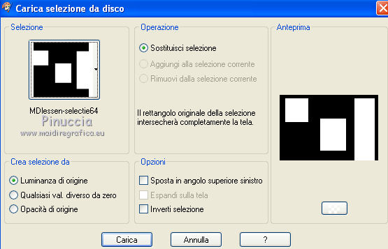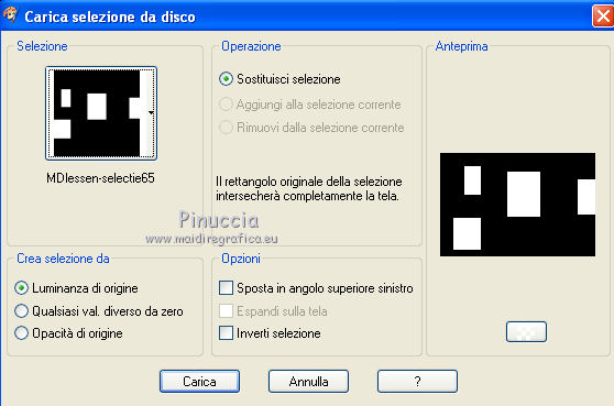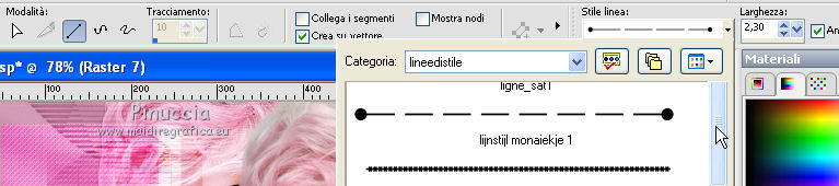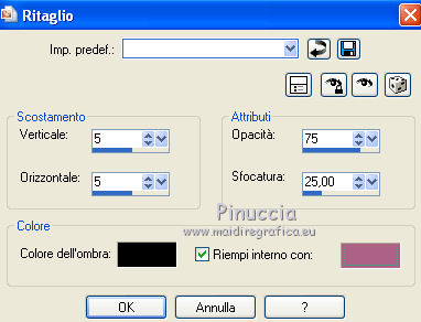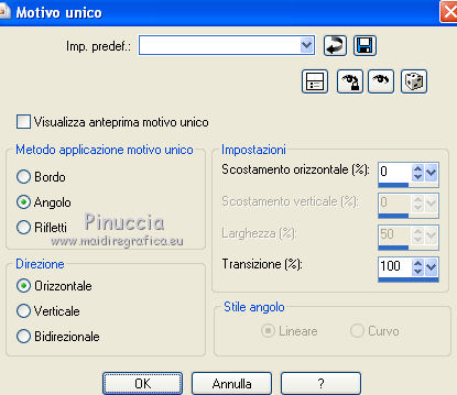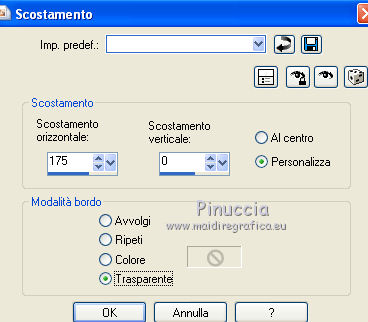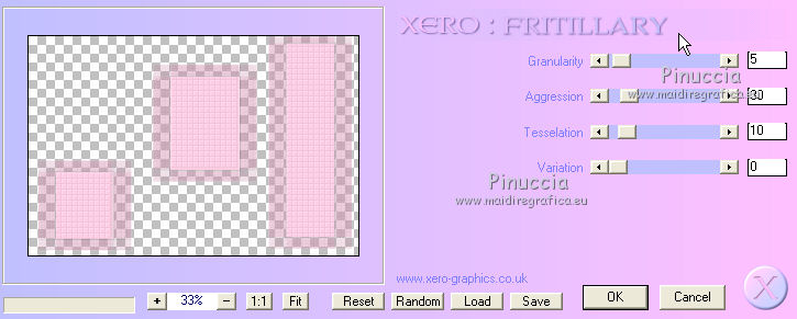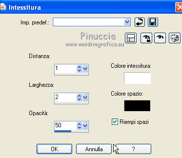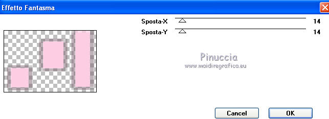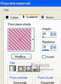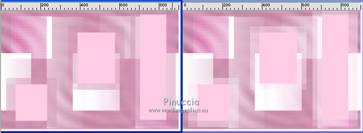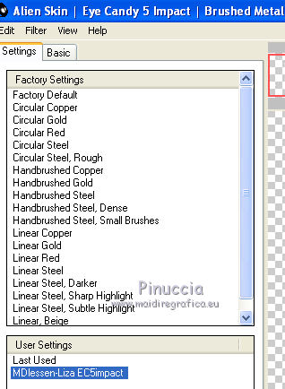 qui puoi trovare qualche risposta ai tuoi dubbi. Se l'argomento che ti interessa non è presente, ti prego di segnalarmelo. Questo tutorial è stato creato con PSP X3, ma può essere eseguito anche con le altre versioni di PSP. Per tradurlo, ho usato PSP X. Le vostre versioni qui Occorrente: Materiale qui Il tube della donna è di Liza Grazie a tutti i creatori di tubes per le loro immagini. Lascia intatto il nome del tube. Il © appartiene all'artista originale. Mantieni il credito di chi ha creato il tube. Filtri in caso di dubbi, ricorda di consultare la mia sezione filtri qui L&K - L&K Zitah qui Xero - Fritillary qui Alien Skin Eye Candy 5 Impact qui Italian Editors Effect qui I filtri Italian Editors si possono usare da soli e anche importati in Filters Unlimited. Spesso i risultati sono differenti, ma potrai verificarli soltanto lavorando. ![]() Se stai usando altri colori e/o materiali, sei libero di sperimentare le modalità di miscelatura più adatte. Metti il preset MDlessen-Liza EC5Impact nella cartella del filtro. Doppio clic sul file e il preset sarà automaticamente importato nella corretta cartella. Metti lijnstij_monaiekje 1 nella cartella Linee di stile. Metti le selezioni nella cartella Selezioni. 1. Imposta il colore di primo piano con #fdcde4, e il colore di sfondo con #ad6187. Passa il colore di primo piano a Gradiente, stile Lineare. ![]() Apri una nuova immagine bianca 900 x 600 pixels. Clicca con il tasto destro del mouse sulla paletta del colore e avrai la tabellina dei colori recenti. In basso a destra trovi sempre la palettina del colore bianco, clicca sulla palettina e avrai il colore impostato. ![]() 2. Livelli>Nuovo livello raster. Riempi con il gradiente.3. Regola>Sfocatura>Sfocatura radiale. ![]() 4. Selezione>Carica/Salva selezione>Carica selezione da disco. Cerca e carica la selezione MDlessen-selectie64. ![]() Premi sulla tastiera il tasto CANC. Selezione>Deseleziona. 5. Effetti>Effetti di immagine>Motivo unico. ![]() 6. Effetti>Plugins>L and K landksiteofwonders - L & K's - Zitah. ![]() 7. Selezione>Carica/Salva selezione>Carica selezione da disco. Carica nuovamente la selezione MDlessen-selectie64. ![]() 8. Livelli>Nuovo livello raster. Riempi la selezione con il colore di sfondo.Mantieni selezionato. 9. Effetti>Effetti di trama>Intessitura: colore intessitura: bianco - riempi spazi: nero ![]() Cambia la modalità di miscelatura di questo livello in Sovrapponi. 10. Livelli>Nuovo livello raster. Riporta il colore di primo piano da Gradiente al colore iniziale. Riempi la selezione con il colore di primo piano.Selezione>Deseleziona. Immagine>Capovolgi. 11. Effetti>Plugins>Italian Editors Effect - Effetto Fantasma. ![]() In questo caso il risultato sarebbe differente importando il filtro in Unlimited. Per curiosità, vedi sotto la differenza tra i due usi a sinistra da solo e a destra in Unlimited. Per il tutorial ho usato il filtro da solo, per seguire l'esempio dell'autrice. ![]() Effetti>Effetti di bordo>Aumenta. 12. Effetti>Plugins>Xero - Fritillary. ![]() 13. Livelli>Duplica. Immagine>Rifletti. Immagine>Ridimensiona, all'80%, tutti i livelli non selezionato. Cambia la modalità di miscelatura di questo livello in Moltiplica. ![]() 14. Effetti>Effetti di immagine>Motivo unico, con i settaggi precedenti. Livelli>Disponi>Sposta giù. 15. Attiva il livello superiore - Raster 3. 16. Selezione>Carica/Salva selezione>Carica selezione da disco. Cerca e carica la selezione MDlessen-selectie65. ![]() Selezione>Innalza selezione a livello. 17. Apri tekst-LizaMD e vai a Modifica>Copia. Torna al tuo lavoro e vai a Modifica>Incolla nella selezione. Selezione>Deseleziona. 18. Effetti>Effetti di immagine>Motivo unico, con i settaggi precedenti. Cambia la modalità di miscelatura di questo livello in Sovrapponi. 19. Selezione>Carica/Salva selezione>Carica selezione da disco. Cerca e carica la selezione MDlessen-selectie66. ![]() 20. Attiva il livello copia di Raster 3. ![]() Selezione>Innalza selezione a livello. 21. Effetti>Effetti 3D>Ritaglio. Colore dell'ombra: nero - Riempi interno con: colore di sfondo. ![]() Selezione>Deseleziona. 22. Effetti>Effetti di distorsione>Onda. ![]() 23. Effetti>Effetti di immagine>Motivo unico, con i settaggi precedenti. 24. Attiva il livello superiore. Modifica>Incolla conme nuovo livello (il tube tekst-LizaMD è ancora in memoria). 25. Effetti>Effetti di immagine>Scostamento. ![]() Cambia la modalità di miscelatura di questo livello in Filtra. 26. Livelli>Duplica. Cambia la modalità di miscelatura di questo livello in Sovrapponi. 27. Apri il tube Liza tube 317, e vai a Modifica>Copia. Torna al tuo lavoro e vai a Modifica>Incolla come nuovo livello. 28. Effetti>Effetti di immagine>Scostamento. ![]() Cambia la modalità di miscelatura di questo livello in Luce diffusa. Regola>Messa a fuoco>Accentua messa a fuoco. 29. Selezione>Carica/Salva selezione>Carica selezione da disco. Cerca e carica la selezione MDlessen-selectie67. ![]() 30. Livelli>Nuovo livello raster. Riempi la selezione con il colore di sfondo.Cambia la modalità di miscelatura di questo livello in Sovrapponi. Selezione>Deseleziona. 31. Modifica>Incolla come nuovo livello (il tube Liza tube 317 è ancora in memoria). 32. Effetti>Effetti di immagine>Scostamento. ![]() 33. Effetti>Effetti 3D>Sfalsa ombra, con il colore nero. ![]() 34. Imposta il colore di primo piano con il colore bianco #ffffff. Attiva lo strumento Penna ![]() seleziona la linea di stile Lijnstijl monaiekje 1 – larghezza 2,30 ![]() Traccia delle linee verticali, come nella schermata sotto. Tenendo premuto il tasto della maiuscola avrai linee perfettamente diritte. ![]() 35. Livelli>Converti in livello raster. Effetti>Plugins>Alien Skin Eye Candy 5 Impact - Brushed metal, seleziona il preset MDlessen-Liza EC5impact e ok. Se stai usando altri colori, sotto Basic imposta il tuo colore di sfondo ![]() 36. Effetti>Effetti 3D>Sfalsa ombra, con il colore nero. ![]() 37. Aggiungi il tuo nome e/o il tuo waterm