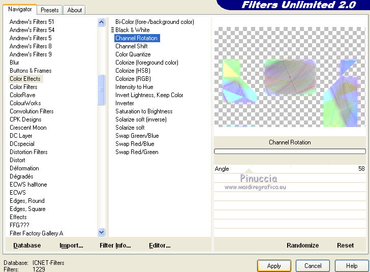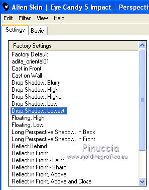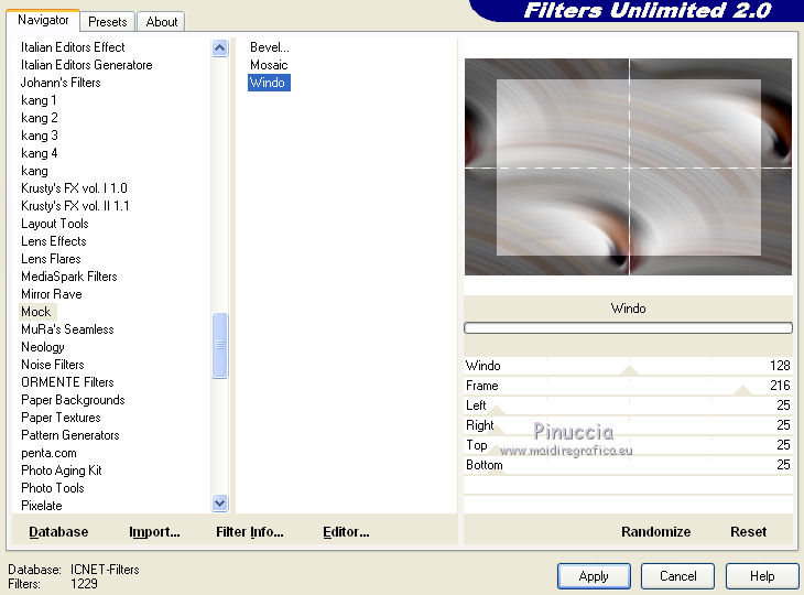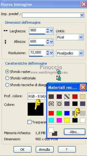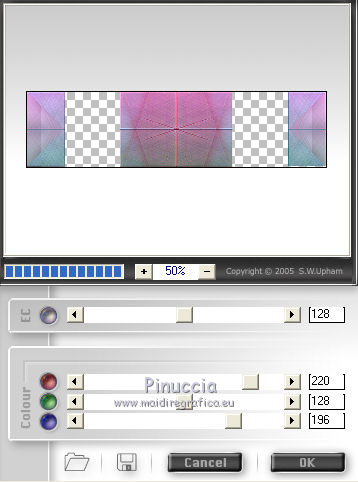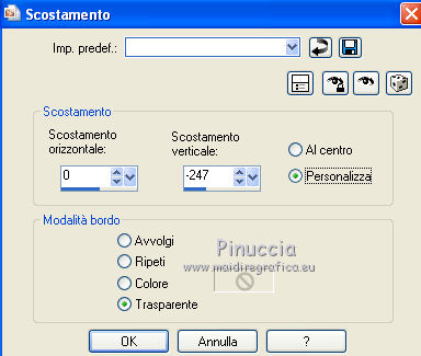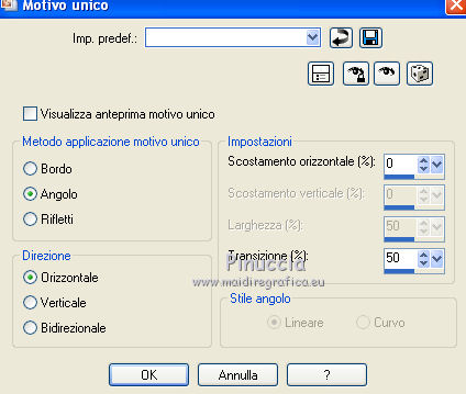 qui puoi trovare qualche risposta ai tuoi dubbi. Se l'argomento che ti interessa non è presente, ti prego di segnalarmelo. Questo tutorial è stato creato con PSP X3, ma può essere eseguito anche con le altre versioni di PSP. Per tradurlo, ho usato PSP X. Occorrente: Materiale qui Per il tube della donna grazie Jeanne Per la maschera grazie Narah Il resto del materiale è di Monaiekje . Lascia intatto il nome del tube. Il © appartiene all'artista originale. Mantieni il credito di chi ha creato il tube. Filtri in caso di dubbi, ricorda di consultare la mia sezione filtri qui Alien Skin Eye Candy 5 Impact qui Filters Unlimited 2.0 qui Filter Factory Gallery B qui Mura's Seamless qui Simple qui Mock qui Fotomatic Skygrad (lo trovi nello zip). Transparency - Eliminate White qui Transparency - Eliminate Black qui I filtri Factory Gallery per essere usati devono prima essere convertiti. Come fare vedi qui Si usano importandoli in Filters Unlimited (come fare vedi qui) ma possono funzionare anche da soli. Le factory fornite sono state già convertite. Anche i filtri Simple, Toadies, Mock e Transparency si possono usare da soli o importati in Filters Unlimited. ![]() Se stai usando altri colori e/o materiali, sei libero di sperimentare le modalità di miscelatura più adatte. Metti la selezione nella cartella Selezioni. Apri la maschera e il resto del materiale in PSP. 1. Imposta il colore di primo piano con #ffffff, e il colore di sfondo con #423a3b. 2. Apri una nuova immagine nera 900 x 600 pixels cliccando con il tasto destro del mouse sulla paletta dei colori, avrai la tabellina dei colori recenti. In basso a sinistra la tua paletta dei colori, e gli ultimi due colori della tabella sono sempre il nero e il bianco. Per impostare un colore, clicca sulla palettina corrispondente. ![]() 3. Selezione>Seleziona tutto. Livelli>Nuovo livello raster. Apri il tube Woman_Femke e vai a Modifica>Copia. non chiuderlo perchè ti servirà ancora Torna al tuo lavoro e vai a Modifica>Incolla nella selezione. Selezione>Deseleziona. 4. Effetti>Effetti di immagine>Motivo unico, con i settaggi standard. ![]() 5. Regola>Sfocatura>Sfocatura radiale. ![]() 6. Effetti>Effetti di immagine>Motivo unico, con i settaggi precedenti. 7. Effetti>Plugins>Filters Unlimited 2.0 - Mock - Windo. ![]() 8. Livelli>Unisci>Unisci tutto. Livelli>Duplica. 9. Effetti>Plugins>Mura's Seamles - Get 1 Tile. ![]() 10. Effetti>Effetti 3D>Sfalsa ombra, con il colore nero. ![]() 11. Effetti>Effetti di bordo>Aumenta. 12. Effetti>Effetti di immagine>Motivo unico. ![]() 13. Effetti>Plugins>Simple - Blintz. 14. Livelli>Duplica. Immagine>Capovolgi. Cambia la modalità di miscelatura di questo livello in Moltiplica. 15. Effetti>Plugins>Filters Unlimited 2.0 – Color Effects – Channel rotation ![]() 16. Effetti>Effetti 3D>Sfalsa ombra, con i settaggi precedenti. 17. Livelli>Unisci>Unisci tutto. 18. Effetti>Plugins>Simple - 4 Way average. Dovresti avere questo. ![]() 19. Modifica>Copia. 20. Apri una nuova immagine nera 900 x 600 pixels. ![]() Modifica>Incolla come nuovo livello. 21. Effetti>Plugins>Filter Factory Gallery B – Button Deluxe. ![]() 22. Modifica>Incolla come nuovo livello (il lavoro precedente è ancora in memoria). 23. Immagine>Ridimensiona, al 75%, tutti i livelli non selezionato. 24. Effetti>Effetti di immagine>Scostamento. ![]() 25. Effetti>Plugins>Alien Skin Eye Candy 5 - Perspective Shadow seleziona il preset Reflect in front-sharp e ok. ![]() 26. Effetti>Plugins>Alien Skin Eye Candy 5 Impact – Glass seleziona il preset Clear e ok. ![]() 27. Selezione>Carica/Salva selezione>Carica selezione da disco. Cerca e carica la selezione MDlessen-selectie88. ![]() Selezione>Innalza selezione a livello. 28. Effetti>Plugins>Fotomatic - Skygrad. ![]() 29. Selezione>Modifica>Seleziona bordature selezione. ![]() Riempi la selezione con il colore di primo piano.Selezione>Deseleziona. 30. Apri la maschera Narah_mask_0252. Livelli>Innalza livello di sfondo. Effetti>Plugins>Transparency - Eliminate Black. Modifica>Copia. 31. Torna al tuo lavoro e vai a Modifica>Incolla come nuovo livello. Immagine>Ridimensiona, al 45%, tutti i livelli non selezionato. 32. Effetti>Effetti di immagine>Scostamento. ![]() 33. Livelli>Duplica. Immagine>Rifletti. Livelli>Unisci>Unisci giù. 34. Effetti>Plugins>Alien Skin Eye Candy 5 Impact – Perspective Shadow Seleziona il preset Drop shadow Lowest e ok. ![]() 35. Attiva nuovamente il tube Woman_Femke e vai a Modifica>Copia. Torna al tuo lavoro e vai a Modifica>Incolla come nuovo livello. Immagine>Ridimensiona, all'88%, tutti i livelli non selezionato. 36. Apri "tekst mika MD" e vai a Modifica>Copia. Torna al tuo lavoro e vai a Modifica>Incolla come nuovo livello. 37. Effetti>Effetti di immagine>Scostamento. ![]() 38. Livelli>Disponi>Sposta giù. Cambia la modalità di miscelatura di questo livello in Indebolisci, e abbassa l'opacità al 35%. 39. Immagine>Aggiungi bordatura, 1 pixel, simmetriche, con il colore di primo piano. Immagine>Aggiungi bordatura, 50 pixels, simmetriche, con il colore di sfondo. Immagine>Aggiungi bordatura, 1 pixel, simmetriche, con il colore di primo piano. 40. Attiva lo strumento Bacchetta magica ![]() ![]() Clicca nel bordo da 50 pixels per selezionarlo. Selezione>Innalza selezione a livello. 41. Effetti>Plugins>Filter Factory Gallery B - Button Deluxe, con i settaggi precedenti. Effetti>Effetti di bordo>Aumenta di più. 42. Selezione>Seleziona tutto. Selezione>Modifica>Contrai - 50 pixels. 43. Effetti>Effetti 3D>Sfalsa ombra, con i settaggi precedenti. Selezione>Deseleziona. 44. Aggiungi il tuo nome e/o il tuo watermark su un nuovo livello. 45. Livelli>Unisci>Unisci tutto. 46. Se vuoi: Immagine>Ridimensiona, a 800 pixels di larghezza, tutti i livelli selezionato. Salva in formato jpg. Per questi esempi ho usato tubes di AnaRidzi ![]() Mary ![]() ![]() Se hai problemi o dubbi, o trovi un link non funzionante, o anche soltanto per un saluto, scrivimi. 25 Settembre 2012 |