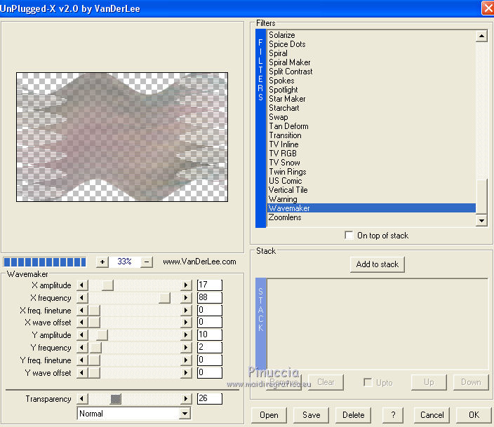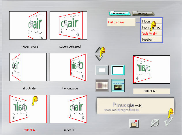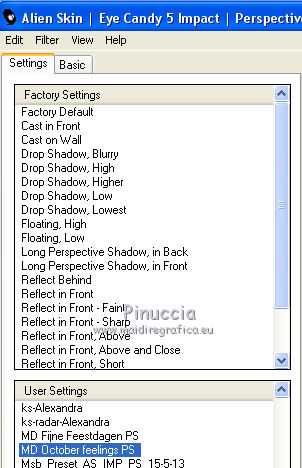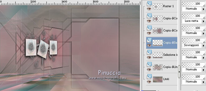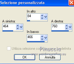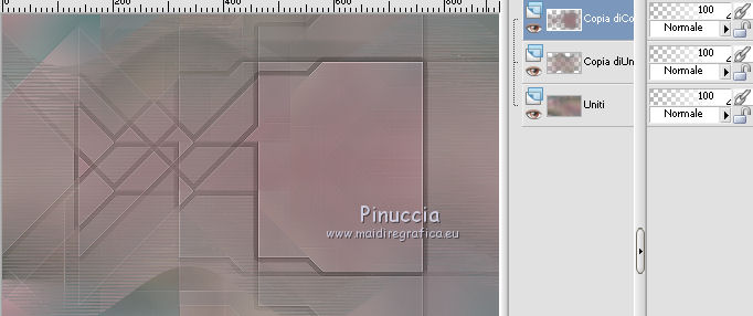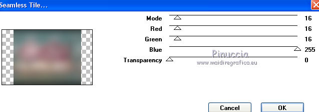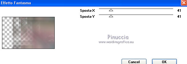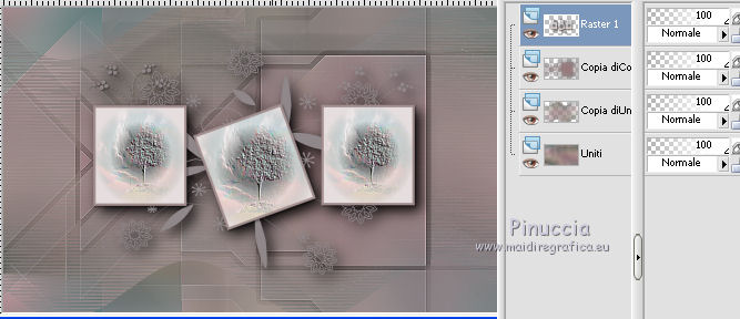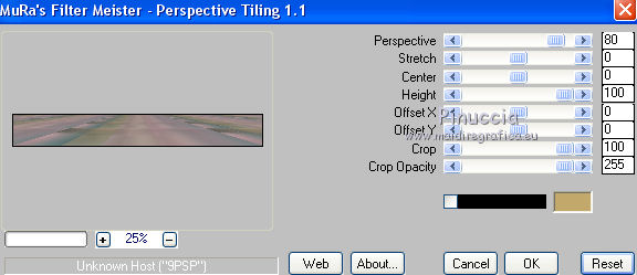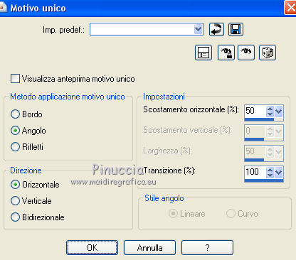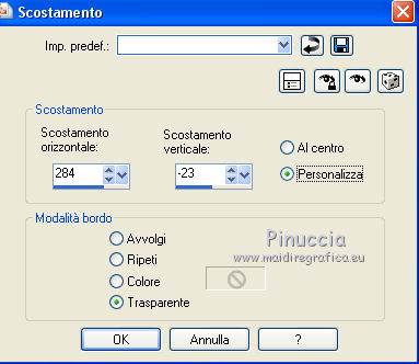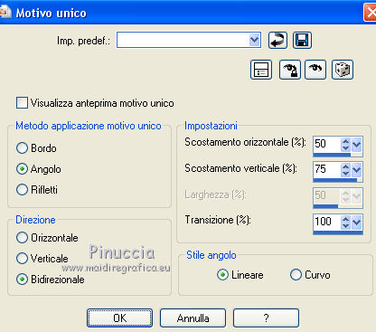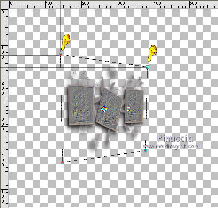 qui puoi trovare qualche risposta ai tuoi dubbi. Se l'argomento che ti interessa non è presente, ti prego di segnalarmelo. Questo tutorial è stato creato con PSP X5, ma può essere eseguito anche con le altre versioni di PSP. Nelle versioni X4 X5 e X6 il comando Immagine>Rifletti è stato sostituito con Immagine>Capovolgi in orizzontale, e il comando Immagine>Capovolgi con Immagine>Capovolgi in verticale. Nelle versioni X5 e X6, le funzioni sono state migliorate rendendo disponibile il menu Oggetti. Vedi la scheda sull'argomento qui Per tradurre il tutorial ho usato PSP X. Occorrente: Materiale qui Il tube della donna è di Syl. Il tube di sfondo è di Radyga. Il resto del materiale è di Monique Trovi qui i banner degli autori. Mantieni il credito di chi ha creato il tube. Filtri in caso di dubbi, ricorda di consultare la mia sezione filtri qui Filters Unlimited 2.0 qui VM Toolbox - Seamless Tile qui Graphics Plus - Cross Shadow qui Simple qui Italian Editors Effects - Effetto Fantasma qui Alien Skin Eye Candy 5 Impact - Perspective Shadow qui Mura's Meister - Perspective Tiling qui VanDerLee - Unplugged-X qui Andromeda - Perspective qui I filtri VM Toolbox, Graphics Plus, Simple e Italian Editors si possono usare da soli o importati in Filters Unlimited. Come fare vedi qui. Se un filtro fornito appare con questa icona ![]() Se stai usando altri colori e/o materiali, sei libero di sperimentare le modalità di miscelatura più adatte. Metti il preset Cliccando sul file una o due volte (a seconda delle tue impostazioni), automaticamente il preset si installerà nella cartella corretta. perchè uno o due clic vedi qui Imposta il colore di primo piano con #d5c5bc, e il colore di sfondo con #7d7d80. ![]() 1. Apri una nuova immagine trasparente 900 x 550 pixels. Selezione>Seleziona tutto. 2. Apri Radyga-tubes-misted-0198-1709-2013 BEWERKT. Modifica>Copia. Torna al tuo lavoro e vai a Modifica>Incolla nella selezione. Selezione>Deseleziona. 3. Effetti>Effetti di immagine>Motivo unico. ![]() 4. Regola>Sfocatura>Sfocatura gaussiana - raggio 35. ![]() 5. Livelli>Duplica. Effetti>Plugins>VM Toolbox – Seamless tile. ![]() 6. Effetti>Plugins>Simple - Blintz. Effetti>Effetti di bordo>Aumenta. 7. Effetti>Effetti di immagine>Motivo unico. ![]() 8. Livelli>Duplica. Immagine>Rifletti. Immagine>Capovolgi. 9. Effetti>Effetti di immagine>Scostamento. ![]() 10. Effetti>Plugins>Italian editors effect – Effetto Fantasma. tieni presente che il risultato di questo effetto è influenzato dal colore di sfondo, come puoi vedere, in fondo al tutorial, il risultato con un colore verde e con un colore rosso ![]() Regola>Messa a fuoco>Metti a fuoco. Dovresti avere questo. ![]() 11. Livelli>Unisci>Unisci visibile. 12. Livelli>Duplica. Immagine>Ridimensiona, all'85%, tutti i livelli non selezionato. 13. Immagine>Rifletti. Livelli>Duplica. Chiudi questo livello e attiva il livello centrale (copia di Uniti). ![]() 14. Effetti>Plugins>VanDerLee Unplugged X – Wavemaker ![]() 15. Riapri e attiva il livello superiore - copia(2) di uniti. Effetti>Plugins>Simple - Pizza slice mirror. 16. Effetti>Effetti 3D>Sfalsa ombra, colore nero. ![]() 17. Effetti>Plugins>Italian editors effect – Effetto Fantasma, con i settaggi precedenti. Effetti>Effetti di bordo>Aumenta. Dovresti avere questo. ![]() 18. Apri Doodle_Boxes e vai a Modifica>Copia. Torna al tuo lavoro e vai a Modifica>Incolla come nuovo livello. 19. Effetti>Plugins>Alien Skin Eye Candy 5 Impact - Perspective shadow. Seleziona il preset Drop Shadow Blurry e ok. ![]() 20. Attiva lo strumento Bacchetta magica ![]() ![]() Clicca sulla cornice sinistra per selezionarla. ![]() 21. Livelli>Nuovo livello raster. Apri il tube originale Radyga-tubes-misted-0198-1709-2013 e vai a Modifica>Copia. Torna al tuo lavoro e vai a Modifica>Incolla nella selezione. Mantieni selezionato. 22. Livelli>Duplica. Effetti>Effetti di trama>Rilievo. Livelli>Unisci>Unisci giù. Selezione>Deseleziona. 23. Attiva nuovamente il livello della cornice - Raster 1 e seleziona la cornice centrale con la bacchetta magica ![]() ![]() 24. Livelli>Nuovo livello raster. Modifica>Incolla nella selezione (il tube di Radyga è ancora in memoria). Mantieni selezionato. 25. Livelli>Duplica. Effetti>Effetti di trama>Rilievo. Livelli>Unisci>Unisci giù. Selezione>Deseleziona. 26. Ancora una volta attiva il livello della cornice - Raster 1 e seleziona la cornice destra con la bacchetta magica ![]() ![]() 27. Livelli>Nuovo livello raster. Modifica>Incolla nella selezione (il tube di Radyga è ancora in memoria). Mantieni selezionato. 28. Livelli>Duplica. Effetti>Effetti di trama>Rilievo. Livelli>Unisci>Unisci giù. Selezione>Deseleziona. 29. Attiva il livello superiore - Raster 2. Livelli>Unisci>Unisci giù e ripeti 2 volte, e avrai le cornici in un unico livello. ![]() 30. Immagine>Ridimensiona, al 75%, tutti i livelli non selezionato. Attiva il livello della seconda copia di Uniti, il secondo livello dall'alto. Livelli>Duplica. Immagine>Rifletti. 31. Effetti>Plugins>Andromeda - Perspective. Clicca sull'icona Presets ![]() imposta i seguenti settaggi, e clicca sul segno di spunta in basso a destra per confermare. ![]() Di nuovo clicca sul segno di spunta per chiudere la finestra del filtro. ![]() Cambia la modalità di miscelatura di questo livello in Luce netta. una scappatoia per chi non riesce ad usare questo filtro: per vedere meglio, lascia visibile soltanto questo livello. Immagine>Rifletti. Premi il tasto K per attivare lo strumento Puntatore ![]() se stai usando PSP 9, il tasto D (valido per tutte le versioni) per attivare lo strumento Deformazione ![]() in modalità Scala, spingi il nodo centrale a destra fino a 490 pixels. ![]() in modalità Prospettiva spingi uno dei nodi esterni a destra (simmetricamente si sposterà anche l'opposto), pressappoco come nell'esempio ![]() 32. Attiva il livello superiore Raster 1. Effetti>Plugins>Andromeda - Perspective, con i settaggi precedenti. come prima, per chi non usar