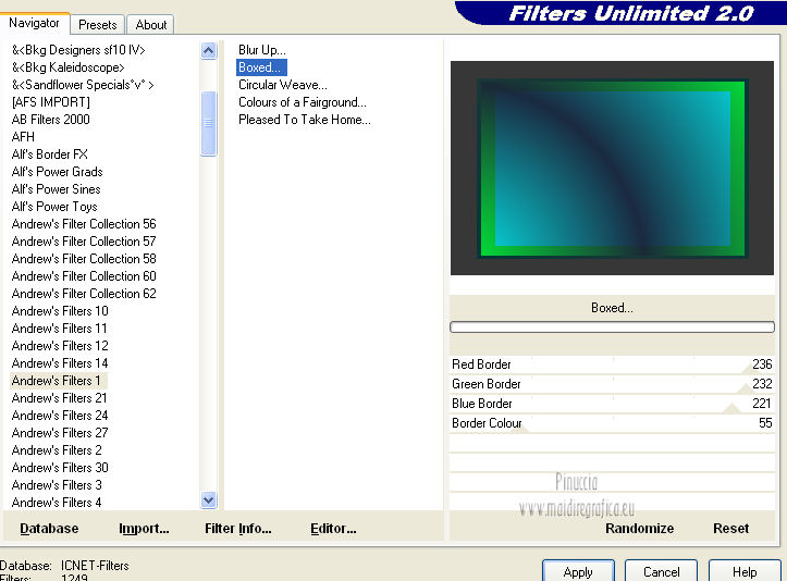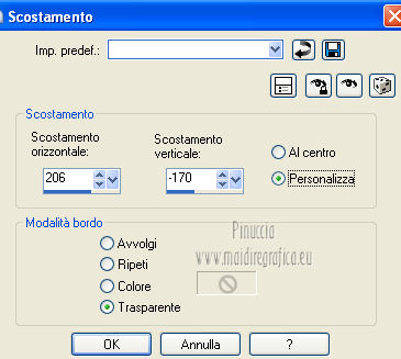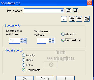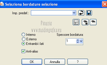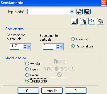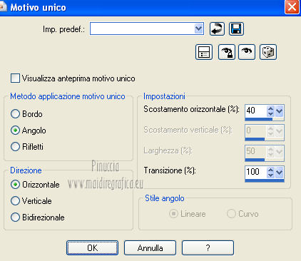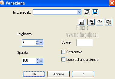 qui puoi trovare qualche risposta ai tuoi dubbi. Se l'argomento che ti interessa non è presente, ti prego di segnalarmelo. Questo tutorial è stato creato con PSP X3, ma può essere eseguito anche con le altre versioni di PSP. Per tradurlo, ho usato PSP X. Occorrente: Materiale qui Per il bel tube grazie Lexha Per la maschera grazie @nn Il resto del materiale è di Monaiekje. Lascia intatto il nome del tube. Il © appartiene all'artista originale. Mantieni il credito di chi ha creato il tube. Filtri in caso di dubbi, ricorda di consultare la mia sezione filtri qui Alien Skin Eye Candy 5 Impact qui Filters Unlimited 2.0 qui Andrew's Filter 1 qui L&K - L&K Mayra qui Graphics Plus qui VM Distortion qui I filtri Andrew's per essere usati devono prima essere convertiti. Come fare vedi qui Si usano importandoli in Filters Unlimited (come fare vedi qui) ma possono funzionare anche da soli. Il filtro fornito è stato già convertito. Anche i filtri Graphics Plus e VM Distortion si possono usare da soli o importati in Unlimite. ![]() Se stai usando altri colori e/o materiali, sei libero di sperimentare le modalità di miscelatura più adatte. Metti il preset nella cartella del Filtro Alien Skin Eye Candy 5 Impact>Settings>Gradient Glow. Cliccando sul file una o due volte (a seconda delle tue impostazioni) automaticamente il preset si installerà nella cartella corretta. Metti la selezione nella cartella Selezioni. Apri la maschera in PSP e minimizzala con il resto del materiale. 1. Imposta il colore di primo piano con #00ffff, e il colore di sfondo con #1a2a40. Passa il colore di primo piano a Gradiente, stile Sprazzo di luce. ![]() 2. Apri una nuova immagine trasparente 900 x 600 pixels e riempila con il colore di sfondo.3. Effetti>Plugins>Graphics Plus - Cross Shadow, con i settaggi standard. ![]() 4. Livelli>Nuovo livello raster. Riempi il livello con il gradiente.5. Effetti>Plugins>Filters Unlimited 2.0 – Andrew's Filters 1 – Boxed. ![]() 6. Immagine>Ridimensiona, al 75%, tutti i livelli non selezionato. 7. Effetti>Effetti di immagine>Motivo unico. ![]() Effetti>Effetti di bordo>Aumenta. 8. Attiva lo strumento Selezione ,clicca sull'icona Selezione personalizzata ![]() e imposta i seguenti settaggi: ![]() Selezione>Innalza selezione a livello. 9. Effetti>Plugins>L and K landksiteofwonders – L &, K’s - Mayra. ![]() Cambia la modalità di miscelatura di questo livello in Indebolisci. 10. Selezione>Modifica>Seleziona bordature selezione. ![]() 11. Riporta il colore di primo piano al colore iniziale #00ffff. Riempi la selezione con il colore di primo piano.Selezione>Deseleziona. 12. Livelli>Unisci>Unisci giù. 13. Selezione>Seleziona tutto. Selezione>Modifica>Contrai - 50 pixels. Selezione>Innalza selezione a livello. 14. Imposta il colore di primo piano con il colore bianco #ffffff. Riempi la selezione con questo colore.15. Livelli>Nuovo livello maschera>Da immagine. Apri il menu sotto la finestra di origine e vedrai la lista dei files aperti. Seleziona la maschera @nn_190912_mask_169_tdstudio, con i seguenti settaggi: ![]() Livelli>Unisci>Unisci gruppo. Selezione>Deseleziona. 16. Effetti>Effetti 3D>Sfalsa ombra, con il colore nero. ![]() Modifica>Ripeti Sfalsa ombra. 17. Cambia la modalità di miscelatura di questo livello in Luce diffusa. 18. Selezione>Seleziona tutto. Selezione>Modifica>Contrai - 50 pixels. Selezione>Modifica>Seleziona bordature selezione, con i settaggi precedenti. ![]() 19. Livelli>Nuovo livello raster. Imposta nuovamente il colore di primo piano con #00ffff, e riempi la selezione con questo colore.Selezione>Deseleziona. 20. Dovresti avere questo. ![]() 21. Selezione>Carica/Salva selezione>Carica selezione da disco. Cerca e carica la selezione MDlessen-selectie89. ![]() 22. Attiva il livello Raster 1. ![]() Selezione>Innalza selezione a livello. Livelli>Disponi>Porta in alto. Selezione>Deseleziona. 23. Livelli>Duplica - 2 volte. E avrai un totale di 3 livelli uguali. ![]() 24. Rimani posizionato sul livello superiore. Regola>Sfocatura>Sfocatura gaussiana - raggio 30. ![]() 25. Effetti>Effetti di distorsione>Mulinello. ![]() 26. Immagine>Immagine negativa. se stai usando PSP 9: Regola>Bilanciamento colore>Immagine negativa 27. Cambia la modalità di miscelatura di questo livello in Filtra, e abbassa l'opacità al 65%. 28. Attiva il livello copia di selezione innalzata. ![]() 29. Effetti>Effetti di riflesso>Caleidoscopio. ![]() 30. Attiva il livello Selezione innalzata ![]() 31. Effetti>Plugins>Filters Unlimited 2.0 - VM Distortion - Kaleidoscope. ![]() 32. Attiva il livello copia di selezione innalzata. ![]() Livelli>Unisci>Unisci giù. Livelli>Disponi>Porta in alto. 33. Effetti>Effetti 3D>Sfalsa ombra, con il colore nero. ![]() 34. Immagine>Ridimensiona, all'80%, tutti i livelli non selezionato. 35. Effetti>Effetti di immagine>Scostamento. ![]() 36. Livelli>Duplica. Effetti>Effetti di immagine>Scostamento. ![]() 37. Livelli>Unisci>Unisci giù. Livelli>Duplica. Immagine>Ridimensiona, all'85%, tutti i livelli non selezionato. 38. Immagine>Ruota per gradi - 90 gradi a destra. ![]() 39. Cambia la modalità di miscelatura di questo livello in Filtra, e abbassa l'opacità al 60%. 40. Livelli>Disponi>Sposta giù. Effetti>Effetti di trama>Veneziana - colore bianco. ![]() 41. Attiva il livello Selezione innalzata. ![]() 42. Livelli>Duplica. Immagine>Ridimensiona, al 45%, tutti i livelli non selezionato. 43. Effetti>Effetti di immagine>Scostamento. ![]() 44. Livelli>Duplica. Immagine>Ridimensiona, al 50%, tutti i livelli non selezionato. 45. Immagine>Ruota per gradi, con i settaggi precedenti. ![]() 46. Effetti>Effetti di immagine>Scostamento. ![]() 47. Effetti>Effetti 3D>Sfalsa ombra, con il colore nero. ![]() 48. Livelli>Duplica. Effetti>Effetti di immagine>Scostamento. ![]() 49. Livelli>Duplica. Immagine>Capovolgi. Livelli>Unisci>Unisci giù. 50. Livelli>Duplica. Effetti>Effetti di immagine>Scostamento. ![]() 51. Regola>Tonalità e saturazione>Viraggio. ![]() Cambia la mo