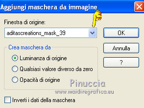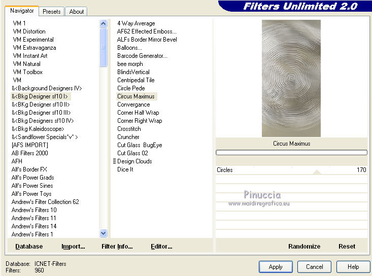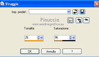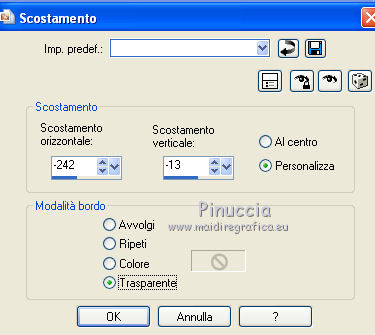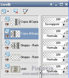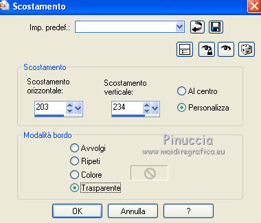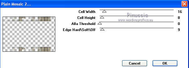 qui puoi trovare qualche risposta ai tuoi dubbi. Se l'argomento che ti interessa non è presente, ti prego di segnalarmelo. Questo tutorial è stato creato con PSP X3, ma può essere eseguito anche con le altre versioni di PSP. Per tradurlo, ho usato PSP X. Occorrente: Materiale qui Il tube della donna è di Maryse Il tube dell'orologio è di Liza La maschera è di Adita Grazie a tutti i creatori di tubes per le loro immagini. Lascia intatto il nome del tube. Il © appartiene all'artista originale. Mantieni il credito di chi ha creato il tube. Filtri in caso di dubbi, ricorda di consultare la mia sezione filtri qui Filters Unlimited 2.0 qui Toadies qui Toadies - Plan Mosaic 2 qui Background Designer sf10I qui Alien Skin Eye Candy 5 Impact qui ![]() Se stai usando altri colori e/o materiali, sei libero di sperimentare le modalità di miscelatura più adatte. Metti le selezioni nella cartella Selezioni. Apri la maschera in PSP e minimizzala con il resto del materiale. Imposta il colore di primo piano con #D8CBA7, e il colore di sfondo con #6D6E68. Passa il colore di primo piano a Gradiente. ![]() 1. Apri una nuova immagine trasparente 900 x 600 pixels, e riempila con il gradiente.2. Effetti>Effetti di distorsione>Tasselli. ![]() 3. Selezione>Carica/Salva selezione>Carica selezione da disco. Cerca e carica la selezione MDlessen-selectie-61. ![]() Selezione>Innalza selezione a livello. 4. Apri Paper MD e vai a Modifica>Copia. Torna al tuo lavoro e vai a Modifica>Incolla nella selezione. Selezione>Deseleziona. 5. Regola>Sfocatura>Sfocatura radiale. ![]() 6. Livelli>Duplica. Immagine>Capovolgi. Livelli>Unisci>Unisci giù. 7. Livelli>Duplica. Effetti>Effetti di immagine>Motivo unico. Seleziona il preset Intermittente diagonale e ok. ![]() 8. Livelli>Duplica. Immagine>Capovolgi. Livelli>Unisci>Unisci visibile. 9. Livelli>Nuovo livello raster. Passa il colore di primo piano. Riempi il livello con il colore di primo piano.10. Selezione>Seleziona tutto. Selezione>Modifica>Contrai - 75 pixels. Premi sulla tastiera il tasto CANC. Selezione>Inverti. 11. Livelli>Nuovo livello maschera>Da immagine. Apri il menu sotto la finestra di origine e vedrai la lista dei files aperti. Seleziona la maschera aditascreations_mask_39. ![]() Livelli>Unisci>Unisci gruppo. 12. Selezione>Inverti. Effetti>Effetti 3D>Sfalsa ombra, con il colore nero. ![]() Ripeti l'Effetto Sfalsa ombra, cambiando verticale e orizzontale con -5. Selezione>Deseleziona. 13. Livelli>Nuovo livello raster. Riempi con il colore di sfondo.14. Livelli>Nuovo livello maschera>Da immagine. Apri il menu sotto la finestra di origine e seleziona nuovamente la maschera aditascreations_mask_39. ![]() Livelli>Unisci>Unisci gruppo. 15. Effetti>Effetti 3D>Sfalsa ombra, con i settaggi precedenti. Puoi applicare l'Effetto con gli ultimi settaggi a -5, e poi ripetere a 5. 16. Livelli>Duplica. Effetti>Effetti di immagine>Scostamento. ![]() 17. Livelli>Duplica. Immagine>Rifletti. Cambia la modalità di miscelatura di questo livello in Sovrapponi. 18. Attiva il livello copia di gruppo-Raster 1, che è il livello sottostante. ![]() Effetti>Effetti di trama>Intessitura. Colore intessitura: colore di sfondo; riempi spazi: colore di primo piano. ![]() Livelli>Unisci>Unisci giù. 19. Selezione>Carica/Salva selezione>Carica selezione da disco. Cerca e carica la selezione MDlessen-selectie-63. ![]() 20. Modifica>Taglia (questo comando, oltre a tagliare, tiene anche in memoria). Modifica>Incolla come nuovo livello. Selezione>Deseleziona. 21. Effetti>Effetti di distorsione>Onda. ![]() Livelli>Disponi>Sposta giù - 2 volte. Abbassa l'opacità di questo livello al 30%. 22. Attiva il livello inferiore - Uniti. Selezione>Carica/Salva selezione>Carica selezione da disco. Carica nuovamente la selezione MDlessen-selectie-63. ![]() Selezione>Innalza selezione a livello. 24. Effetti>Plugins>Filters Unlimited 2.0 - &<Bkg Designers sf10I> - Circus Maximus. ![]() Cambia la modalità di miscelatura di questo livello in Moltiplica. 25. Livelli>Duplica. Cambia la modalità di miscelatura di questo livello in Sovrapponi, e abbassa l'opacità al 45%. ![]() Selezione>Deseleziona. 26. Attiva il livello Gruppo Raster 1. Ci sono due livelli con lo stesso nome. Posizionati sul livello superiore dei due. ![]() 27. Effetti>Plugins>Toadies - Plain Mosaic. attenzione, non usare Plain Mosaic Blur. Se non trovi il semplice Plain Mosaic, puoi usare Plain Mosaic 2. Nella tua lista non puoi trovarli insieme, perchè presente uno, il secondo che viene incluso nei Percorsi Files verrà escluso Se nella tua lista trovi Plain Mosaic. ![]() Se trovi Plain Mosaic 2, avrai questa schermata. ![]() 28. Effetti>Effetti di distorsione>Vento - da destra, intensità 100. ![]() 29. Livelli>Unisci>Unisci visibile. 30. Apri il tube Liza_tube_klok e vai a Modifica>Copia. Torna al tuo lavoro e vai a Modifica>Incolla come nuovo livello. 31. Effetti>Effetti di immagine>Scostamento. ![]() 32. Effetti>Plugins>Alien Skin Eye Candy 5 Impact - Perspective Shadow. Seleziona il preset Drop Shadow, Blurry e ok. ![]() 33. Apri "ringetje" e vai a Modifica>Copia. Torna al tuo lavoro e vai a Modifica>Incolla come nuovo livello. 34. Effetti>Effetti di immagine>Scostamento. ![]() 35. Regola>Tonalità e saturazione>Viraggio. ![]() se stai usando altri colori, imposta i valori di Tonalità (H) e Saturazione (S) del tuo colore di primo piano. ![]() 36. Selezione>Carica/Salva selezione>Carica selezione da disco. Cerca e carica la selezione MDlessen-selectie-62. ![]() 37. Livelli>Nuovo livello raster. Riempi la selezione con il colore di sfondo.37. Effetti>Effetti 3D>Smusso a incasso. ![]() Selezione>Deseleziona. 38. Apri il tube MR_Time Hat. Attiva lo strumento Gomma ![]() e cancella il watermark. ![]() Modifica>Copia. Torna al tuo lavoro e vai a Modifica>Incolla come nuovo livello. Immagine>Rifletti. Immagine>Ridimensiona, al 70%, tutti i livelli non selezionato. 39. Effetti>Effetti di immagine>Scostamento. ![]() 40. Effetti>Plugins>Alien S