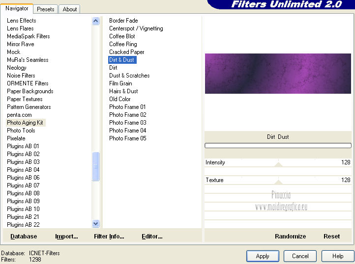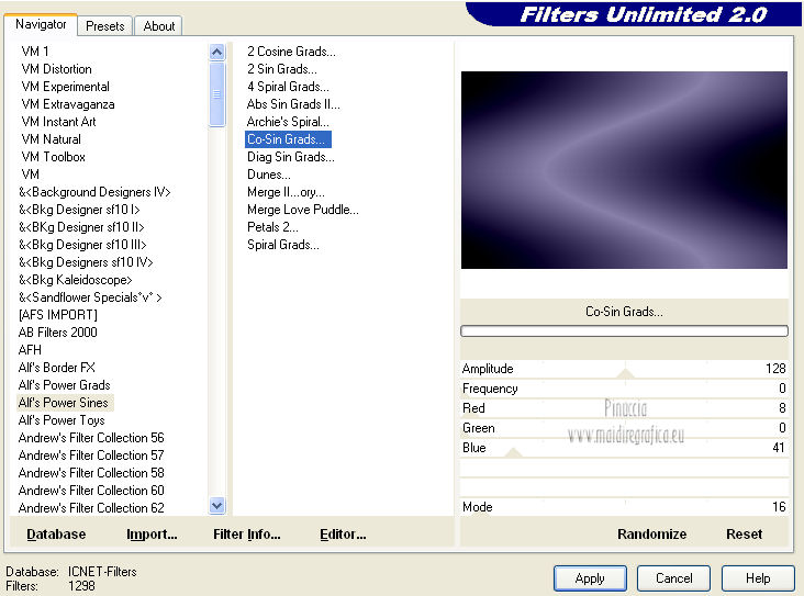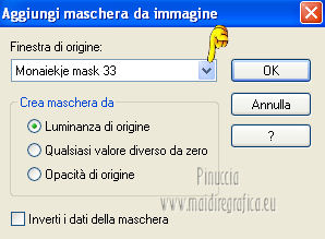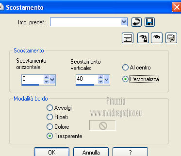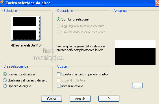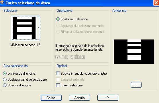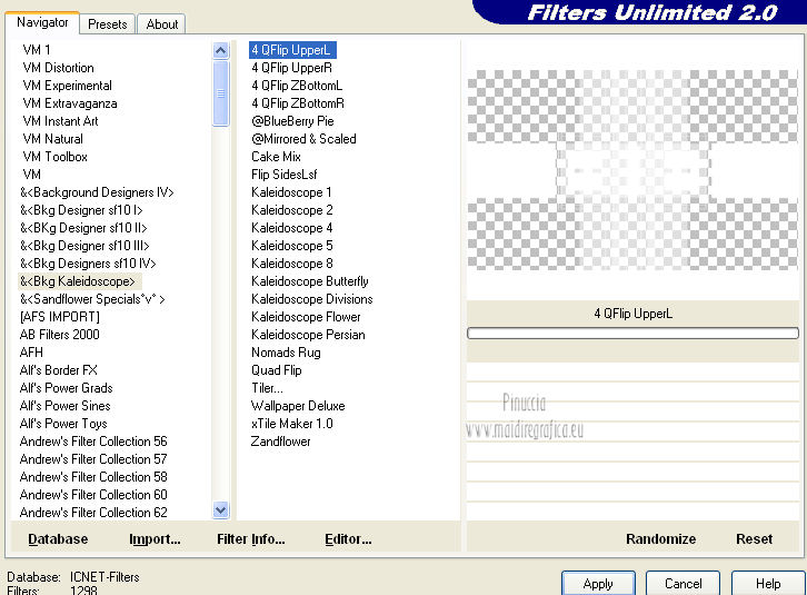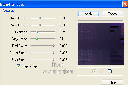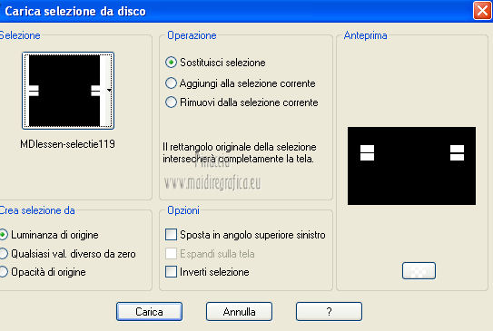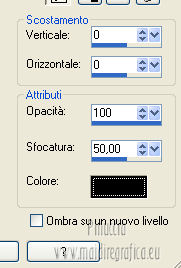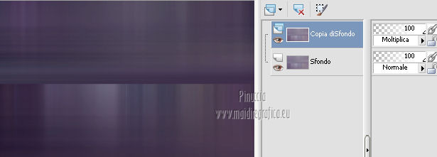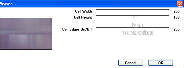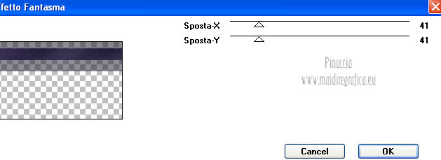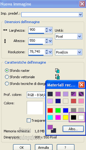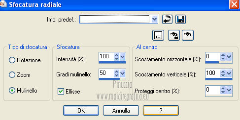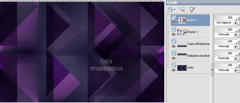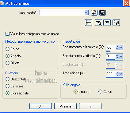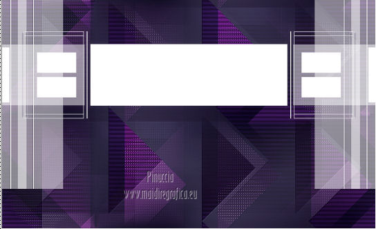 qui puoi trovare qualche risposta ai tuoi dubbi. Se l'argomento che ti interessa non è presente, ti prego di segnalarmelo. Questo tutorial è stato creato con PSP X3, ma può essere eseguito anche con le altre versioni di PSP. Per tradurlo, ho usato PSP X. Occorrente: Materiale qui Per i tubes delle donne grazie Athenais e Joanie Per il tube del vaso grazie Radyga Il resto del materiale è di Monique Mantieni il credito di chi ha creato il tube. Filtri in caso di dubbi, ricorda di consultare la mia sezione filtri qui Filters Unlimited 2.0 qui &<Bkg Kaleidoscope> (da importare in Unlimited) - 4 QFlip UpperL qui Filter Factory Gallery A - Triangular Mosaic Filterqui Alf's Power Sines (da importare in Unlimited) - Co-Sin Grads qui Alien Skin Eye Candy 5 Impact - Perspective Shadow qui FM Tile Tools - Blend Emboss qui Simple - Left Right Wrap (bonus) qui Simple - Half Wrap qui Graphics Plus qui Toadies - Weaver, What are you qui Mura's Meister - Perspective Tiling qui Photo Aging Kit (da importare in Unlimited) - Dirt & Dust qui Italian Editors Effect - Effetto Fantasma qui L&K - L&K Zitah qui I filtri Factory Gallery per essere usati devono prima essere convertiti. Come fare vedi qui Si usano importandoli in Filters Unlimited (come fare vedi qui) ma possono funzionare anche da soli. Anche i filtri Alf's Power Sines, Simple, Graphics Plus, Toadies e Italian Editors si possono usare da soli o importati in Unlimited. A volte è si possono riscontrare differenze nell'esito dei diversi usi, ma questo è possibile verificarlo soltanto "sul campo". ![]() Se stai usando altri colori e/o materiali, sei libero di sperimentare le modalità di miscelatura più adatte. Metti le selezioni nella cartella Selezioni. Apri la maschera in PSP e minimizzala con il resto del materiale. Imposta il colore di primo piano con #a94bb9, e il colore di sfondo con #292941. ![]() 1. Apri una nuova immagine BIANCA 900 x 550 pixels togli la spunta a trasparente e clicca con il tasto destro del mouse sulla paletta del colore. Avrai la tabellina dei colori recenti. In basso a sinistra trovi sempre i colori e/o gradienti impostati nella tua paletta dei materiali. Gli ultimi due colori della tabella sono sempre il nero e il bianco. Per impostare il colore dello sfondo, clicca sulla palettina corrispondente ![]() 2. Selezione>Seleziona tutto. Apri il tube Joanie_Woman_10-03-2013 e vai a Modifica>Copia. Torna al tuo lavoro e vai a Modifica>Incolla nella selezione. Selezione>Deseleziona. 3. Effetti>Effetti di immagine>Motivo unico, con i settaggi standard. ![]() 4. Regola>Sfocatura>Sfocatura radiale. ![]() 5. Effetti>Plugins>Toadies - Weaver. ![]() 6. Livelli>Duplica. Cambia la modalità di miscelatura di questo livello in Moltiplica. ![]() 7. Effetti>Plugins>Filters Unlimited 2.0 - Alf's Power Sines - Co-Sin Grads. ![]() 8. Effetti>Effetti di immagine>Motivo unico. ![]() 9. Livelli>Unisci>Unisci visibile. 10. Selezione>Carica/Salva selezione>Carica selezione da disco. Cerca e carica la selezione MDlessen-selectie116. ![]() Selezione>Innalza selezione a livello. Selezione>Deseleziona. 11. Effetti>Plugins>Italian Editors Effect - Effetto Fantasma. ![]() 12. Livelli>Duplica. Immagine>Capovolgi. Dovresti avere questo. ![]() 13. Passa il colore di primo piano a Gradiente, stile Sprazzo di luce, con i seguenti settaggi. ![]() 14. Livelli>Nuovo livello raster. Selezione>Carica/Salva selezione>Carica selezione da disco. Cerca e carica la selezione MDlessen-selectie117. ![]() Riempi la selezione con il gradiente.Selezione>Deseleziona. 15. Effetti>Plugins>Filter Factory Gallery A - Triangular Mosaic Filter. ![]() 16. Effetti>Effetti di immagine>Motivo unico. ![]() 17. Effetti>Plugins>L&K landksiteofwonders - L& K's Zitah. ![]() 18. Livelli>Nuovo livello raster. Selezione>Carica/Salva selezione>Carica selezione da disco. Carica nuovamente la selezione MDlessen-selectie117. ![]() Riempi la selezione con il gradiente.Selezione>Deseleziona. 19. Effetti>Plugins>Filter Factory Gallery A – Triangular Mosaic Filter. ![]() 20. Effetti>Effetti di immagine>Motivo unico, con i settaggi precedenti. ![]() 21. Effetti>Effetti di trama>Veneziana, con il colore nero. ![]() 22. Cambia la modalità di miscelatura di questo livello in Sovrapponi. ![]() 23. Livelli>Unisci>Unisci visibile. Livelli>Duplica. 24. Effetti>Effetti di immagine>Motivo unico, con i settaggi precedenti. ![]() 25. Effetti>Plugins>FM Tile Tools - Blend Emboss, con i settaggi standard. ![]() 26. Livelli>Unisci>Unisci visibile. Dovresti avere questo. ![]() 27. Livelli>Nuovo livello raster. Imposta il colore di sfondo con il colore bianco #ffffff. ![]() Riempi il livello con il colore bianco (tasto destro del mouse).28. Livelli>Nuovo livello maschera>Da immagine. Apri il menu sotto la finestra di origine e vedrai la lista dei files aperti. Seleziona la maschera Monaiekje mask33, con i seguenti settaggi. ![]() Livelli>Unisci>Unisci gruppo. 29. Effetti>Plugins>Filters Unlimited 2.0 - &<Bkg Kaleidoscope> - 4 QFlip UpperL ![]() Dovresti avere questo. ![]() 30. Effetti>Effetti di immagine>Scostamento. ![]() 31. Effetti>Plugins>Simple - Left Right Wrap. ![]() 32. Selezione>Carica/Salva selezione>Carica selezione da disco. Cerca e carica la selezione MDlessen-selectie118. ![]() 33. Selezione>Modifica>Contrai - 10 pixels. ![]() Livelli>Nuovo livello raster. 34. Imposta nuovamente il colore di sfondo con #292941. E avrai il gradiente iniziale. ![]() Riempi la selezione con il gradiente.35. Effetti>Plugins>Filters Unlimited 2.0 - Photo aging kit – Dirt & Dust ![]() 36. Effetti>Effetti 3D>Sfalsa ombra, con il colore nero. ![]() 37. Effetti>Plugins>Simple - Half Wrap. ![]() Regola>Messa a fuoco>Accentua messa a fuoco. 38. Selezione>Carica/Salva selezione>Carica selezione da disco. Cerca e carica la selezione MDlessen-selectie119. ![]() 39. Attiva il livello della maschera gruppo raster 1. ![]() Selezione>Innalza selezione a livello. Selezione>Deseleziona. 40. Effetti>Plugins>Toadies - What are yo