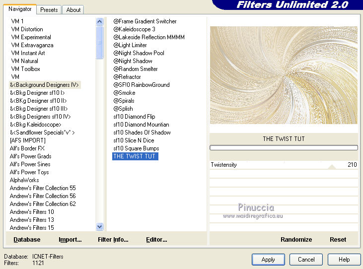 Effects>Plugins>Filters Unlimited 2.0 - &<Background Designer IV> - The Twist tut, default settings.