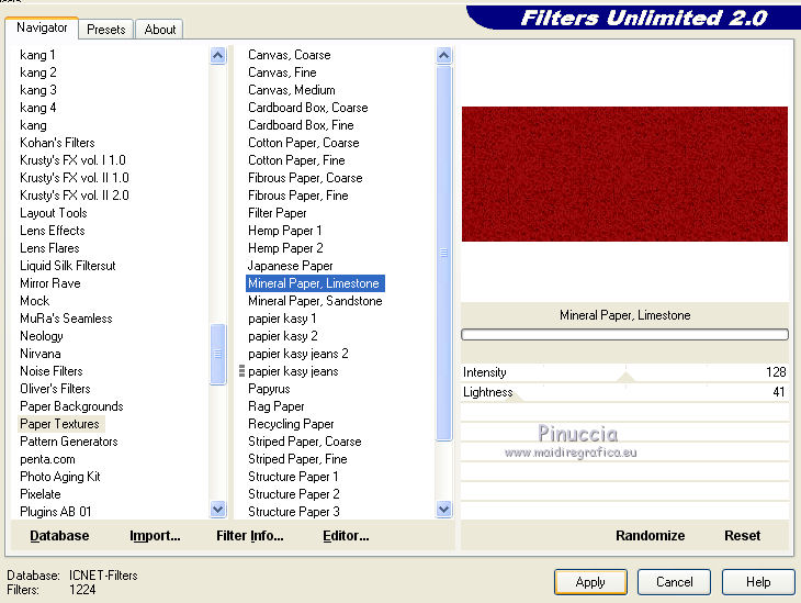 20. Effets>Modules Externes>Filters Unlimited 2.0 - Paper Textures - Mineral Paper,Limestone, par défaut.