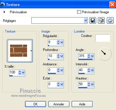 7. Effets>Effets de texture>Textures - sélectionner la texture Brick066, avec ces paramètres.