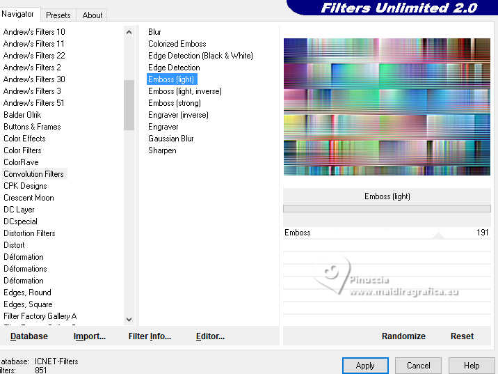 7. Effects>Plugins>Filters Unlimited 2.0 - Convolution Filter - Emboss (light).