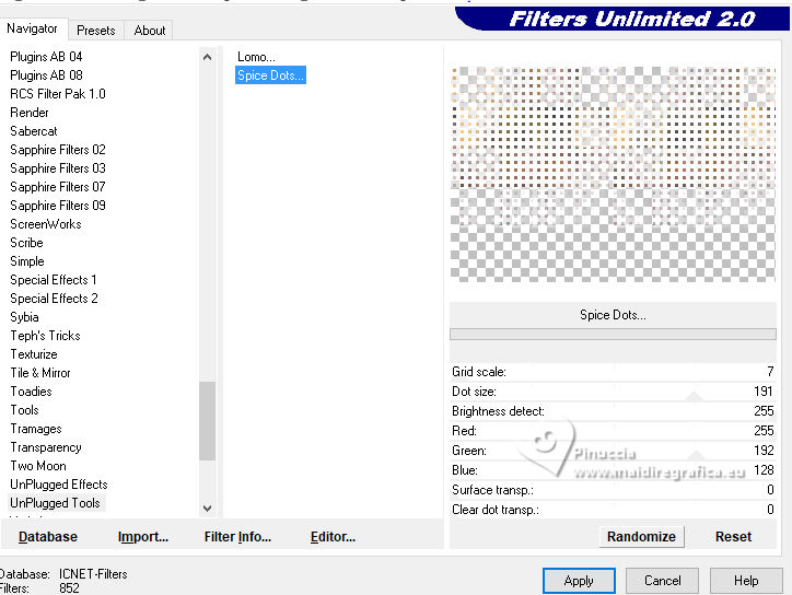10. Effets>Modules Externes>Filters Unlimited 2.0 - Unplugged Tools - Spice Dots.