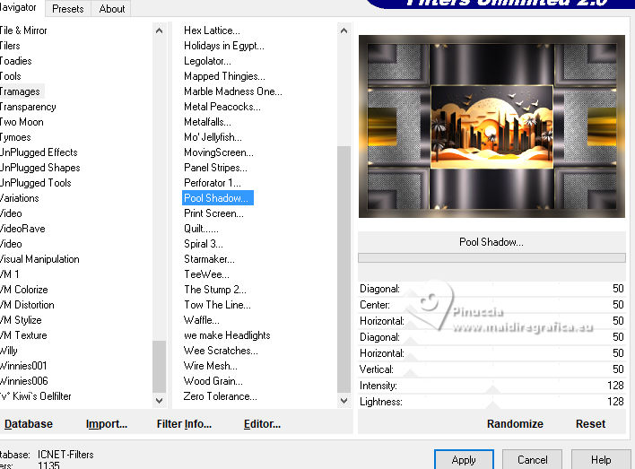 25. Effecs>Plugins>Filters Unlimited 2.0 - Tramages - Pool Shadow, default settings.