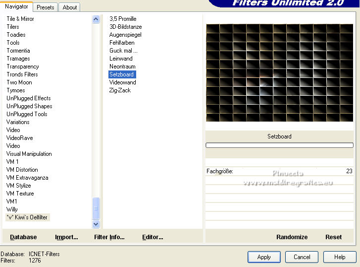 Effets>Modules Externes>Filters Unlimited 2.0 - "v" Kiwi's Oelfilter - Setzboard, par défaut