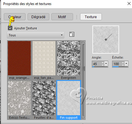 Ouvrir la palette de la couleur d'avant plan et sélectionner la texture Fin Support ou Corel_15_014