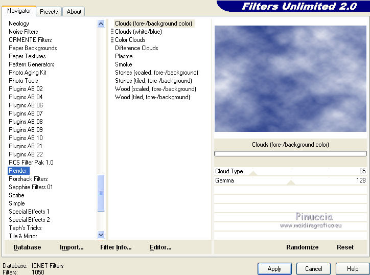 3. Effetti>Plugins>Filters Unlimited 2.0 - Render - Cloud(fore-/background color), con i settaggi standard.