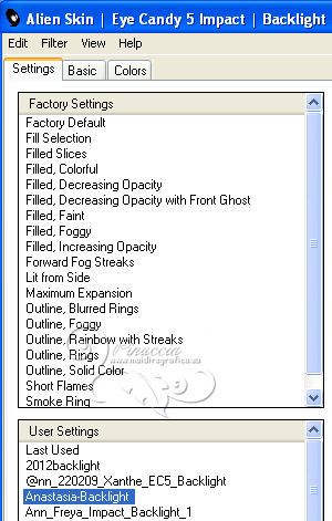 Metti il preset nella cartella del filtro Alien Skin Eye Candy 5 Impact>Settings>Backlight.