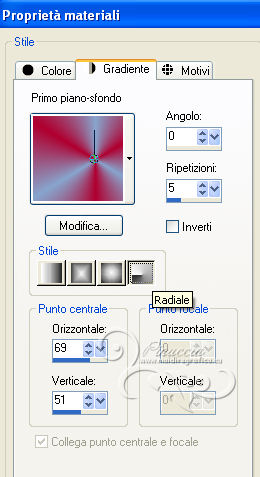 Passa il colore di primo piano a Gradiente, stile Radiale, con i seguenti settaggi.