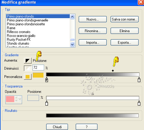 Attenzione: Quando si modifica il gradiente e si chiude, appare la finestra che il gradiente è modificato e la domanda se salvare o no. Non bisogna rispondere sì, perchè in questo caso si modifica il gradiente standard di primo piano/sfondo (la prima volta che mi è successo, non sono più riuscita a ripristinarlo e ho dovuto disinstallare e reinstallare PSP).