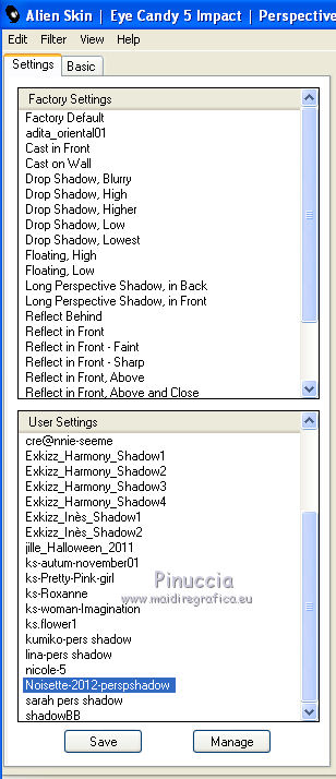 Metti il preset Noisette-2012-perspshadow nella cartella del filtro Alien Skin Eye Candy 5 Impact>Settings>Shadow (doppio clic sul file e il preset sarà automaticamente installato).