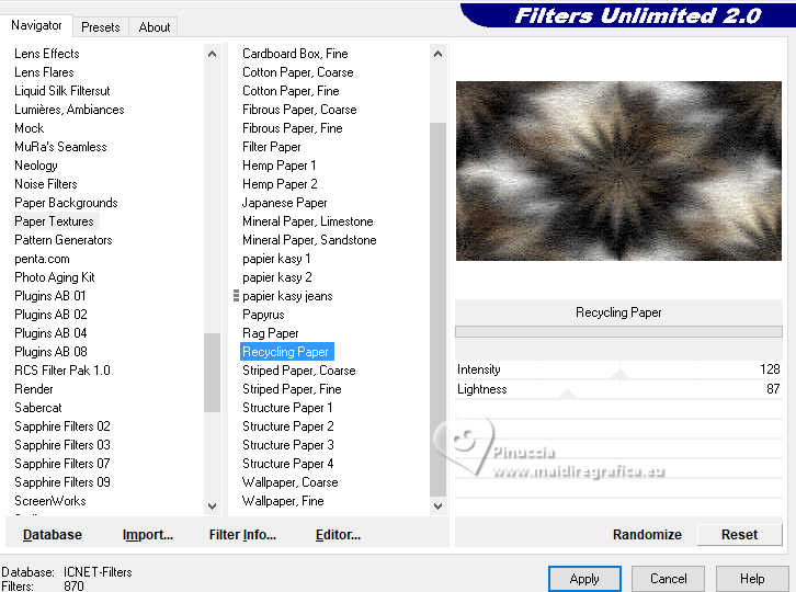 8. Effetti>Plugins>Filters Unlimited 2.0 - Paper Tectures - Recycling Paper, con i settaggi standard.