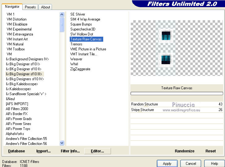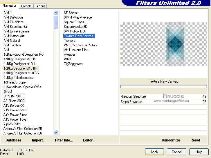 14. Effetti>Plugins>Filters Unlimited 2.0 - &<Bkg Designer sf10III> - Texture Raw Canvas.