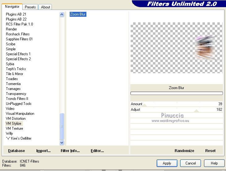 Effetti>Plugins>VM Toolbox - Zoom Blur. se non visualizzi l'Effetto nella lista del filtro, importalo in Filters Unlimited.