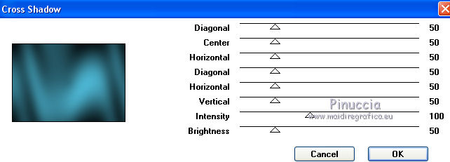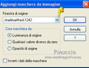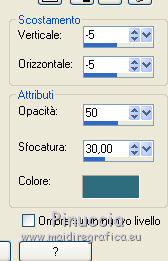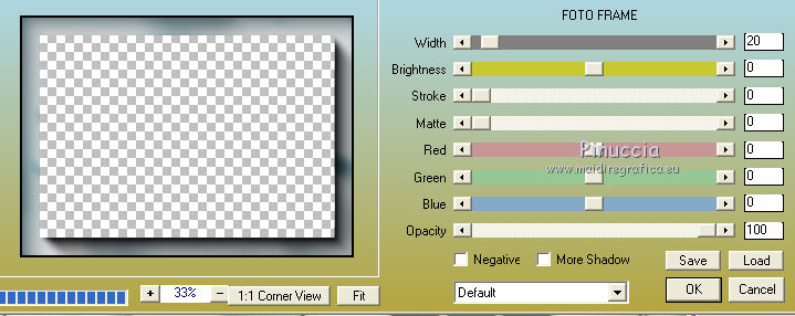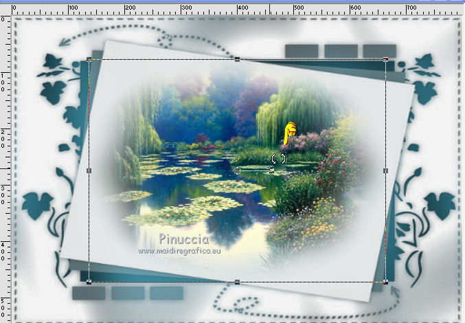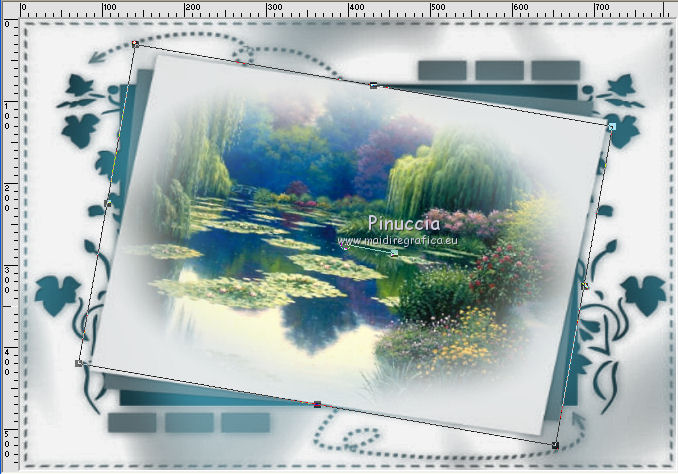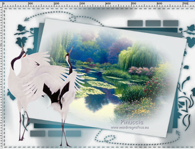qui puoi trovare qualche risposta ai tuoi dubbi. Se l'argomento che ti interessa non è presente, ti prego di segnalarmelo. Questo tutorial è stato tradotto con CorelX, ma può essere realizzato anche con le altre versioni di PSP. Dalla versione X4, il comando Immagine>Rifletti è stato sostituito con Immagine>Capovolgi in orizzontale, e il comando Immagine>Capovolgi con Immagine>Capovolgi in verticale. Nelle versioni X5 e X6, le funzioni sono state migliorate rendendo disponibile il menu Oggetti. Con la nuova versione X7 sono tornati i comandi Rifletti e Capovolgi, ma con nuove differenze. Vedi la scheda sull'argomento qui Occorrente: Materiale qui Grazie per i tubes Gerry, Silvie e Yoka, per la maschera Sharlimar. (in questa pagina trovi i links ai loro siti). Filtri: se hai problemi con i filtri, consulta la mia sezione filtri qui Filters Unlimited 2.0 qui Graphics Plus - Cross Shadow qui AAA Frames - Foto Frame qui FM Tile Tools - Blend Emboss qui I filtri Graphics Plus si possono usare da soli o importati in Filters Unlimited (come fare vedi qui) Se un filtro fornito appare con questa icona Animation Shop qui ![]() Se stai usando altri colori, non esitare a sperimentare le modalità di miscelatura e le opacità dei livelli più adatte. Metti il pennello nella cartella Pennelli. Attenzione, il pennello è composto da due files che non devono essere separati. Vedi gli appunti sui pennelli qui Apri la maschera in PSP e minimizzala con il resto del materiale (tranne l'animazione che userai in Animation Shop. 1. Imposta il colore di primo piano con il colore #2e6d7e, e il colore di sfondo con il colore bianco #ffffff. ![]() 2. Apri una nuova immagine trasparente 800 x 550 pixels, e riempila con il colore di primo piano #2e6d7e.3. Effetti>Plugins>Graphics Plus - Cross shadow. ![]() 4. Livelli>Nuovo livello raster. Riempi con il colore bianco.5. Livelli>Nuovo livello maschera>Da immagine. Apri il menu sotto la finestra di origine e vedrai la lista dei files aperti. Seleziona la maschera Sharlimar 1242. ![]() Livelli>Unisci>Unisci gruppo. 6. Effetti>Plugins>FM Tile Tools - Blend Emboss, con i settaggi standard. ![]() Regola>Messa a fuoco>Metti a fuoco. 7. Effetti>Effetti 3D>Sfalsa ombra, colore nero. ![]() 8. Apri il misted del paesaggio e vai a Modifica>Copia. Torna al tuo lavoro e vai a Modifica>Incolla come nuovo livello. Regola>Messa a fuoco>Metti a fuoco. 9. Premi il tasto K per attivare lo strumento Puntatore ![]() se stai usando PSP 9 il tasto D per attivare lo strumento Deformazione ![]() e muovi il mouse e quando vedi le due frecce arrotondate ![]() ruota l'immagine verso destra per centrare il paesaggio al centro della maschera Quindi, usando i nodi laterali, sistema al meglio l'immagine, pressappoco come nell'esempio. ![]() Tasto M per deselezionare lo strumento. 10. Apri il tube degli uccelli e vai a Modifica>Copia. Torna al tuo lavoro e vai a Modifica>Incolla come nuovo livello. Immagine>Ridimensiona, al 65%, tutti i livelli non selezionato. Regola>Messa a fuoco>Metti a fuoco. Immagine>Rifletti. Sposta il tube in basso a sinistra.![]() 11. Livelli>Duplica. Cambia la modalità di miscelatura di questo livello in Moltiplica, e abbassa l'opacità al 55%. Livelli>Disponi>Sposta giù. Attiva il livello superiore. Effetti>Effetti 3D>Sfalsa ombra, colore di primo piano. ![]() 12. Livelli>Nuovo livello raster. Attiva lo strumento Pennello ![]() cerca e seleziona il pennello di Yoka, dimensione 327, ![]() e applica il pennello sul paesaggio, cliccando con il tasto destro del mouse, per usare il colore bianco di sfondo. 13. Immagine>Ruota per gradi - 10 gradi a destra. ![]() Regola>Messa a fuoco>Metti a fuoco. Effetti>Effetti 3D>Sfalsa ombra, colore nero. ![]() Abbassa l'opacità di questo livello all'85%. 14. Immagine>Aggiungi bordatura, 1 pixel, simmetriche, colore di primo piano #2e6d7e. Modifica>Copia 15. Immagine>Dimensioni tela - 902 x 652 pixels. ![]() 16. Attiva lo strumento Bacchetta magica ![]() e clicca nel bordo per selezionarlo. Modifica>Incolla nella selezione. 17. Regola>Sfocatura>Sfocatura gaussiana - raggio 10. ![]() 18. Selezione>Inverti. Effetti>Effetti 3D>Sfalsa ombra, colore nero. ![]() Ripeti l'Effetto Sfalsa ombra, cambiando verticale e orizzontale con -2. 19. Di nuovo Selezione>Inverti. Selezione>Innalza selezione a livello. 20. Effetti>Plugins>AAA Frames - Foto Frame. ![]() 21. Firma il tuo lavoro. 22. Immagine>Aggiungi bordatura, 1 pixel, simmetriche, colore blu di primo piano. Salva in formato jpg. Se vuoi animare il tuo lavoro Modifica>Copia. Apri Animation Shop e vai a Modifica>Incolla>Incolla come nuova animazione. Modifica>Duplica e ripeti finché non avrai un'animazione composta da 38 fotogrammi. Clicca sul primo fotogramma per selezionarlo e vai a Modifica>Seleziona tutto. Apri la gif nm_Butterfly_Anim, anche questa composta da 38 fotogrammi. Modifica>Seleziona tutto. Modifica>Copia. Attiva il tuo lavoro e vai a Modifica>Incolla>Incolla nel fotogramma selezionato. Posiziona la gif nel paesaggio. 23. Controlla il tuo lavoro cliccando su Visualizza e salva in formato gif.![]() Puoi scrivermi per qualsiasi motivo - problemi, dubbi, un link non funzionante - o anche soltanto per un saluto 18 Gennaio 2017 |