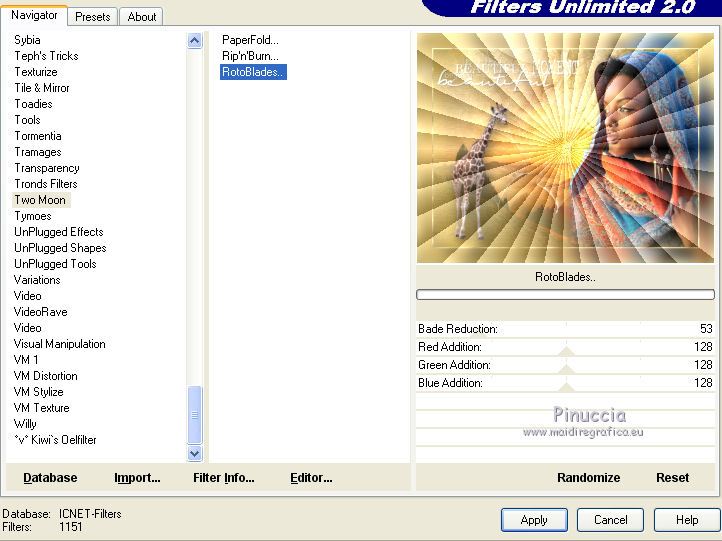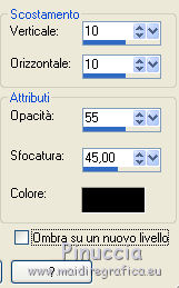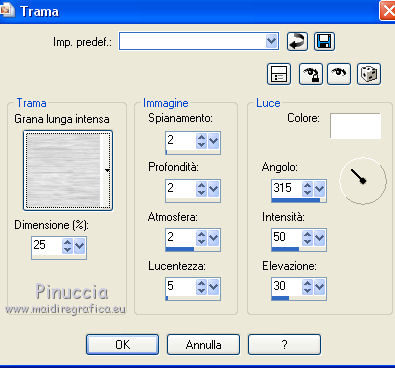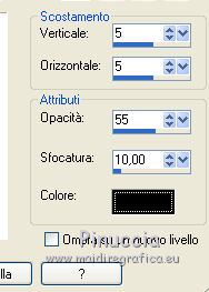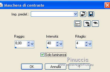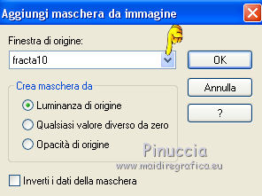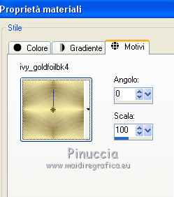 qui puoi trovare qualche risposta ai tuoi dubbi. Se l'argomento che ti interessa non è presente, ti prego di segnalarmelo. Questo tutorial è stato tradotto con CorelX, ma può essere realizzato anche con le altre versioni di PSP. Dalla versione X4, il comando Immagine>Rifletti è stato sostituito con Immagine>Capovolgi in orizzontale, e il comando Immagine>Capovolgi con Immagine>Capovolgi in verticale. Nelle versioni X5 e X6, le funzioni sono state migliorate rendendo disponibile il menu Oggetti. Con la nuova versione X7 sono tornati i comandi Rifletti e Capovolgi, ma con nuove differenze. Vedi la scheda sull'argomento qui Occorrente: Materiale qui Per i tube grazie Hebe, Ket e Gerry Filtri: se hai problemi con i filtri, consulta la mia sezione filtri qui Filters Unlimited 2.0 qui Graphics Plus - Cross Shadow qui Two Moon - Rotoblad qui I filtri Graphics Plus e Two Moon si possono usare da soli o importati in Filters Unlimited (come fare vedi qui) Se un filtro fornito appare con questa icona A volte si possono ottenere risultati differenti. ![]() Se stai usando altri colori, non esitare a sperimentare le modalità di miscelatura e le opacità dei livelli più adatte. Metti il pennello nella cartella Pennelli. Attenzione, il pennello è composto da due files che non devono essere separati. Vedi gli appunti sui pennelli qui La trama Langeernung-tief corrisponde alla trama standard in PSP Grana lunga intensa o Corel_15_017. Se non la trovi nel tuo PSP, metti quella fornita nella cartella Trame. Apri il fractale e il motivo oro in PSP e minimizzali con il resto del materiale. 1. Imposta il colore di primo piano con #cdac55, e il colore di sfondo con #fbfaf8. ![]() 2. Apri una nuova immagine trasparente 800 x 600 pixels, e riempila con il colore giallo di primo piano.3. Livelli>Nuovo livello raster. Riempi con il colore chiaro di sfondo.4. Livelli>Nuovo livello maschera>Da immagine. Apri il menu sotto la finestra di origine e vedrai la lista dei files aperti. Seleziona il frattale "fracta10", con i seguenti settaggi. ![]() Livelli>Unisci>Unisci gruppo. 5. Regola>Messa a fuoco>Accentua messa a fuoco. 6. Effetti>Effetti 3D>Sfalsa ombra. ![]() Cambia la modalità di miscelatura di questo livello in Luce netta e abbassa l'opacità al 72%. 7. Attiva il livello di sfondo Raster 1. Effetti>Effetti di trama>Trama - seleziona la trama Grana lunga intensa o Corel_15_017, con i seguenti settaggi: ![]() 8. Effetti>Plugins>Graphics Plus - Cross Shadow. ![]() 9. Sempre sul livello Raster 1: Selezione>Seleziona tutto. Livelli>Nuovo livello raster. Apri il tube del paesaggio e vai a Modifica>Copia. Torna al tuo lavoro e vai a Modifica>Incolla nella selezione. Selezione>Deseleziona. Cambia la modalità di miscelatura di questo livello in Moltiplica e abbassa l'opacità al 75%. 10. Livelli>Duplica. Cambia la modalità di misceltura di questo livello in Filtra e abbassa l'opacità al 66%. 11. Attiva il livello superiore. Apri il tube della donna e vai a Modifica>Copia. Torna al tuo lavoro e vai a Modifica>Incolla come nuovo livello. Immagine>Rifletti. Immagine>Ridimensiona, al 75%, tutti i livelli non selezionato. Regola>Messa a fuoco>Metti a fuoco. Sposta il tube a destra (vedi il mio esempio).12. Effetti>Effetti 3D>Sfalsa ombra. ![]() 13. Apri il tube della giraffa e vai a Modifica>Copia. Torna al tuo lavoro e vai a Modifica>Incolla come nuovo livello. Immagine>Rifletti Immagine>Ridimensiona, al 70%, tutti i livelli non selezionato. Regola>Messa a fuoco>Metti a fuoco. Effetti>Effetti 3D>Sfalsa ombra, con i settaggi precedenti. ![]() Sposta il tube a sinistra.14. Attiva lo strumento Pennello ![]() cerca e seleziona il pennello "beautiful moment", dimensione 500, ![]() e applicalo in alto a sinistra, cliccando con il tasto destro del mouse, per usare il colore chiaro di sfondo. 15. Effetti>Effetti 3D>Sfalsa ombra, colore nero. ![]() 16. Livelli>Unisci>Unisci tutto. Immagine>Aggiungi bordatura, 3 pixels, simmetriche, colore bianco #ffffff. Attiva lo strumento Bacchetta magica ![]() e clicca nel bordo bianco per selezionarlo. Passa il colore di primo piano a Motivi, cerca e seleziona, sotto la categoria Immagini aperte, il motivo oro ivy_goldfoilbk4. ![]() Riempi la selezione con il motivo oro.Selezione>Deseleziona. 17. Modifica>Copia. 18. Selezione>Seleziona tutto. Immagine>Aggiungi bordatura, 45 pixels, simmetriche, colore bianco #ffffff. Seleziona il bordo con la bacchetta magica ![]() Effetti>Effetti 3D>Sfalsa ombra. ![]() Ripeti l'Effetto Sfalsa ombra, cambiando verticale e orizzontale con -5 19. Selezione>Inverti. Modifica>Incolla nella selezione. 20. Regola>Sfocatura>Sfocatura gaussiana - raggio 15. ![]() 21. Effetti>Plugins>Two Moon - Rotoblade, con i settaggi standard. ![]() Selezione>Deseleziona. 22. Immagine>Aggiungi bordatura, 2 pixels, simmetriche, colore bianco #ffffff. Seleziona questo bordo con la bacchetta magica ![]() e riempilo con il motivo oro.Selezione>Deseleziona. 23. Regola>Messa a fuoco>Maschera di contrasto. ![]() 24. Firma il tuo lavoro e salva in formato jpg. Per questo esempio ho usato tubes di Suzi Sgai e FBR ![]() ![]() Puoi scrivermi per qualsiasi motivo - problemi, dubbi, un link non funzionante - o anche soltanto per un saluto 25 Gennaio 2016 |