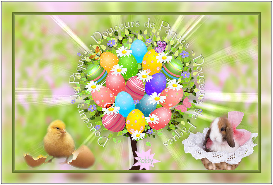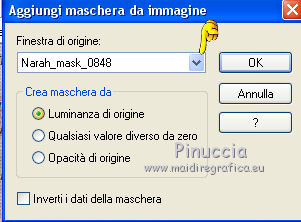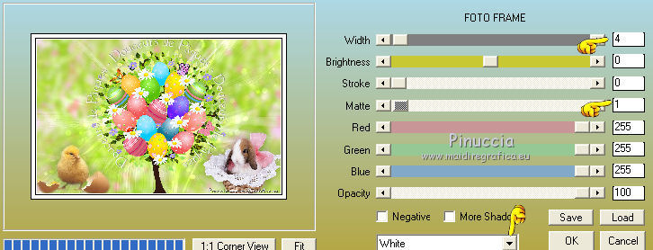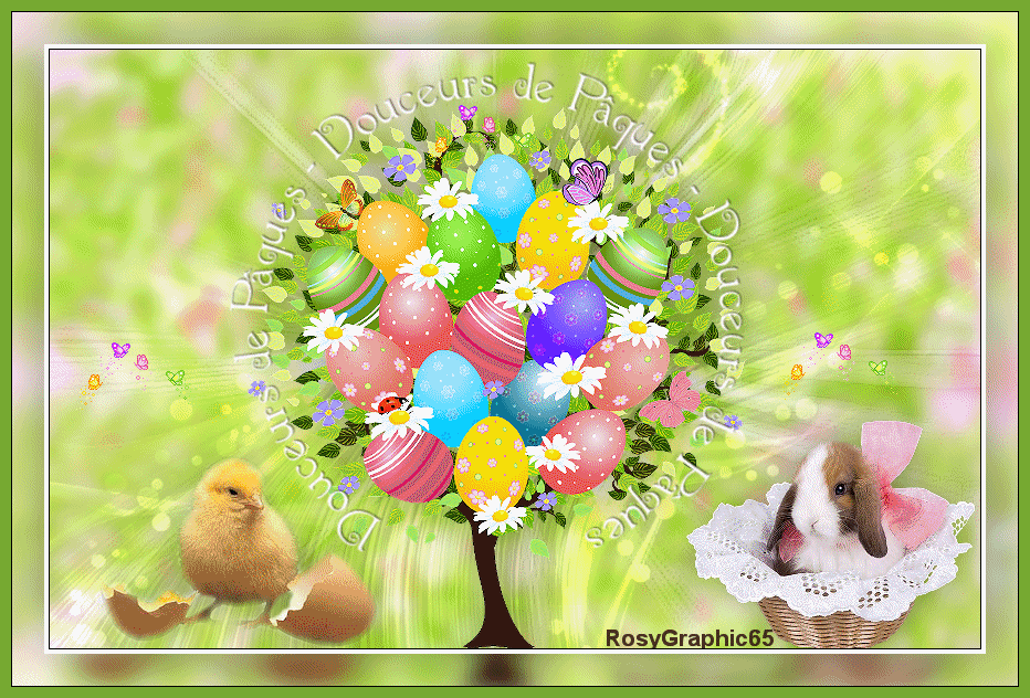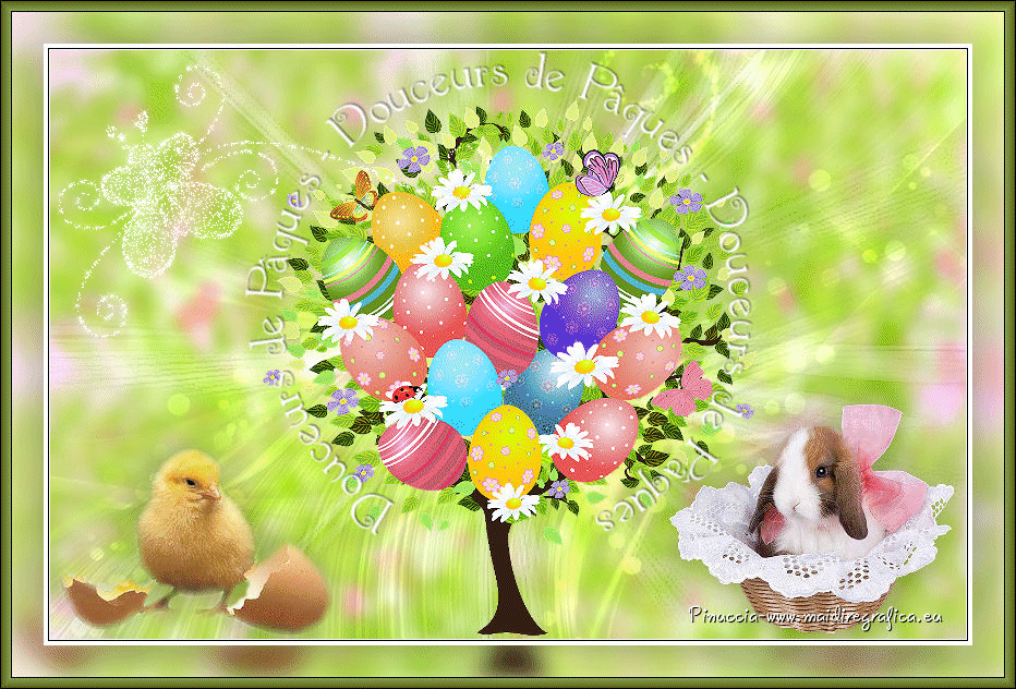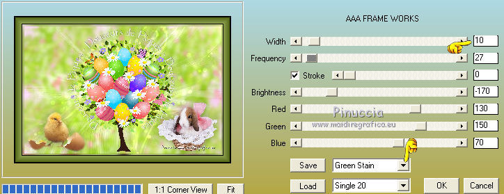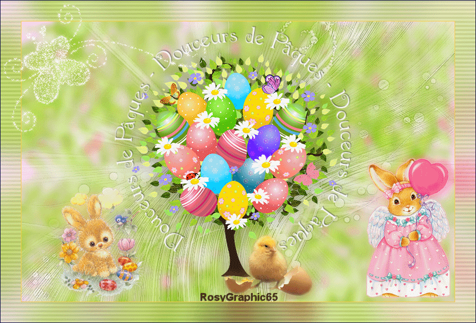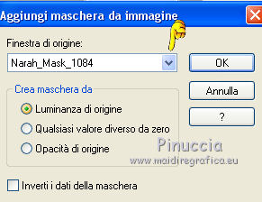 qui puoi trovare qualche risposta ai tuoi dubbi. Se l'argomento che ti interessa non è presente, ti prego di segnalarmelo. Questo tutorial è stato tradotto con CorelX, ma può essere realizzato anche con le altre versioni di PSP. Dalla versione X4, il comando Immagine>Rifletti è stato sostituito con Immagine>Capovolgi in orizzontale, e il comando Immagine>Capovolgi con Immagine>Capovolgi in verticale. Nelle versioni X5 e X6, le funzioni sono state migliorate rendendo disponibile il menu Oggetti. Con la nuova versione X7 sono tornati i comandi Rifletti e Capovolgi, ma con nuove differenze. Vedi la scheda sull'argomento qui Occorrente: Materiale qui Grazie per i tubes Graph-Sabine, Willeke e MMDesignz; per le maschere Narah. (in questa pagina trovi i links ai loro siti). Filtri: se hai problemi con i filtri, consulta la mia sezione filtri qui FM Tile Tools qui AAA Frames - Foto Frame qui Facoltativo: Animation Shop qui ![]() Se stai usando altri colori, non esitare a sperimentare le modalità di miscelatura e le opacità dei livelli più adatte. Apri le maschere in PSP e minimizzale con il resto del materiale. Imposta il colore di primo piano con #fdd4ff, e il colore di sfondo con il colore bianco #ffffff. 1. Apri una nuova immagine trasparente 850 x 550 pixels, 2. Selezione>Seleziona tutto. 3. Apri il tube dei rami fioriti Graph-Sabine Design-Tubes 558 e vai a Modifica>Copia. Torna al tuo lavoro e vai a Modifica>Incolla nella selezione. Selezione>Deseleziona. 4. Effetti>Effetti di immagine>Motivo unico. ![]() 5. Livelli>Duplica. Immagine>Capovolgi. Livelli>Unisci>Unisci giù. 6. Di nuovo Livelli>Duplica. Immagine>Ruota per gradi - 90 gradi a destra o a sinistra, come preferisci. 7. Ancora Livelli>Duplica. Immagine>Rifletti. Disponi correttamente le immagini.Livelli>Unisci>Unisci visibile. Regola>Sfocatura>Sfocatura gaussiana - raggio 6. 7. Livelli>Nuovo livello raster. Riempi con il colore di primo piano #fdd4ff.Livelli>Disponi>Porta sotto. Per facilitare il compito, nel materiale trovi questi due livelli già pronti per continuare. Se preferisci, apri il file "début du travail", e comincia il tutorial da qui. ![]() 8. Attiva il livello superiore. Livelli>Nuovo livello raster. Abbassa l'opacitù dello strumento Riempimento a 70, e riempi il livello con il colore bianco di sfondo.9. Livelli>Nuovo livello maschera>Da immagine. Apri il menu sotto la finestra di origine e vedrai la lista dei files aperti. Seleziona la maschera Narah_Mask 0848. ![]() Livelli>Unisci>Unisci gruppo. Effetti>Effetti di bordo>Aumenta. 10. Effetti>Plugins>FM Tile Tools - Blend Emboss, con i settaggi standard. ![]() 11. Effetti>Effetti 3D>Sfalsa ombra, colore nero. ![]() 12. per il mio esempio, ho aggiunto un nuovo livello e l'ho riempito con il colore bianco, lasciando l'opacità a 70 Livelli>Nuovo livello maschera>Da immagine. Apri il menu sotto la finestra di origine e seleziona la maschera Narah_mask 1084. ![]() Livelli>Unisci>Unisci gruppo. Effetti>Plugins>FM Tile Tools, con i settaggi standard. Regola>Messa a fuoco>Metti a fuoco. Effetti>Effetti 3D>Sfalsa ombra, con i settaggi precedenti. Cambia la modalità di miscelatura di questo livello in Indebolisci, e abbassa l'opacità al 40%. 13. Apri il tube dell'albero Graph-Sabine Design-arbre Tubes 552, e vai a Modifica>Copia. Torna al tuo lavoro e vai a Modifica>Incolla come nuovo livello. Immagine>Ridimensiona, al 55%, tutti i livelli non selezionato. Regola>Messa a fuoco>Metti a fuoco. Sposta il tube un po' più in basso.Effetti>Effetti 3D>Sfalsa ombra, colore nero. ![]() 14. Apri il wordart e vai a Modifica>Copia. Torna al tuo lavoro e vai a Modifica>Incolla come nuovo livello. Spostalo un po' più in alto, vedi il mio esempio.Effetti>Effetti 3D>Sfalsa ombra, con i settaggi precedenti. 15. Apri il tube del coniglio WS1-AstiRus EasterGift, e vai a Modifica>Copia. Torna al tuo lavoro e vai a Modifica>Incolla come nuovo livello. Immagine>Ridimensiona,, al 50%, tutti i livelli non selezionato. Spostalo in basso a destra.Regola>Messa a fuoco>Metti a fuoco. Effetti>Effetti 3D>Sfalsa ombra, con i settaggi precedenti. 16. Apri il tube del pulcino MMCreation_0130309_Ostern, e vai a Modifica>Copia. Torna al tuo lavoro e vai a Modifica>Incolla come nuovo livello. Immagine>Ridimensiona,, al 70%, tutti i livelli non selezionato. Spostalo in basso a sinistra.Regola>Messa a fuoco>Metti a fuoco. Effetti>Effetti 3D>Sfalsa ombra, con i settaggi precedenti. 17. Firma il tuo lavoro su un nuovo livello. 18. Livelli>Unisci>Unisci tutto. Immagine>Aggiungi bordatura, 1 pixel, simmetriche, colore bianco. 19. Modifica>Copia. 20. Selezione>Seleziona tutto. Immagine>Aggiungi bordatura, 40 pixels, simmetriche, con un colore qualsiasi. 21. Selezione>Inverti. Modifica>Incolla nella selezione. 22. Regola>Sfocatura>Sfocatura gaussiana - raggio 10. ![]() 23. Di nuovo Selezione>Inverti. Effetti>Effetti 3D>Sfalsa ombra, con i settaggi precedenti. ![]() 24. Ancora Selezione>Inverti. Effetti>Plugins>AAA Frames - Frame Work, prima seleziona i preset e poi cambia Width con 10. ![]() 25. Ancora una volta Selezione>Inverti. Effetti>Plugins>AAA Frames - Foto Frame. ![]() Selezione>Deseleziona. 26. Se non vuoi realizzare l'animazione, hai finito, e puoi salvare il lavoro in formato jpg. 27. Se vuoi aggiungere una piccola animazione, nel materiale trovi due gif. Copia il tuo lavoro. Apri Animation Shop e vai a Modifica>Incolla>Incolla come nuova animazione. Modifica>Duplica e ripeti finché non avrai una animazione composta da: 3 fotogrammi se vuoi usare il bling 8 fotogrammi se vuoi usare la gif delle farfalline. Clicca sul primo fotogramma per selezionarlo. Selezione>Seleziona tutto. Apri la gif scelta. Selezione>Seleziona tutto. Attiva il tuo lavoro e vai a Modifica>Incolla>Incolla nel fotogramma selezionato. Posiziona l'animazione a tuo piacimento. Controlla il risultato cliccando su Visualizza e salva in formato gif.![]() ![]() Le vostre versioni. Grazie ![]() ![]() Rosy ![]() Robby ![]() Puoi sc