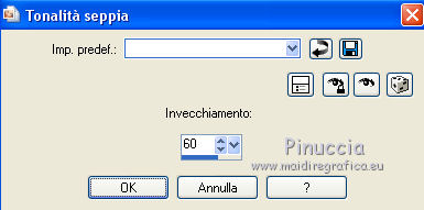 qui puoi trovare qualche risposta ai tuoi dubbi. Se l'argomento che ti interessa non è presente, ti prego di segnalarmelo. Questo tutorial è stato tradotto con CorelX, ma può essere realizzato anche con le altre versioni di PSP. Dalla versione X4, il comando Immagine>Rifletti è stato sostituito con Immagine>Capovolgi in orizzontale, e il comando Immagine>Capovolgi con Immagine>Capovolgi in verticale. Nelle versioni X5 e X6, le funzioni sono state migliorate rendendo disponibile il menu Oggetti. Con la nuova versione X7 sono tornati i comandi Rifletti e Capovolgi, ma con nuove differenze. Vedi la scheda sull'argomento qui Occorrente: Materiale qui Per i tube grazie Bibiche, Irène e Nikita. Per il pennello grazie Lila. Filtri: se hai problemi con i filtri, consulta la mia sezione filtri qui Xero - Porcelain qui Simple - Quick Tile qui ![]() Se stai usando altri colori, non esitare a sperimentare le modalità di miscelatura e le opacità dei livelli più adatte. Nelle ultime versioni di PSP non c'è il gradiente di primo piano/sfondo (Corel_06_029) Trovi i gradienti delle versioni precedenti qui Metti il pennello nella cartella Pennelli. Attenzione, il pennello è composto da due files che non devono essere separati. Vedi gli appunti sui pennelli qui 1. Imposta il colore di primo piano con #a89c8a, e il colore di sfondo con #f0dba2. Passa il colore di primo piano a Gradiente di primo piano/sfondo, stile Radiale. ![]() 2. Apri una nuova immagine trasparente 700 x 500 pixels, e riempila con il gradiente.Regola>Sfocatura>Sfocatura gaussiana, raggio 30. ![]() 3. Selezione>Seleziona tutto. Livelli>Nuovo livello raster. Apri il tube "soleil couchant" e vai a Modifica>Copia. Torna al tuo lavoro e vai a Modifica>Incolla nella selezione. Sposta il tube a sinistra.Mantieni selezionato. 4. Livelli>Nuovo livello raster. Apri il tube di Bibiche e vai a Modifica>Copia. Torna al tuo lavoro e vai a Modifica>Incolla nella selezione. Spostalo un po' più a destra.Abbassa l'opacità di questo livello al 53%. ![]() Mantieni ancora selezionato. 5. Livelli>Nuovo livello raster. Apri il tube degli uccelli e vai a Modifica>Copia. Torna al tuo lavoro e vai a Modifica>Incolla nella selezione. Selezione>Deseleziona. Cambia la modalità di miscelatura di questo livello in Luminanza (esistente) e abbassa l'opacità al 47%. Disponi gli uccelli a tuo piacimento, cancellandone alcuni, e/o duplicandone altri, e giocando con la dimensione e l'opacità. Per orientarti, vedi l'esempio finale. 6. Apri il tube della coppia e vai a Modifica>Copia. Torna al tuo lavoro e vai a Modifica>Incolla come nuovo livello. Immagine>Ridimensiona, all'80%, tutti i livelli non selezionato. Spostalo in basso a destra.Cambia la modalità di miscelatura di questo livello in Moltiplica, e abbassa l'opacità al 70%. Effetti>Effetti di foto>Tonalità Seppia. ![]() Livelli>Duplica. Cambia la modalità di miscelatura di questo livello in Colore, e abbassa l'opacità al 56%. ![]() 7. Apri il tube della donna con la rosa e vai a Modifica>Copia. Torna al tuo lavoro e vai a Modifica>Incolla come nuovo livello. Eventualmente, applica la maschera 20-20. Immagine>Ridimensiona, all'85%, tutti i livelli non selezionato. Sposta il tube in alto a sinistra.Livelli>Duplica. Cambia la modalità di miscelatura del livello originale in Luce netta. Sul livello della copia: Effetti>Plugins>Xero - Porcelain. ![]() 8. Controlla che tutto sia a posto e Livelli>Unisci>Unisci tutto. 9. Modifica>Copia. 10. Immagine>Aggiungi bordatura, 2 pixels, simmetriche, #644931. Immagine>Aggiungi bordatura, 35 pixels, simmetriche, #ffffff. Immagine>Aggiungi bordatura, 2 pixels, simmetriche, #644931. 11. Attiva lo strumento Bacchetta magica ![]() e clicca nel bordo bianco per selezionarlo. Modifica>Incolla nella selezione. 12. Effetti>Plugins>Simple - Quick Tile. 13. Selezione>Inverti. Effetti>Effetti 3D>Sfalsa ombra, colore nero. ![]() Ripeti l'Effetto Sfalsa ombra, cambiando verticale e orizzontale con -1. Selezione>Deseleziona. 14. Livelli>Nuovo livello raster. Imposta il colore di primo piano con #644931. Attiva lo strumento Pennello ![]() cerca e seleziona il pennello jerevaisdenous, dimensione 427 ![]() Applica il pennello in basso a sinistra, cliccando con il tasto sinistro del mouse, per usare il colore di primo piano #644931. Effetti>Effetti 3D>Sfalsa ombra, colore nero. ![]() 15. Firma il tuo lavoro su un nuovo livello. Livelli>Unisci>Unisci tutto. Immagine>Ridimensiona, al 92%, tutti i livelli selezionato. Salva in formato jpg. 16. Se vuoi creare l'animazione: Modifica>Copia. Apri Animation Shop e vai a Modifica>Incolla>Incolla come nuova animazione. Modifica>Duplica e ripeti per avere una animazione composta da 3 fotogrammi. Clicca sul primo fotogramma per selezionarlo e vai a Modifica>Seleziona tutto. 17. Apri la gif "bling03 SN", anche questa composta da tre fotogrammi (cancella il fotogramma nero). Modifica>Seleziona tutto. Modifica>Copia. Attiva il tuo lavoro e vai a Modifica>Incolla>Incolla nel fotogramma selezionato. Posiziona la gif dove preferisci. Controlla il tuo lavoro cliccando su Visualizza e salva in formato gif.![]() Puoi scrivermi per qualsiasi motivo - problemi, dubbi, un link non funzionante - o anche soltanto per un saluto 12 Febbraio 2016 |