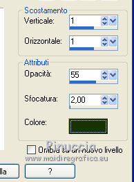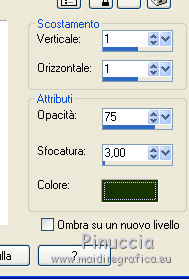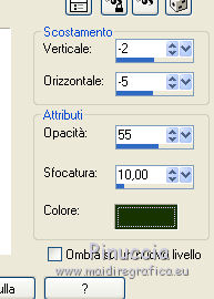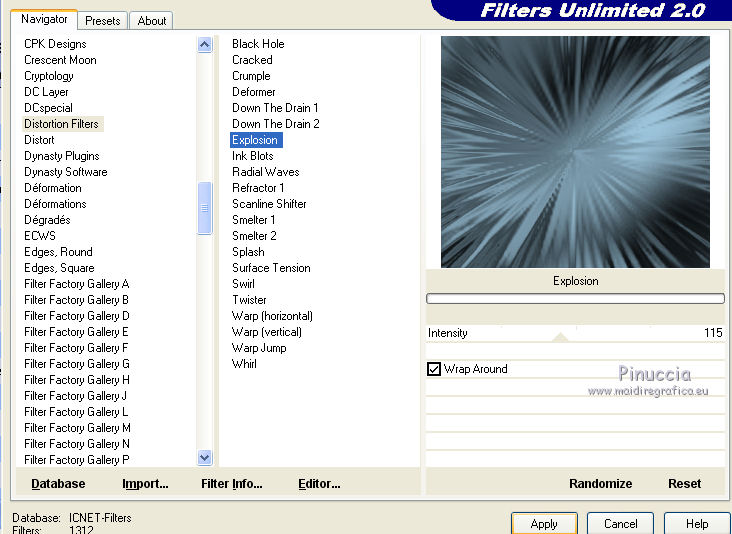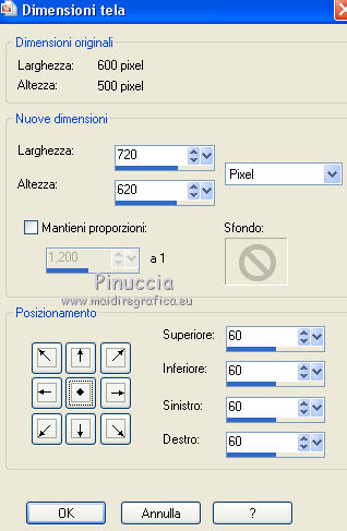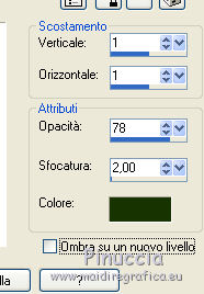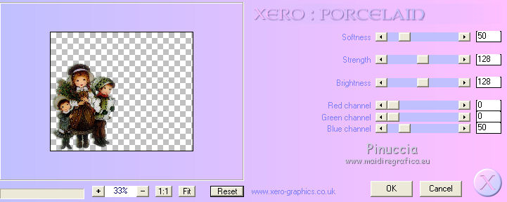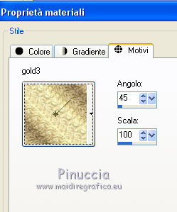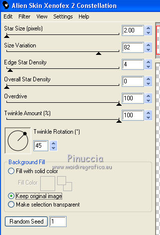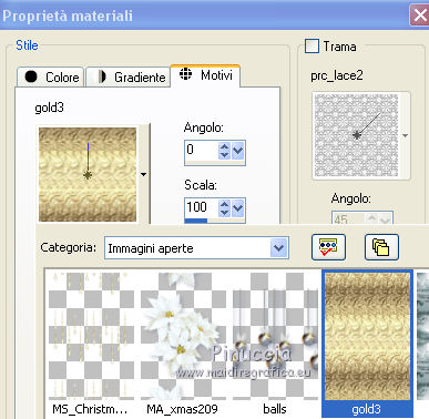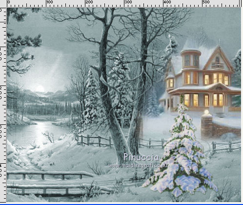 qui puoi trovare qualche risposta ai tuoi dubbi. Se l'argomento che ti interessa non è presente, ti prego di segnalarmelo. Questo tutorial è stato tradotto con CorelX, ma può essere realizzato anche con le altre versioni di PSP. Dalla versione X4, il comando Immagine>Rifletti è stato sostituito con Immagine>Capovolgi in orizzontale, e il comando Immagine>Capovolgi con Immagine>Capovolgi in verticale. Nelle versioni X5 e X6, le funzioni sono state migliorate rendendo disponibile il menu Oggetti. Con la nuova versione X7 sono tornati i comandi Rifletti e Capovolgi, ma con nuove differenze. Vedi la scheda sull'argomento qui Occorrente: Materiale qui Filtri: se hai problemi con i filtri, consulta la mia sezione filtri qui Filters Unlimited 2.0 qui Alien Skin Xenofex 2 - Constellation qui Graphics Plus - Cross Shadow qui Xero - Porcelain qui I filtri Graphics Plus si possono usare da soli o importati in Filters Unlimited (come fare vedi qui) Se un filtro fornito appare con questa icona Animation Shop qui ![]() Se stai usando altri colori, non esitare a sperimentare le modalità di miscelatura e le opacità dei livelli più adatte. Nelle ultime versioni di PSP non c'è il gradiente di primo piano/sfondo (Corel_06_029) Puoi usare i gradienti delle versioni precedenti. Trovi qui i gradienti Corel X. Apri il font e minimizzalo. Lo troverai nella lista dei font disponibili quando ti servirà. Con i nuovi sistemi operativi questo non è più possibile. Per usare un font, occorre copiarlo nella cartella Font di Windows. Apri il motivo oro in PSP e minimizzalo con il resto del materiale. 1. Imposta il colore di primo piano con #ffffff, e il colore di sfondo con #b1bfc1. ![]() Passa il colore di primo piano a Gradiente di primo piano/sfondo, stile Lineare. ![]() 2. Apri una nuova immagine trasparente 600 x 500 pixels, e riempila con il gradiente.3. Regola>Sfocatura>Sfocatura gaussiana - raggio 20. ![]() 4. Apri l'immagine del paesaggio e vai a Modifica>Copia. Torna al tuo lavoro e vai a Modifica>Incolla come nuovo livello. Immagine>Ridimensiona, al 70%, tutti i livelli non selezionato. Regola>Messa a fuoco>Metti a fuoco. Regola>Tonalità e saturazione>Viraggio. ![]() 5. Apri il tube della casa noel11-tine, e vai a Modifica>Copia. Torna al tuo lavoro e vai a Modifica>Incolla come nuovo livello. Immagine>Ridimensiona, al 122%, tutti i livelli non selezionato. Abbassa l'opacità di questo livello al 92%. Livelli>Duplica, e attiva il livello sottostante dell'originale. Regola>Sfocatura>Sfocatura gaussiana - raggio 10. ![]() Abbassa l'opacità di questo livello al 70%. 6. Apri il tube dell'albero di natale e vai a Modifica>Copia. Torna al tuo lavoro e vai a Modifica>Incolla come nuovo livello. Immagine>Ridimensiona, al 115%, tutti i livelli non selezionato. Regola>Messa a fuoco>Metti a fuoco. Spostalo in basso a destra.![]() Effetti>Effetti 3D>Sfalsa ombra, colore nero. ![]() 7. Apri il tube MS_Christmas_raindrops e vai a Modifica>Copia. Torna al tuo lavoro e vai a Modifica>Incolla come nuovo livello. Spostalo in alto contro il bordo.Abbassa l'opacità di questo livello al 50%. 8. Apri il tube dei bambini e vai a Modifica>Copia. Torna al tuo lavoro e vai a Modifica>Incolla come nuovo livello. Immagine>Ridimensiona, all'80%, tutti i livelli non selezionato. Sposta il tube un po' più a sinistra.Effetti>Effetti 3D>Sfalsa ombra, colore nero. ![]() Effetti>Plugins>Xero - Porcelain. ![]() 9. Firma il tuo lavoro. 10. Attiva il livello inferiore. Selezione>Seleziona tutto. Immagine>Ritaglia la selezione. 11. Attiva il livello superiore. Livelli>Nuovo livello raster. Selezione>Seleziona tutto. 12. Passa il colore di sfondo a Motivi e cerca, sotto la categoria Immagini aperte, il motivo oro gold3. ![]() Seleziona il motivo; questi i settaggi che ho scelto per il mio esempio ![]() Riempi la selezione con il motivo oro.Selezione>Modifica>Contrai - 1 pixels. Premi sulla tastiera il tasto CANC ![]() Selezione>Deseleziona. 13. Attiva nuovamente il livello di sfondo. Immagine>Dimensioni tela - 720 x 620 pixels. ![]() 14. Livelli>Nuovo livello raster. Livelli>Disponi>Sposta giù. Imposta il colore di primo piano con #465862, e riempi il livello con questo colore.Effetti>Plugins>Graphics Plus - Cross shadow, con i settaggi standard. ![]() Effetti>Plugins>Filters Unlimited 2.0 - Distortion Filters - Explosion. ![]() 15. Apri il tube delle palline e vai a Modifica>Copia. Torna al tuo lavoro e vai a Modifica>Incolla come nuovo livello. Spostalo in alto a destra.Effetti>Effetti 3D>Sfalsa ombra, colore nero. ![]() 16. Apri MA_xmas209 e vai a Modifica>Copia. Torna al tuo lavoro e vai a Modifica>Incolla come nuovo livello. Spostalo nell'angolo in basso a sinistra.Livelli>Duplica. Immagine>Rifletti. Immagine>Ridimensiona, all'80%, tutti i livelli non selezionato. Posiziona correttamente il tube in basso a destra.Su entrambi i livelli: Effetti>Effetti 3D>Sfalsa ombra, colore nero. ![]() 17. Attiva lo strumento Testo , font Mea Culpacolore di sfondo motivo oro e scrivi il tuo testo. Livelli>Converti in livello raster. Effetti>Effetti 3D>Sfalsa ombra, colore nero. ![]() 18. Attiva il livello superiore. Livelli>Nuovo livello raster. Riempi con il motivo oro.Selezione>Seleziona tutto. Selezione>Modifica>Contrai - 2 pixels. Premi sulla tastiera il tasto CANC. Selezione>Deseleziona. 19. Attiva il livello delle gocce d'acqua. Effetti>Plugins>Alien Skin Xenofex 2 - Constellation. ![]() 20. Modifica>Copia Unione. Apri Animation Shop e vai a Modifica>Incolla>Incolla come nuova animazione. 21. Torna in PSP. Modifica>Annulla azione Constellation. Ripeti l'Effetto Constellation, clicca una volta su Random Seed e ok. Modifica>Copia Unione. Torna in Animation Shop e vai a Modifica>Incolla>Incolla dopo il fotogramma corrente. 22. Di nuovo in PSP. Modifica>Annulla azione Constellation. Ripeti l'Effetto Constellation, clicca su Random Seed e ok. Modifica>Copia Unione. In Animation Shop: Modifica>Incolla>Incolla dopo il fotogramma corrente. 23. C