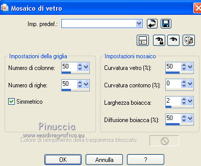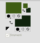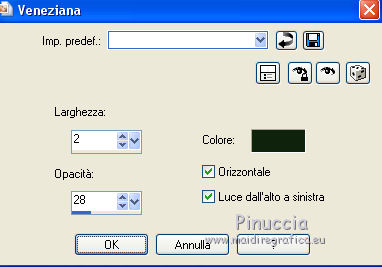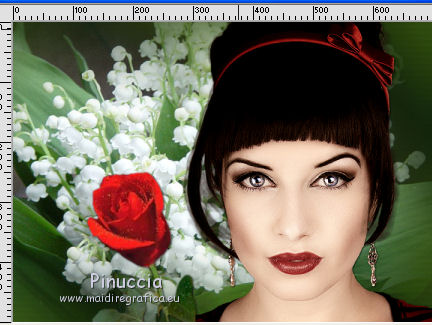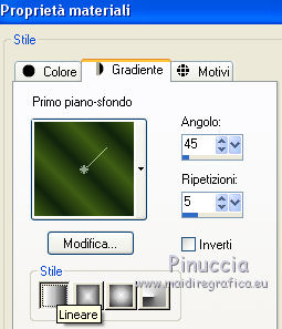 qui puoi trovare qualche risposta ai tuoi dubbi. Se l'argomento che ti interessa non è presente, ti prego di segnalarmelo. Questo tutorial è stato tradotto con CorelX, ma può essere realizzato anche con le altre versioni di PSP. Dalla versione X4, il comando Immagine>Rifletti è stato sostituito con Immagine>Capovolgi in orizzontale, e il comando Immagine>Capovolgi con Immagine>Capovolgi in verticale. Nelle versioni X5 e X6, le funzioni sono state migliorate rendendo disponibile il menu Oggetti. Con la nuova versione X7 sono tornati i comandi Rifletti e Capovolgi, ma con nuove differenze. Vedi la scheda sull'argomento qui Occorrente: Materiale qui ![]() Se stai usando altri colori, non esitare a sperimentare le modalità di miscelatura e le opacità dei livelli più adatte. Nelle ultime versioni di PSP non c'è il gradiente di primo piano/sfondo (Corel_06_029) Puoi usare i gradienti delle versioni precedenti. Trovi qui i gradienti Corel X. 1. Imposta il colore di primo piano con #405e14, e il colore di sfondo con #11230d. ![]() 2. Passa il colore di primo piano a Gradiente di primo piano/sfondo, stile Lineare. ![]() 3. Apri una nuova immagine trasparente 700 x 500 pixels, e riempila con il gradiente.Regola>Sfocatura>Sfocatura gaussiana - raggio 30. ![]() 4. Effetti>Effetti di trama>Veneziana - colore di sfondo. ![]() 5. Apri il tube dei mughetti e vai a Modifica>Copia. Torna al tuo lavoro e vai a Modifica>Incolla come nuovo livello. Spostalo un po' più a sinistra.6. Apri il tube della donna e vai a Modifica>Copia. Torna al tuo lavoro e vai a Modifica>Incolla come nuovo livello. Immagine>Ridimensiona, all'80%, tutti i livelli non selezionato. Spostalo a destra.Regola>Messa a fuoco>Metti a fuoco. 7. Effetti>Effetti 3D>Sfalsa ombra, colore nero. ![]() 8. Apri il tube della rosa e vai a Modifica>Copia. Torna al tuo lavoro e vai a Modifica>Incolla come nuovo livello. Immagine>Ridimensiona, al 94%, tutti i livelli non selezionato. Immagine>Ruota per gradi - 15 gradi a sinistra. ![]() Sposta il tube a sinistra.![]() 9. Effetti>Effetti 3D>Sfalsa ombra, con i settaggi precedenti. ![]() 10. Immagine>Aggiungi bordatura, 2 pixels, simmetriche, colore di sfondo #11230d. Immagine>Aggiungi bordatura, 30 pixels, simmetriche, colore bianco. Immagine>Aggiungi bordatura, 2 pixels, simmetriche, colore di sfondo #11230d. 11. Attiva lo strumento Bacchetta magica ![]() e clicca nel bordo di 30 pixels per selezionarlo. 12. Imposta il colore di sfondo con il colore bianco #ffffff e mantieni il nuovo gradiente che si creerà ![]() Riempi la selezione con il gradiente.13. Effetti>Effetti di trama>Mosaico di vetro. ![]() Selezione>Deseleziona. 14. Attiva lo strumento Testo ![]() e scrivi - con il colore bianco - "Premier Mai", "bonheur", o quello che preferisci. Livelli>Converti in livello raster. Effetti>Effetti 3D>Sfalsa ombra, con i settaggi precedenti. 15. Firma il tuo lavoro. Livelli>Unisci>Unisci tutto e salva in formato jpg. Il tube di questo esempio è di Mina ![]() ![]() Puoi scrivermi per qualsiasi motivo - problemi, dubbi, un link non funzionante - o anche soltanto per un saluto 29 Aprile 2017 |